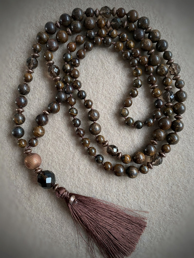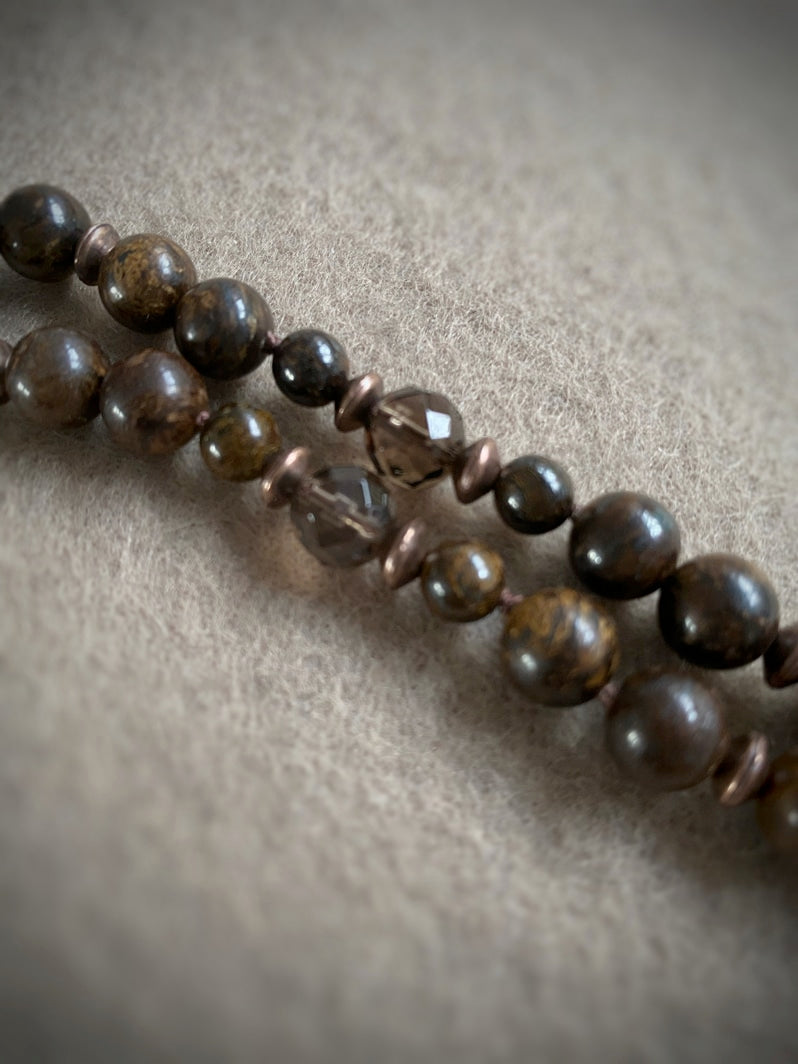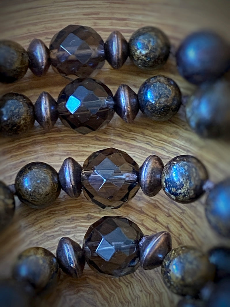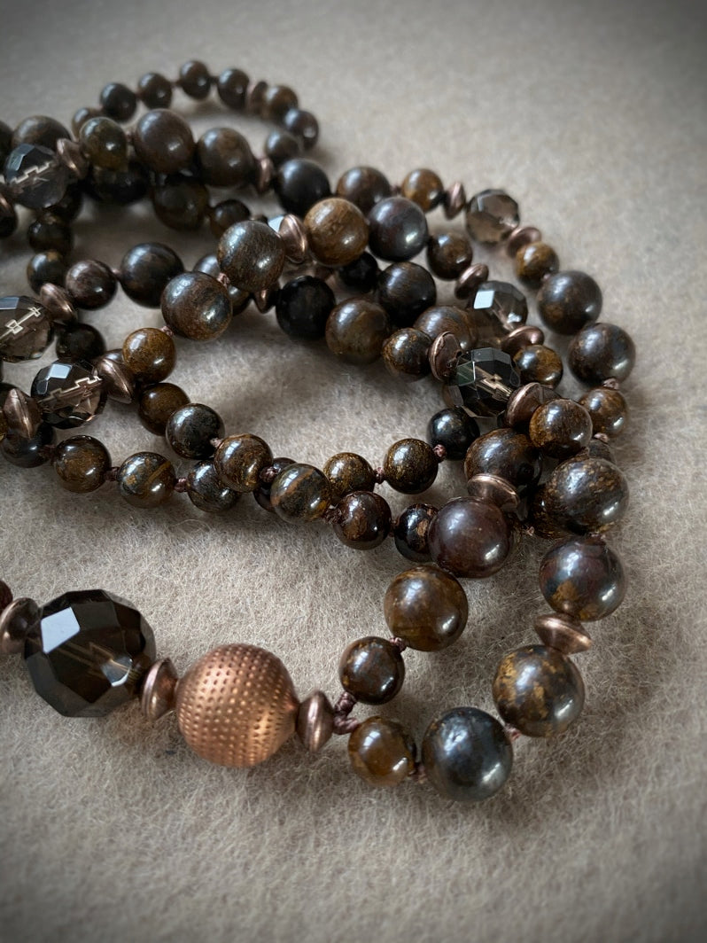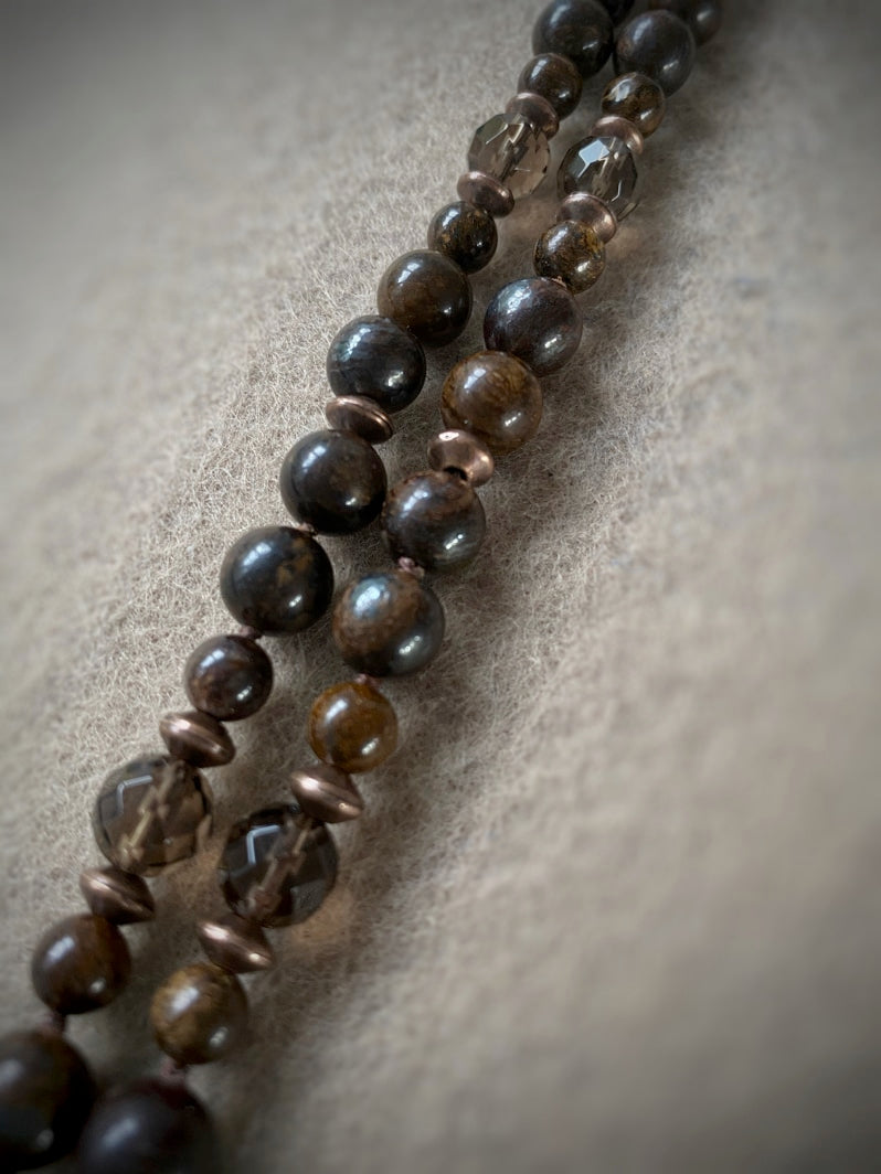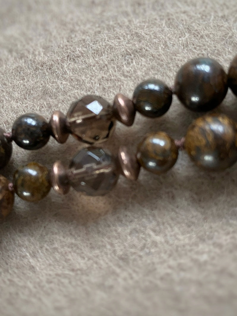 Abschluss: Facettierter Rauchquarz 10mm, Kupferkugel, braune Seidenquaste