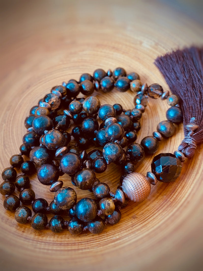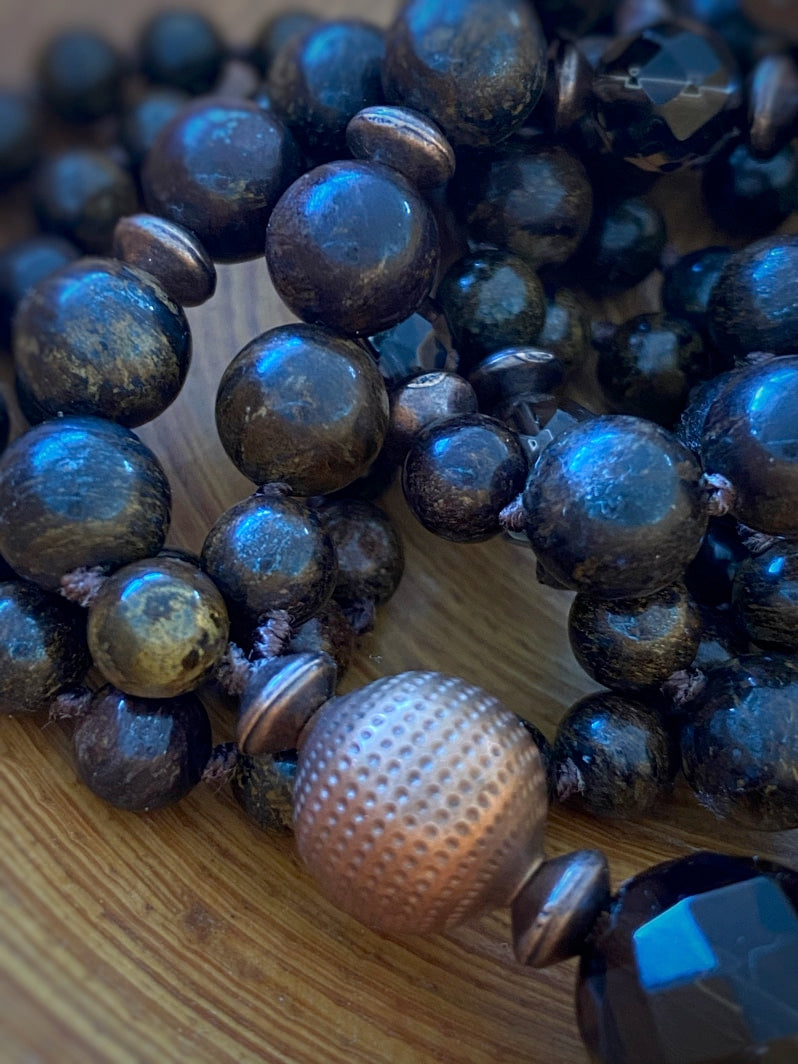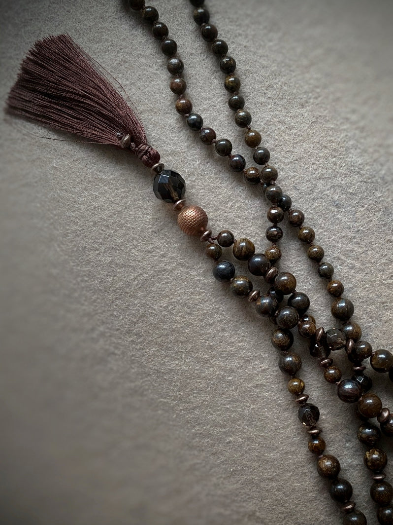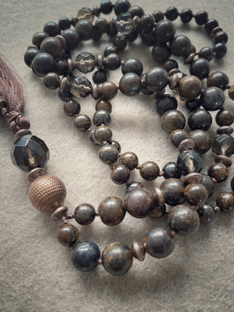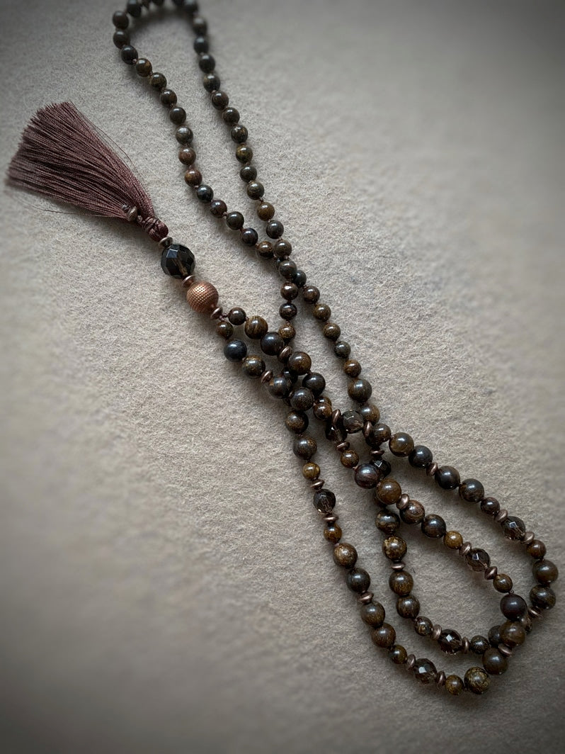 Abschluss: Facettierter Rauchquarz 10mm, Kupferkugel, braune Seidenquaste