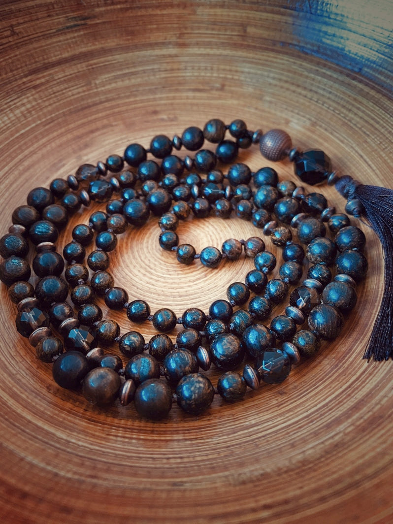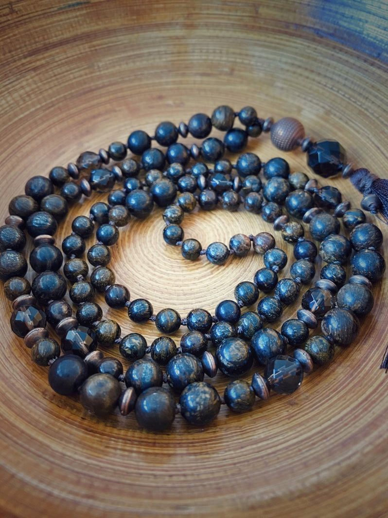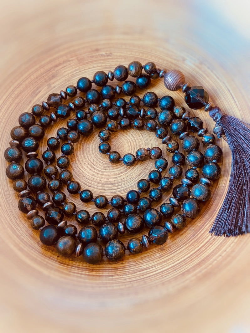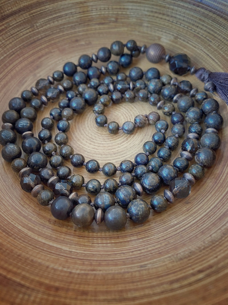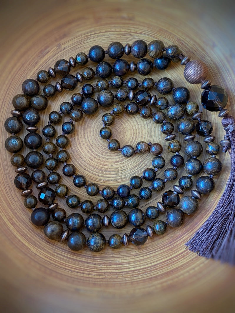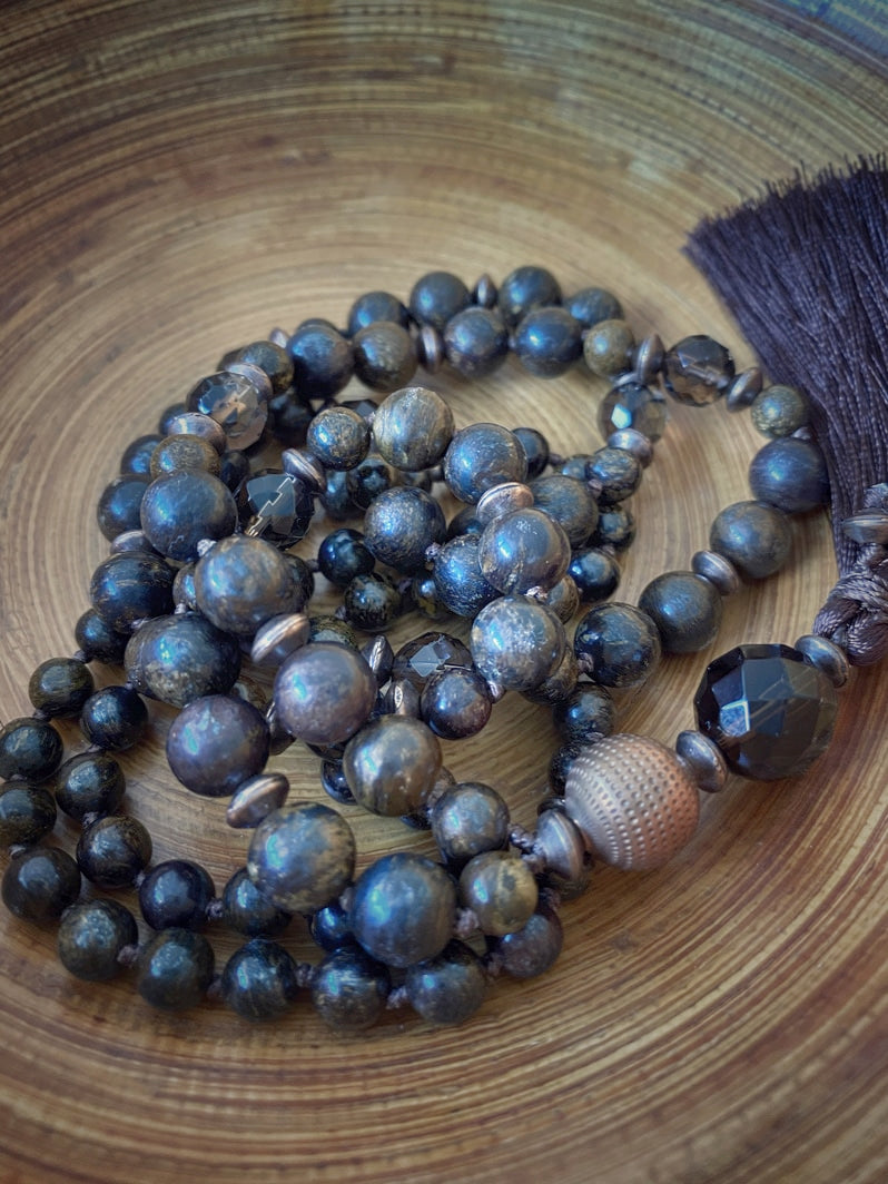 Abschluss: Facettierter Rauchquarz 10mm, Kupferkugel, braune Seidenquaste