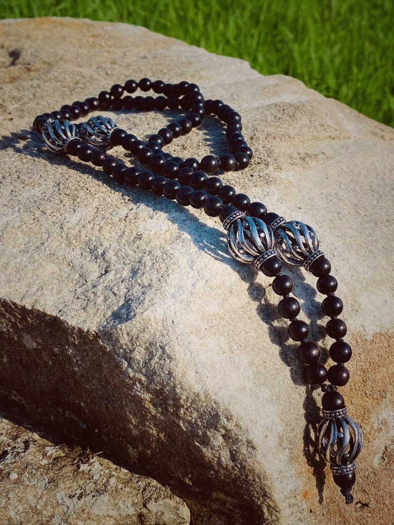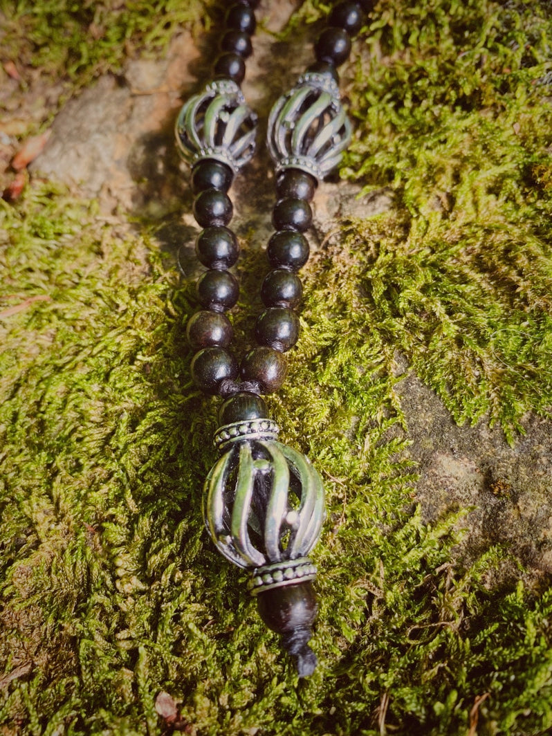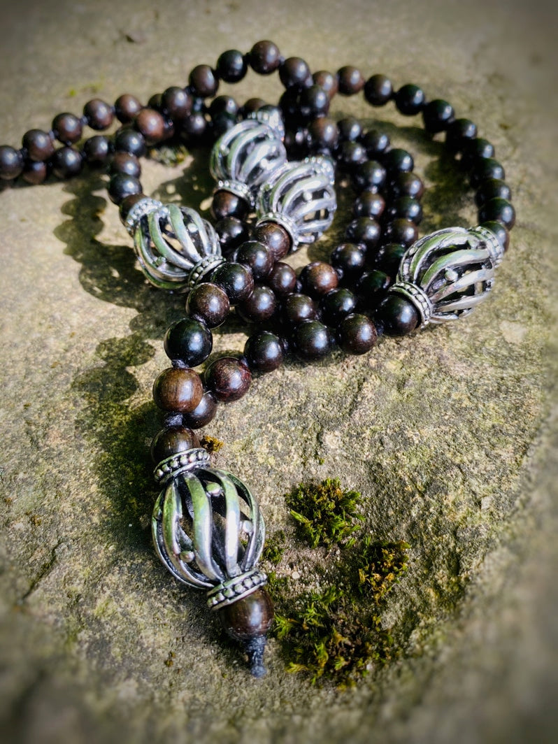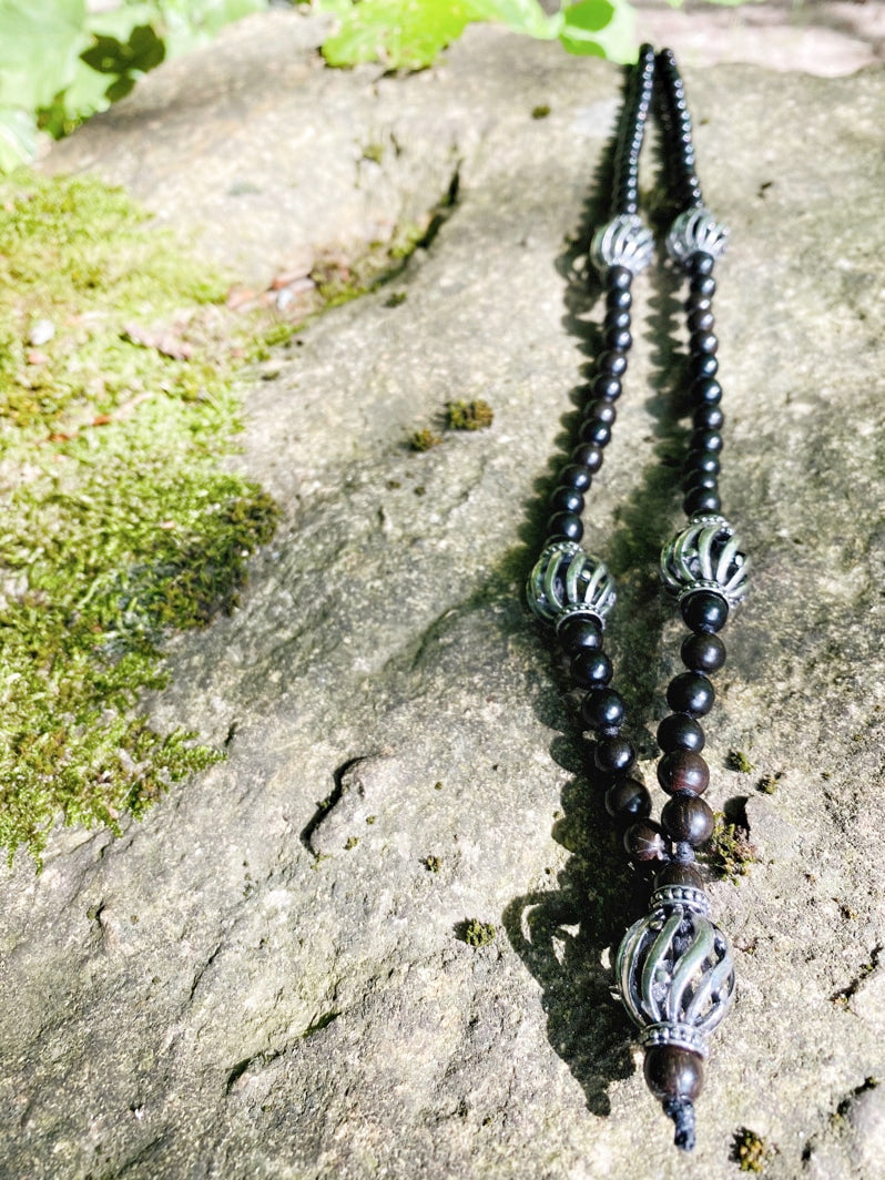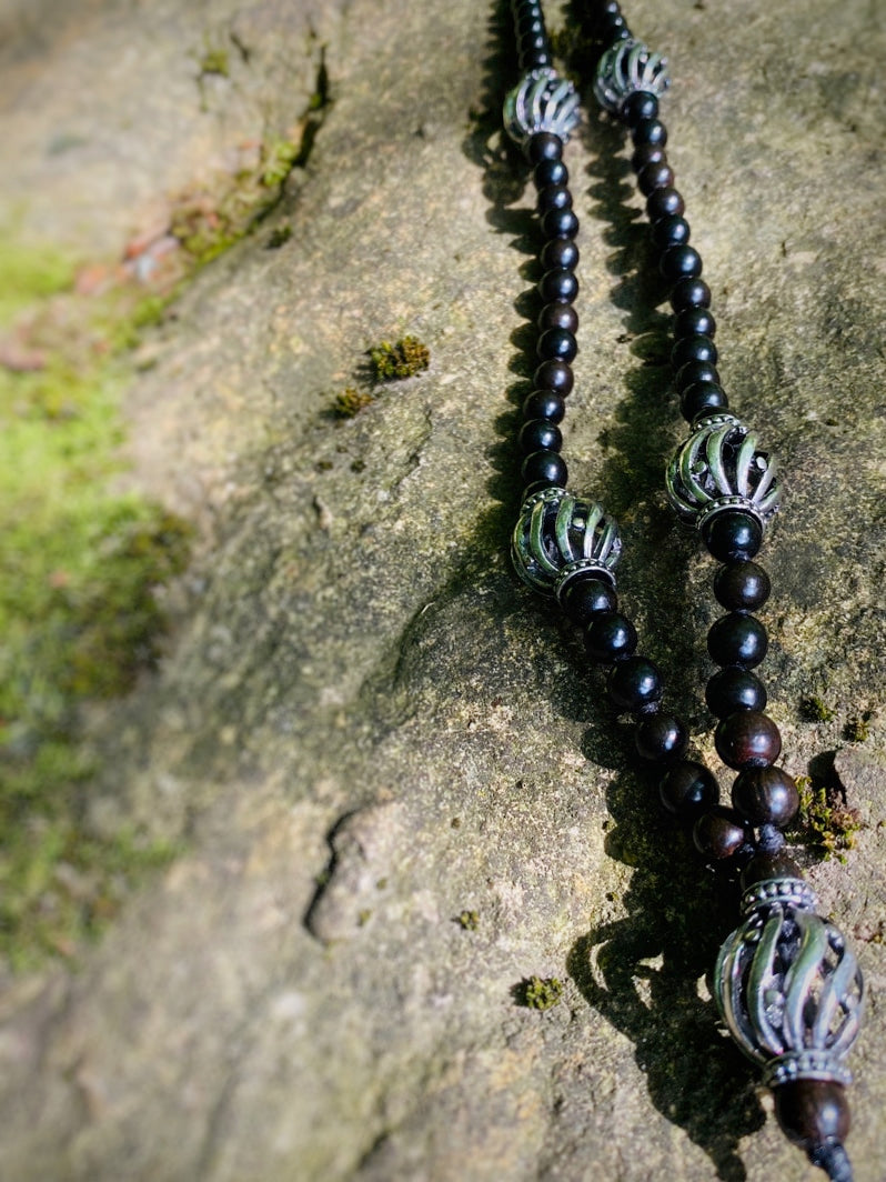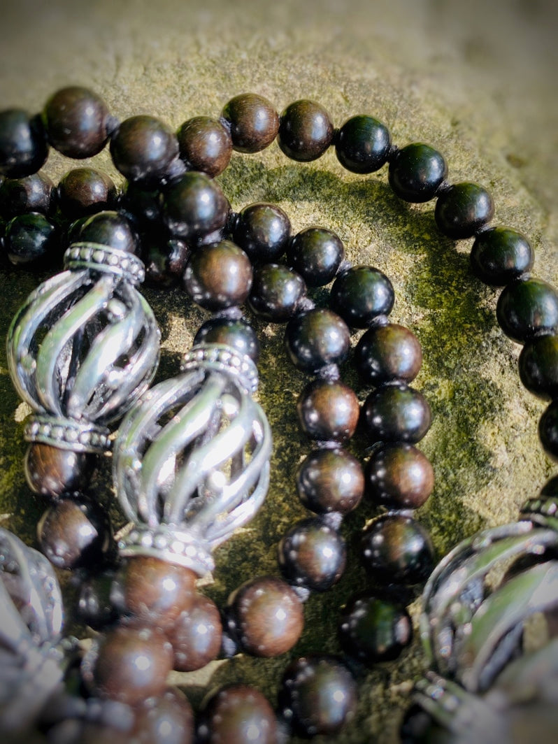 Perlen: Schwarzbraune polierte Kamagong Holz, 8mm, die sich wunderbar weich und samtig anfühlen. Kamagong Holz, eine Ebenholz-Art, wird normalerweise gerne bei Musikinstrumenten verarbeitet.
