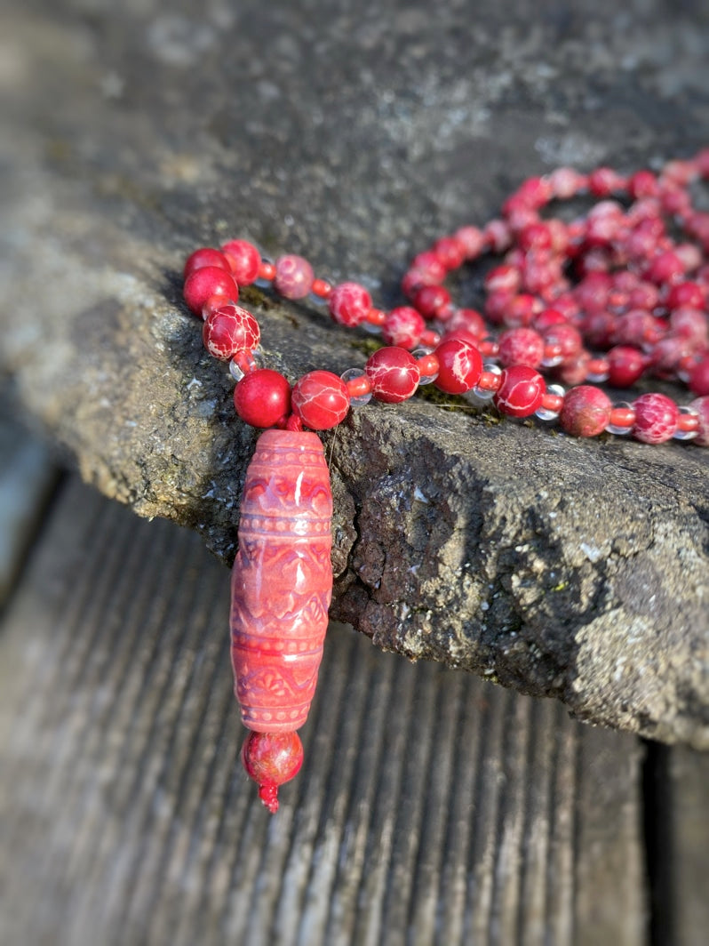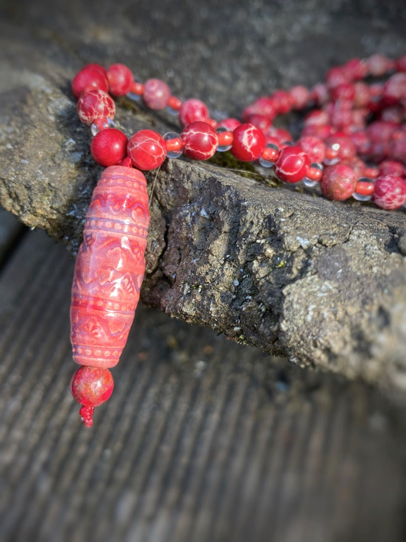 Abschluss: Handgearbeitete rote Keramikbicone aus Kambodscha mit Ornamenten