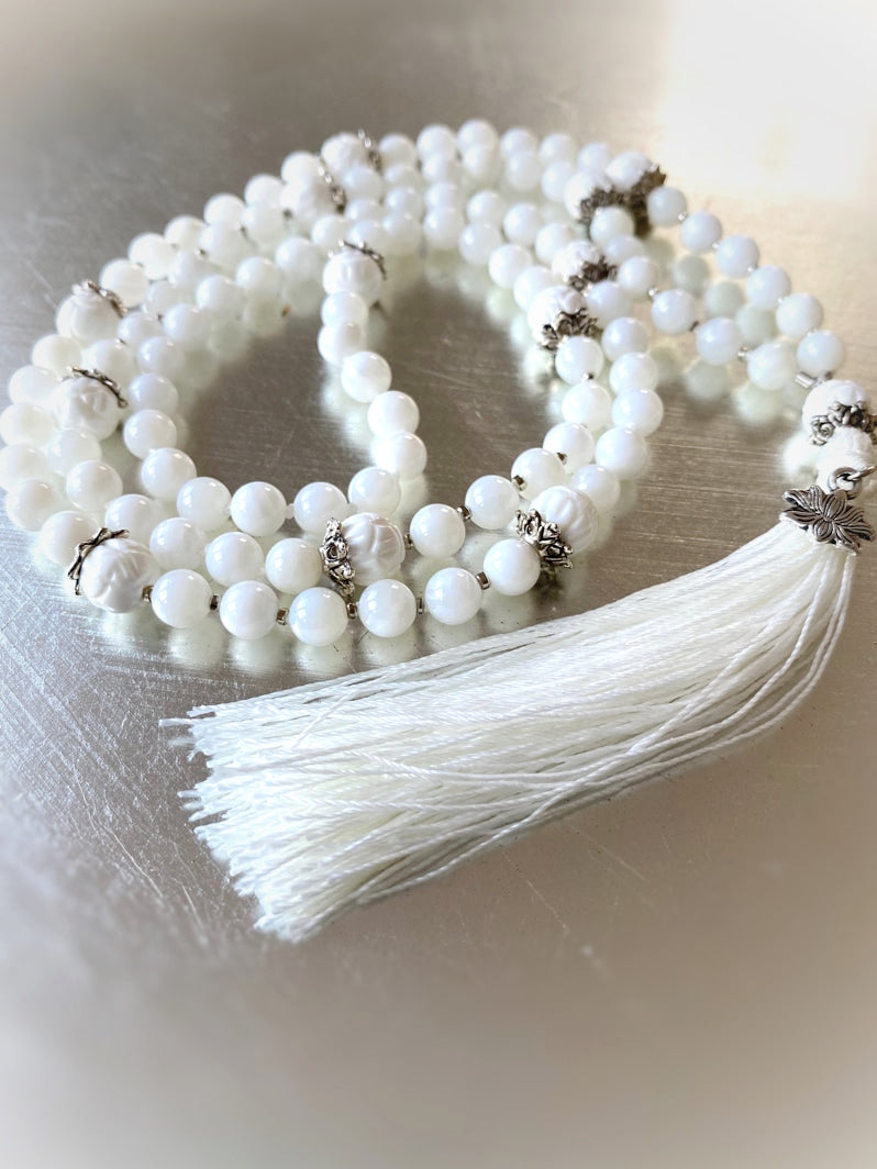 Abschluss: Weiße Lotusblüten-Korallenperle und weiße Quaste mit Lotusanhänger