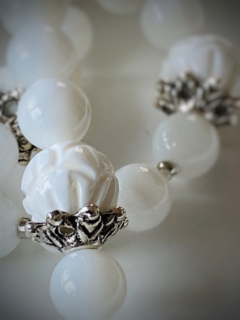 Marker: Lotusblüten-Perlen 8mm geschnitzt aus weißer Koralle mit silberfarbenen Metall-Perlkappen