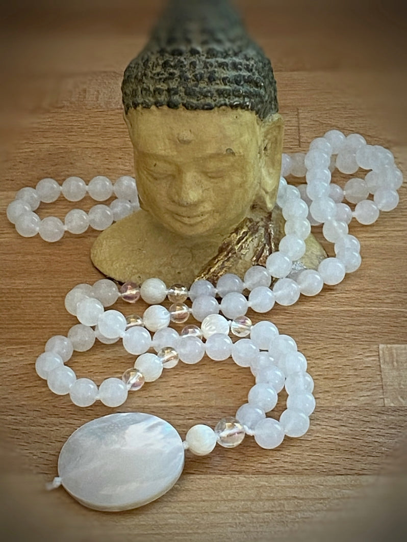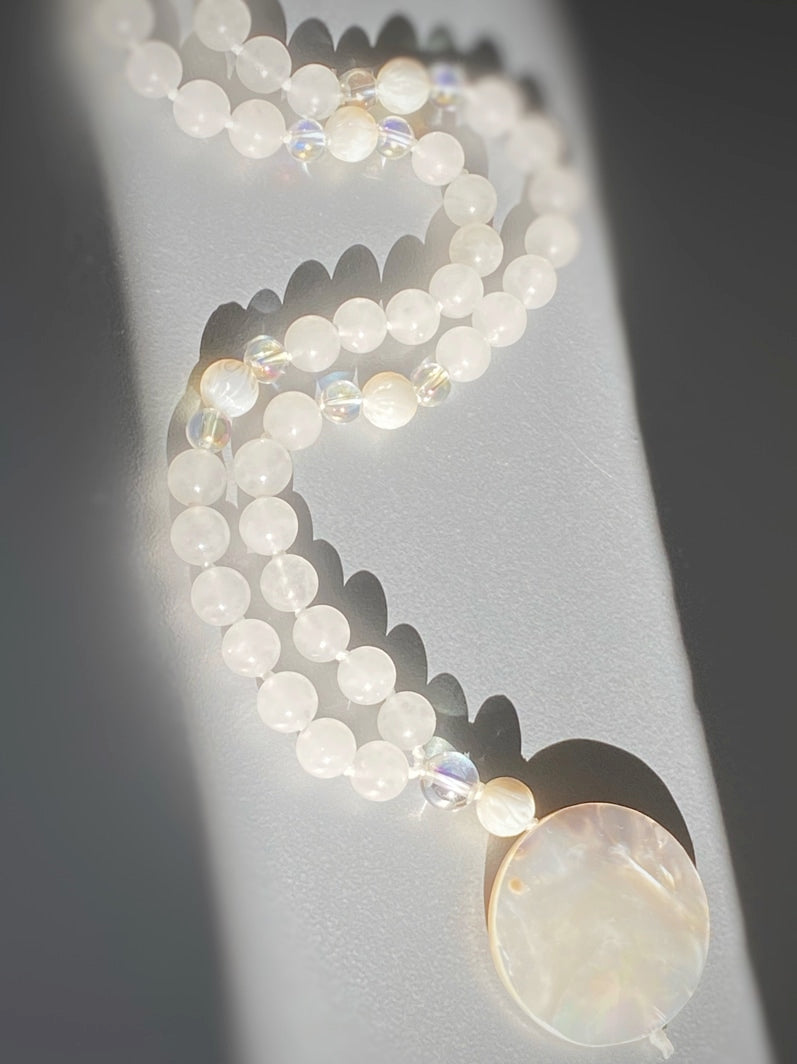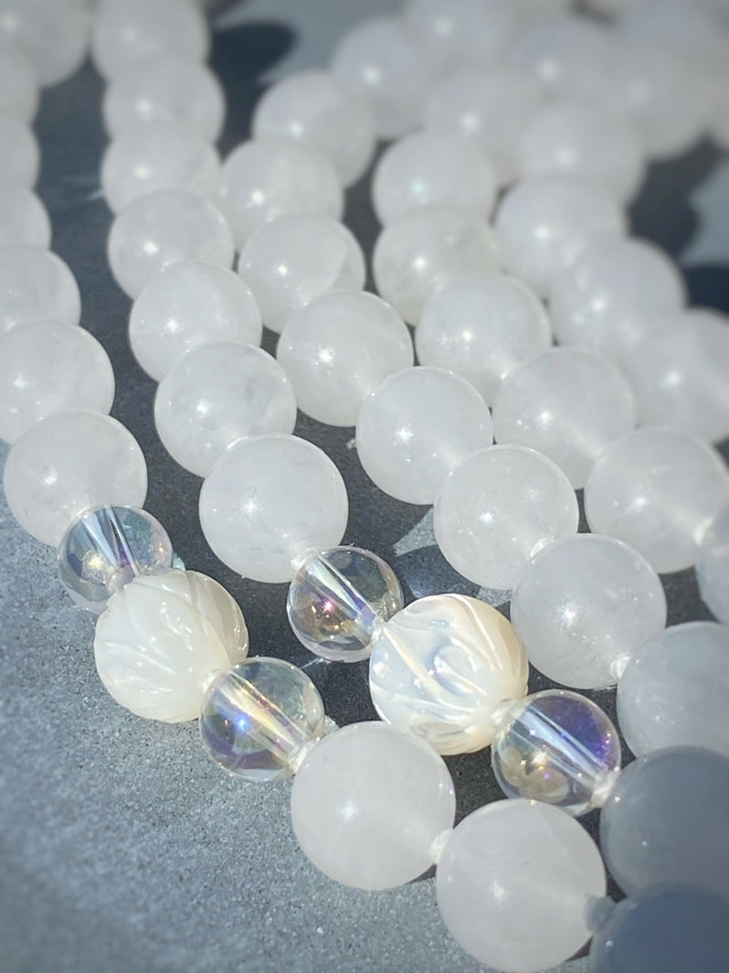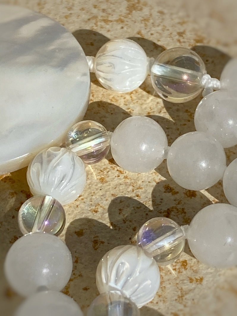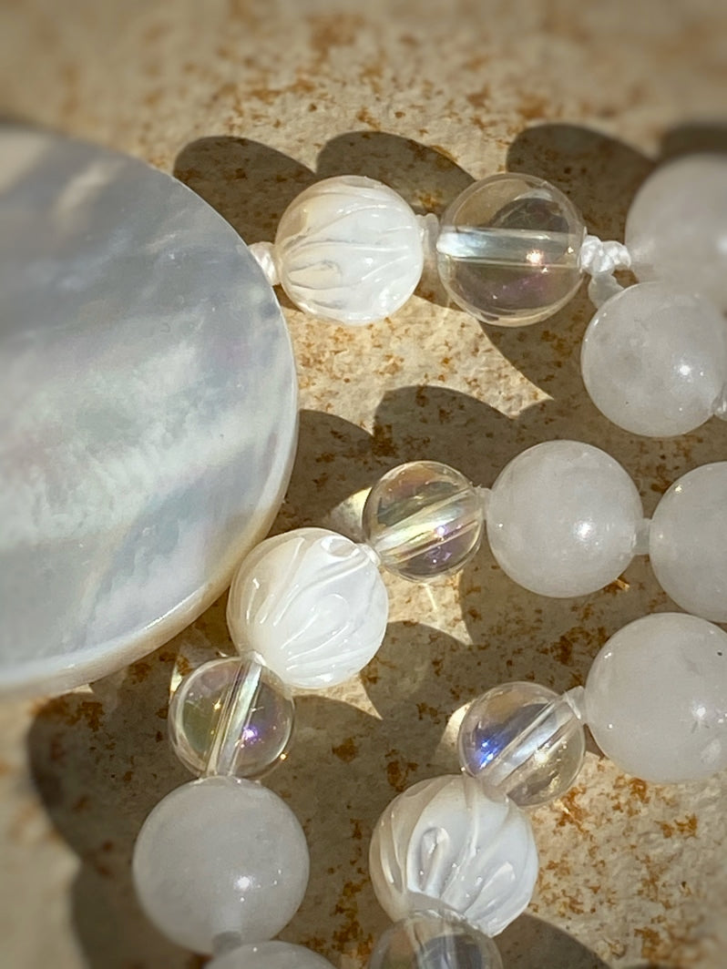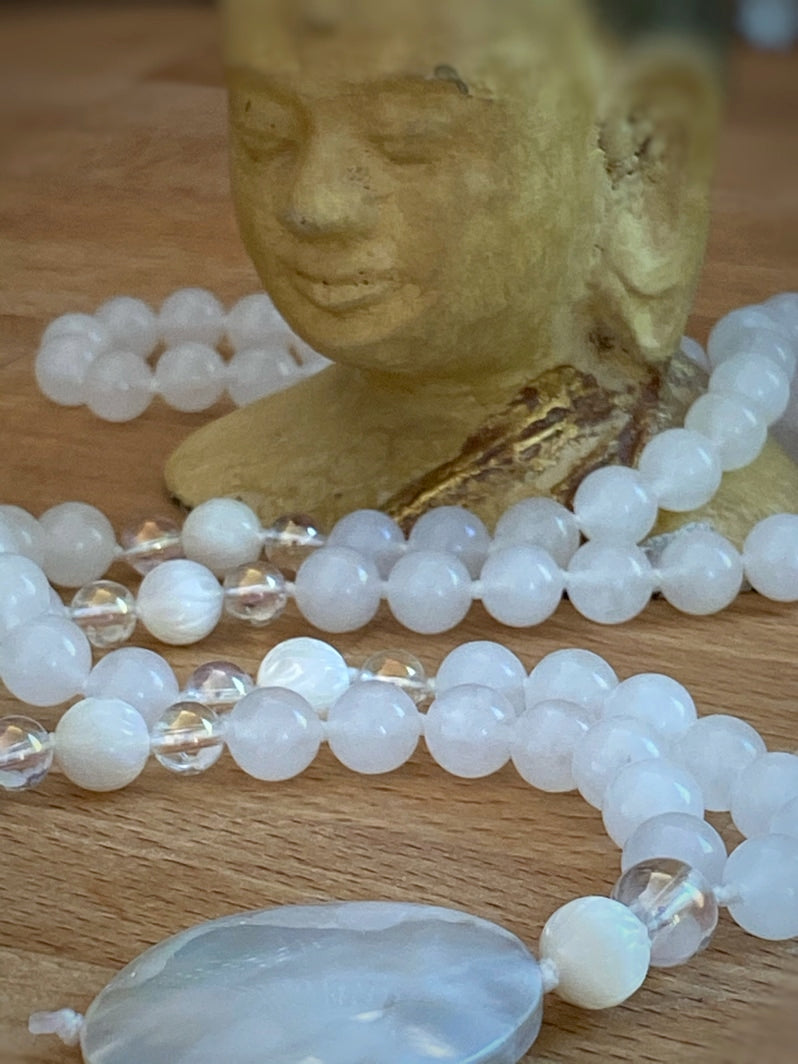 Abschluss: Angel Aura 8mm, geschnitzte Perlmutt-Perle 8mm und wunderschönes weiß-schillerndes Perlmuttamulett