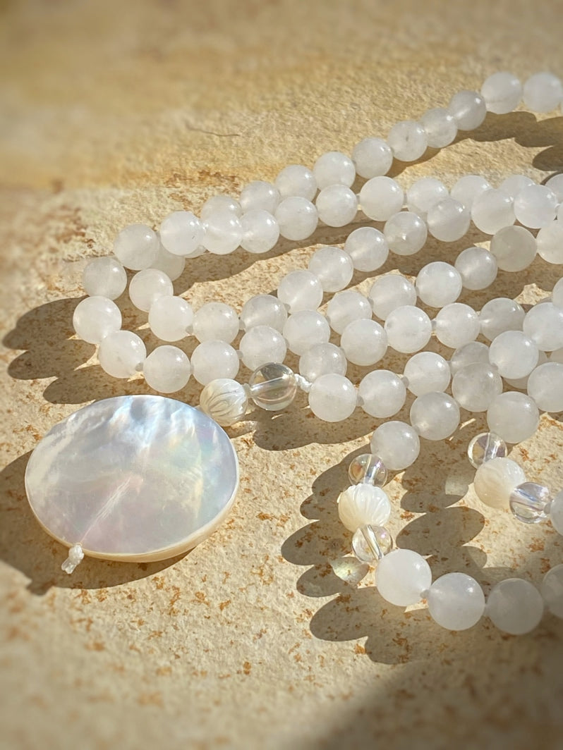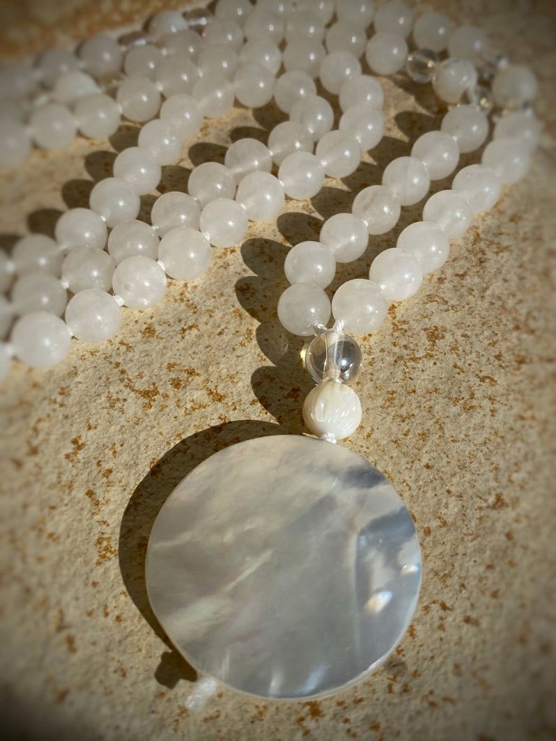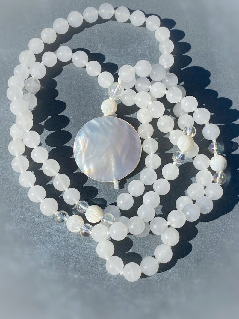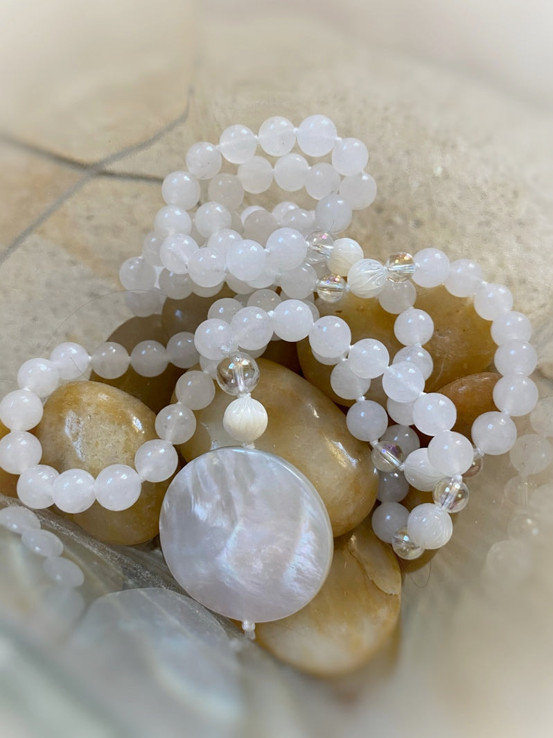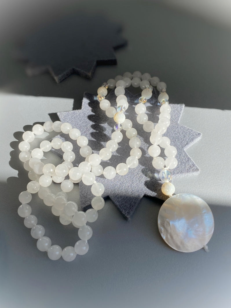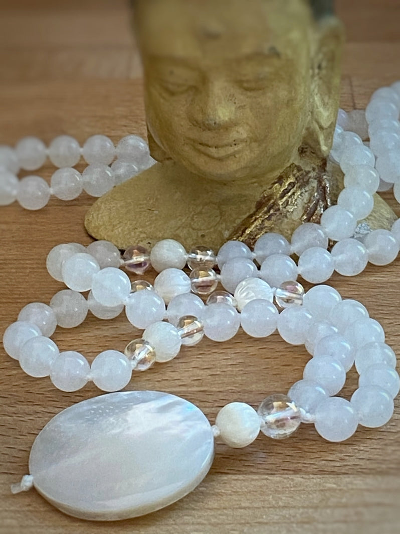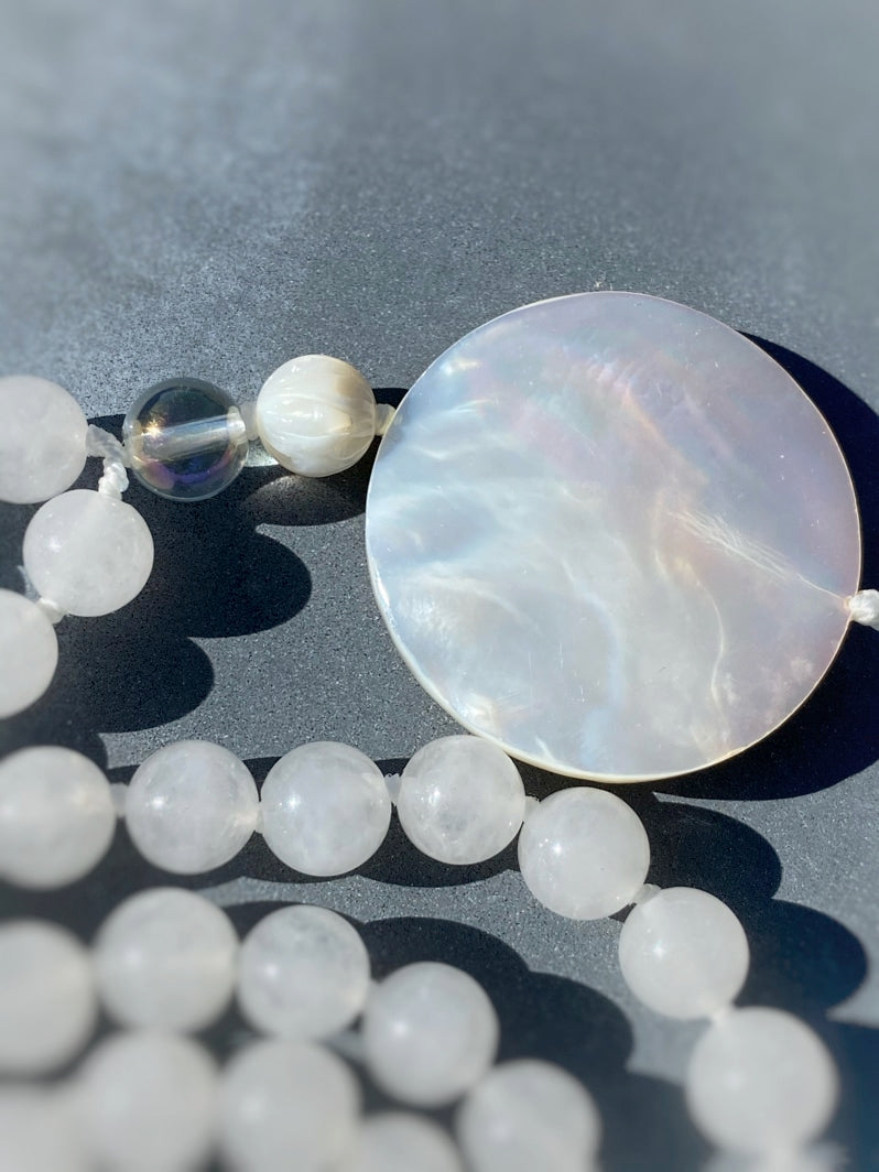 Abschluss: Angel Aura 8mm, geschnitzte Perlmutt-Perle 8mm und wunderschönes weiß-schillerndes Perlmuttamulett