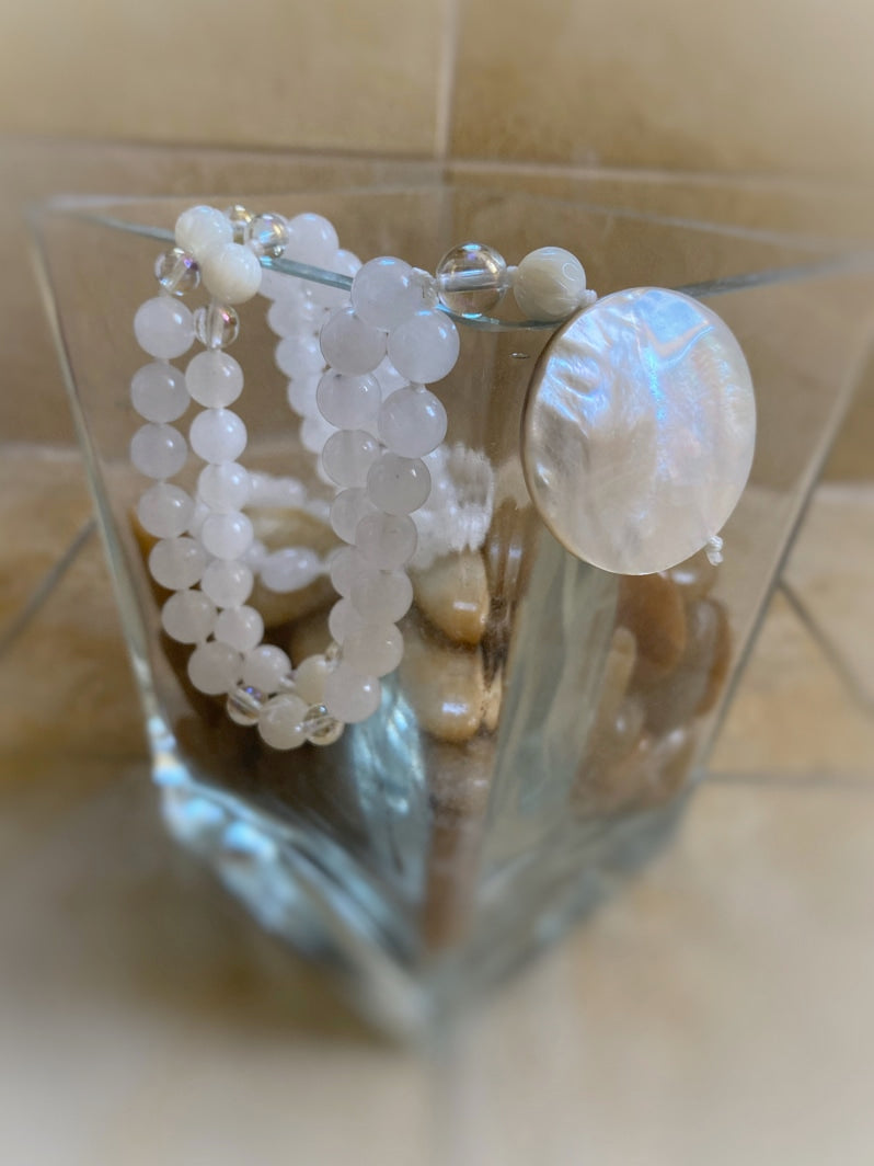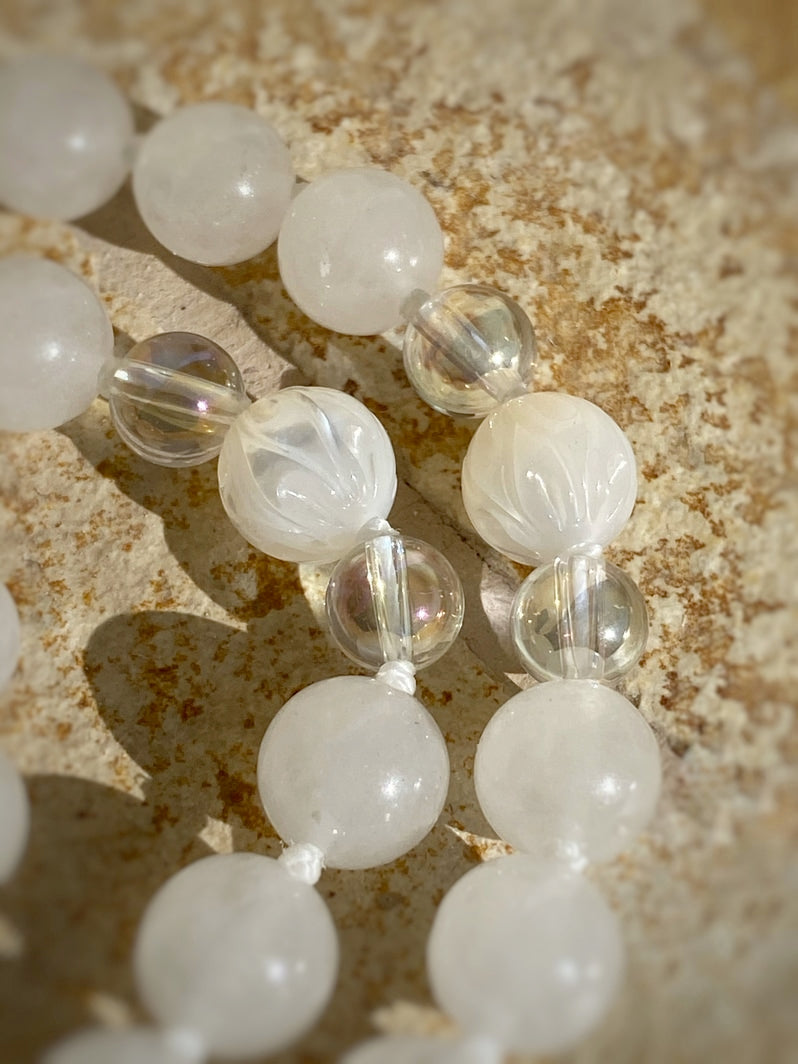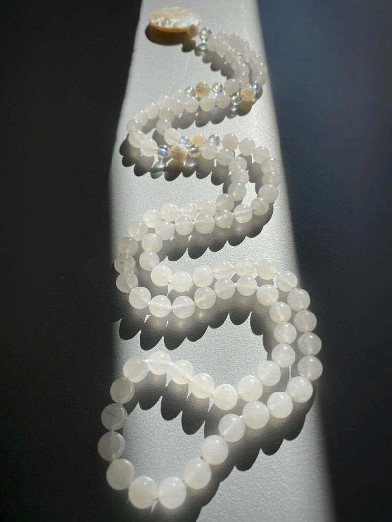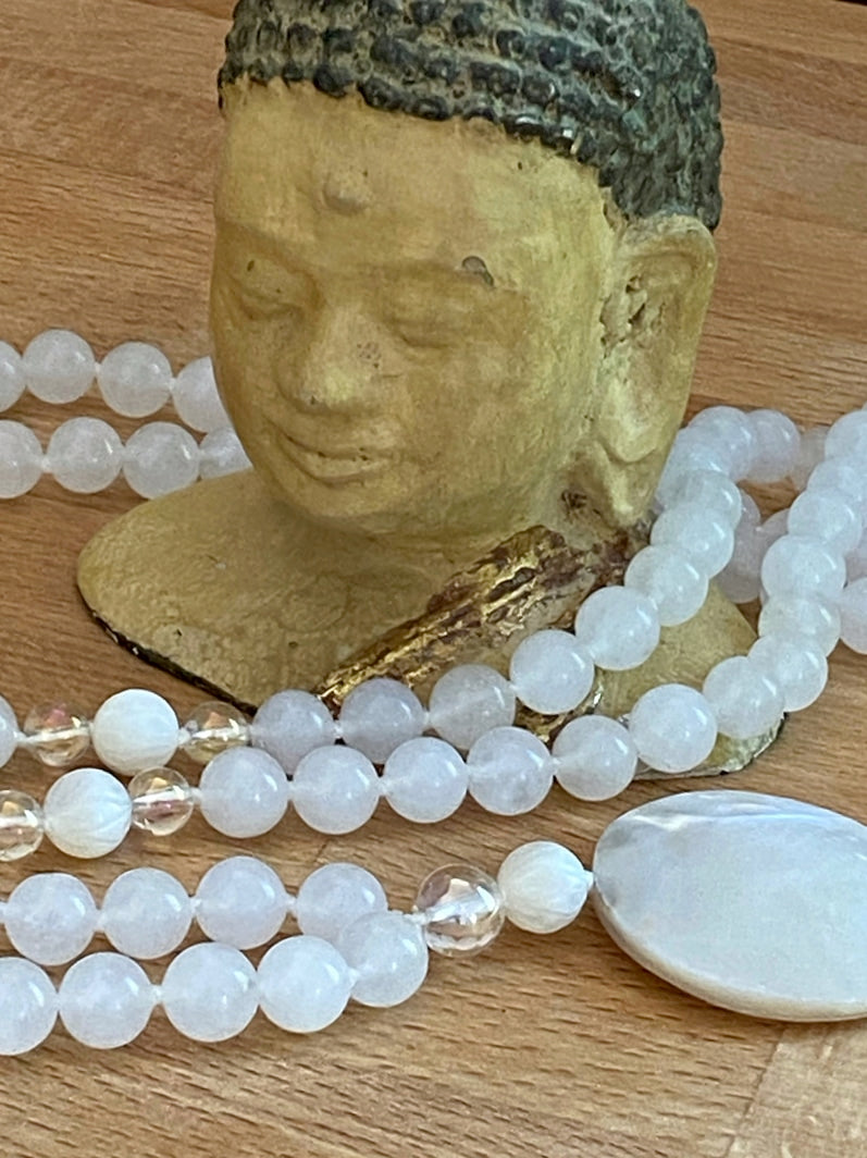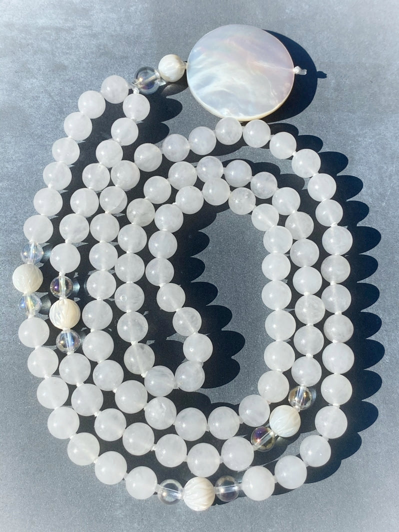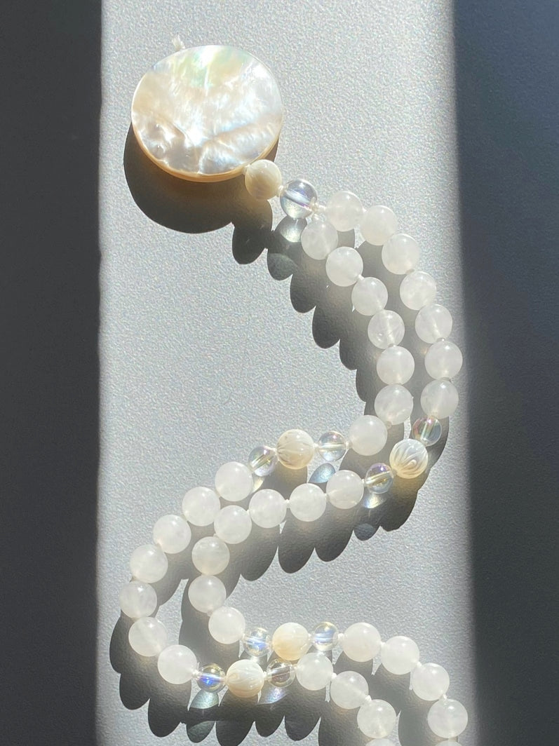 Abschluss: Angel Aura 8mm, geschnitzte Perlmutt-Perle 8mm und wunderschönes weiß-schillerndes Perlmuttamulett