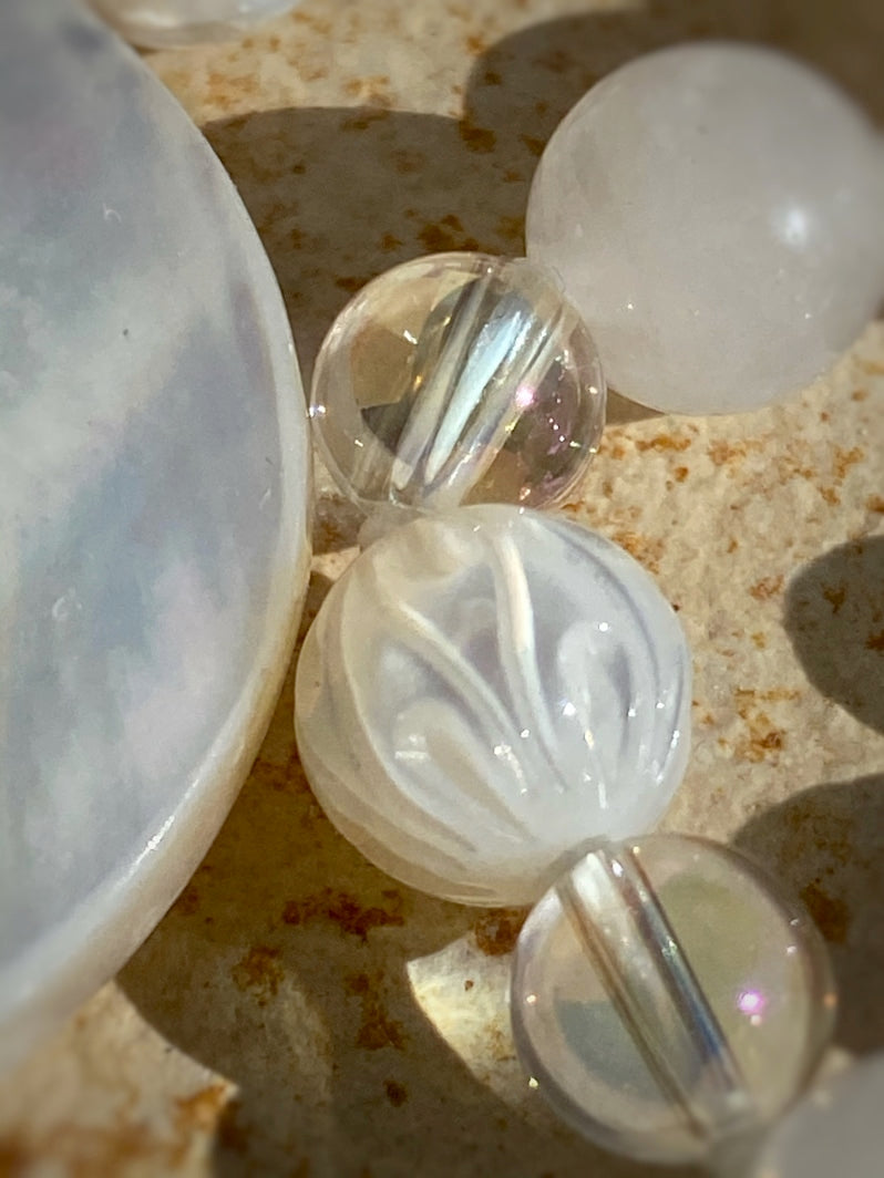 Marker: Angel Aura 6mm und geschnitzte Perlmutt-Perlen 8mm