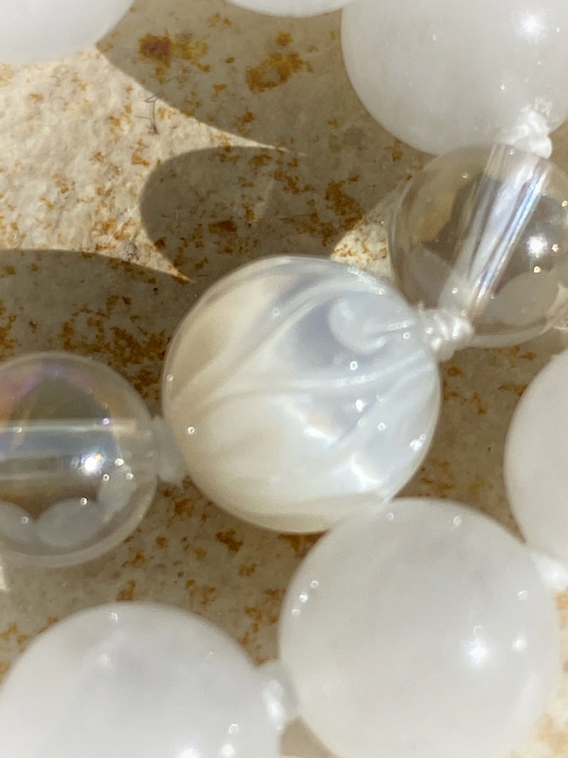 Schneejade schenkt Freude und Lebenslust. Sie unterstützt Selbstsicherheit, Selbstvertrauen und Selbständigkeit. Jade sorgt auch für inneren Frieden und Zufriedenheit. Angel Aura hat sorgt für Klarheit und hat eine große reinigende Energie. Perlmutt wirkt wunderbar bei melancholischen Stimmungen, es weckt die Lebenskräfte und gibt Mut. Auch auf körperlicher Ebene hilft es sehr gut zur Rehabilitation. Und es unterstützt bei der Lösung von Konflikten.