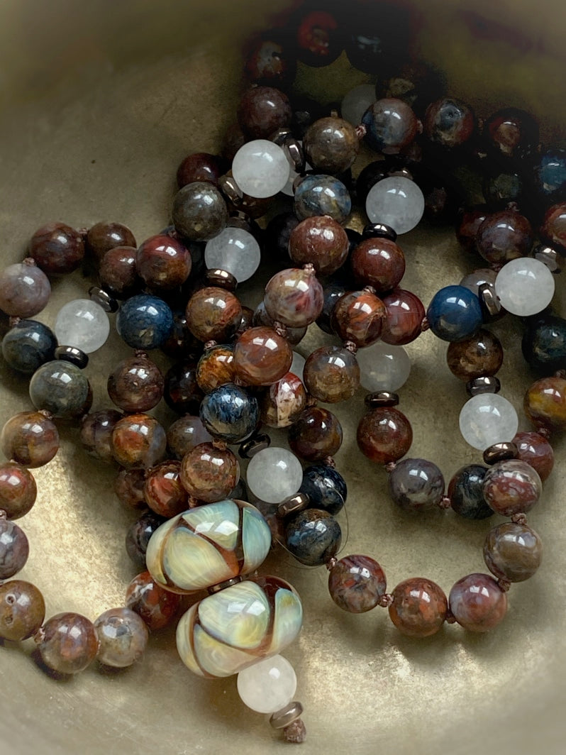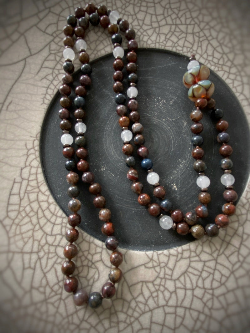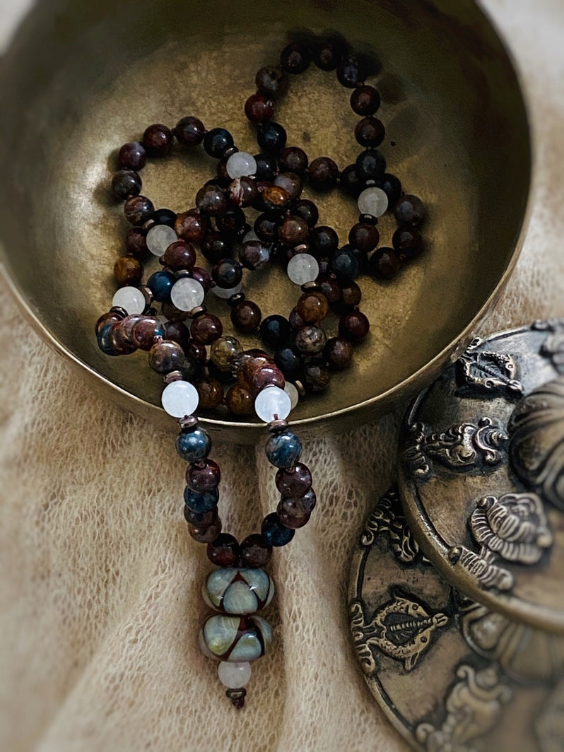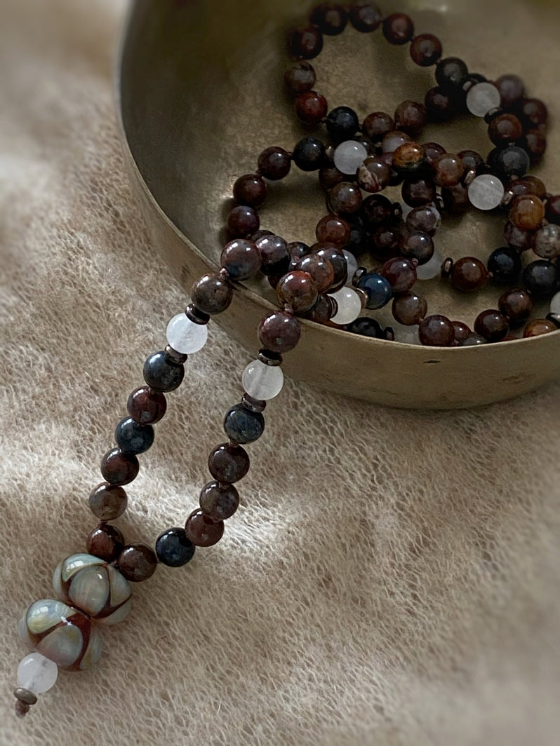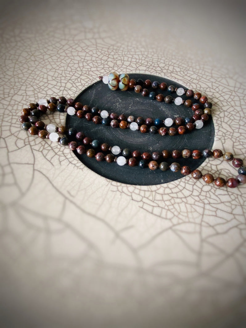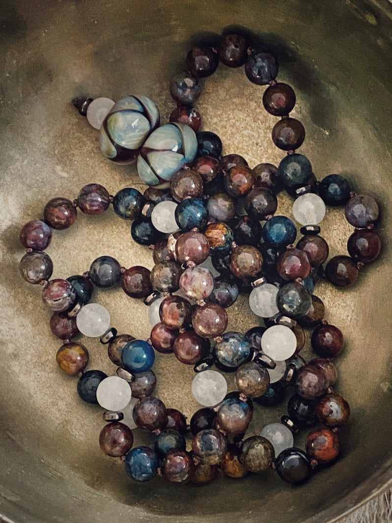 Eine Mala mit Pietersit und Schneejade - ein seltene, sehr kraftvolle Kombination