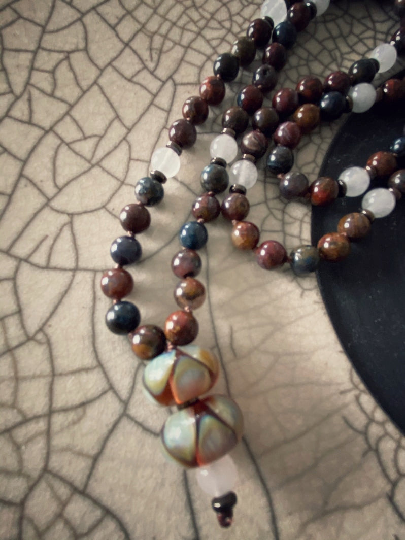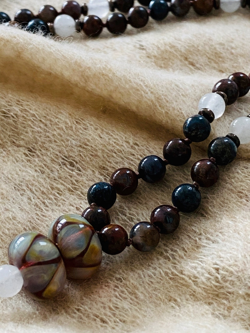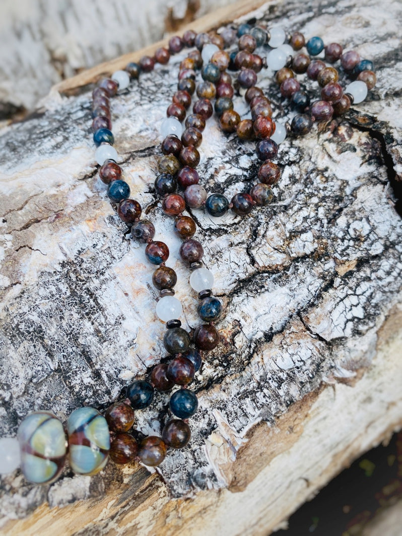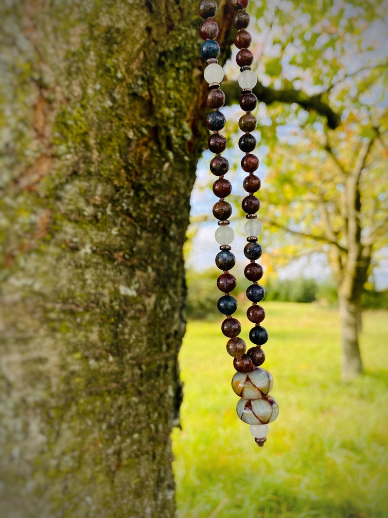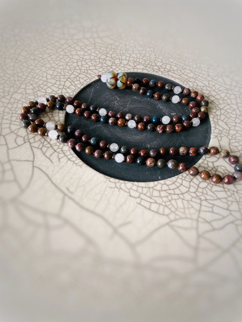 Eine Mala mit Pietersit und Schneejade - ein seltene, sehr kraftvolle Kombination