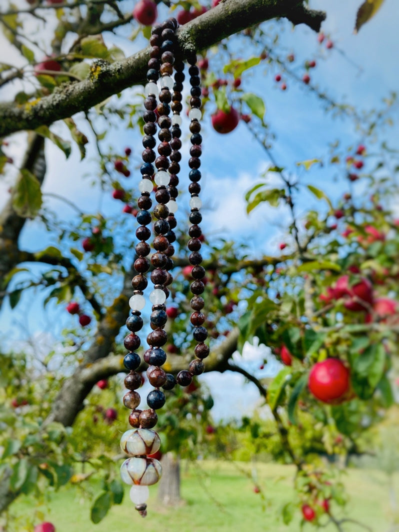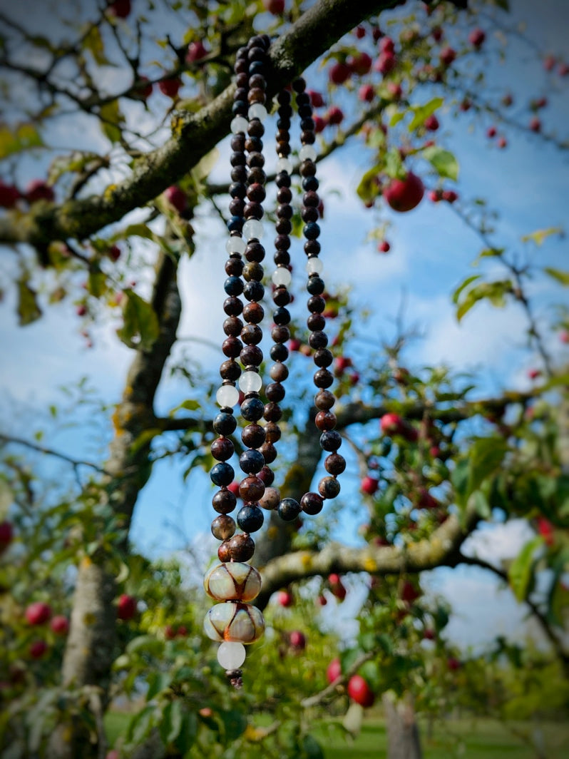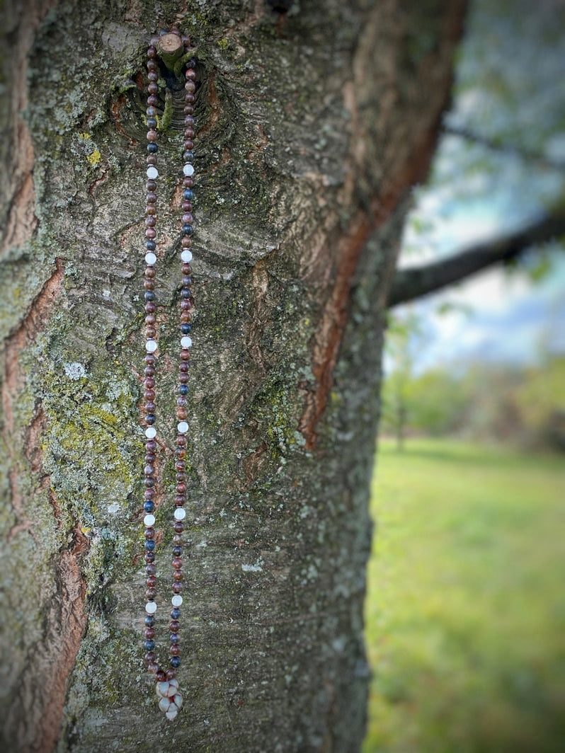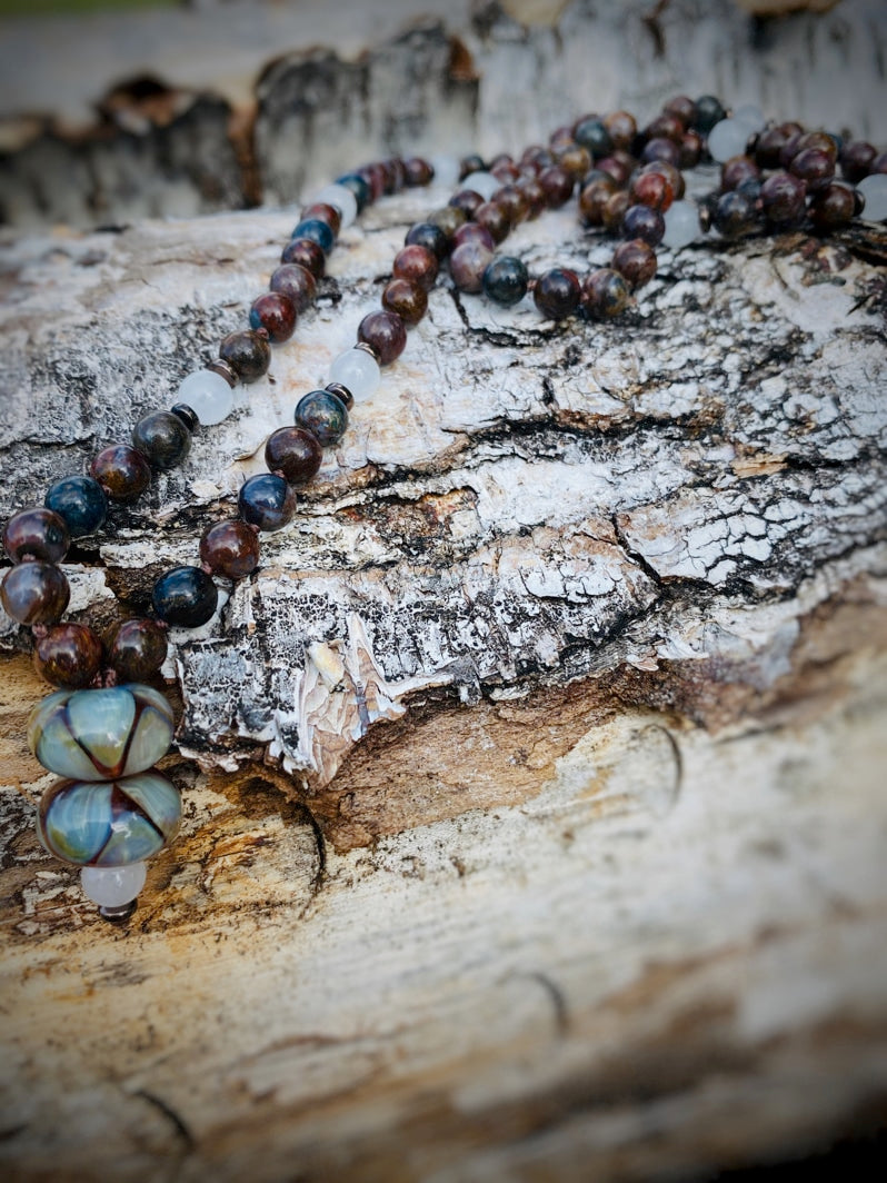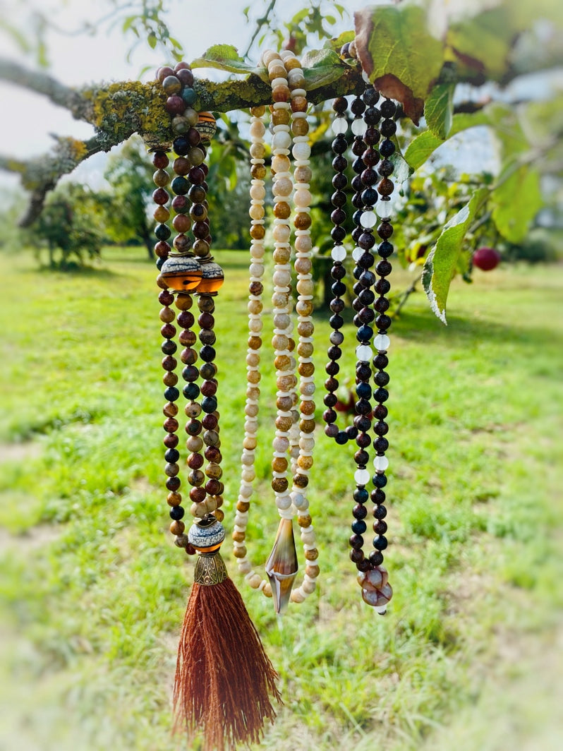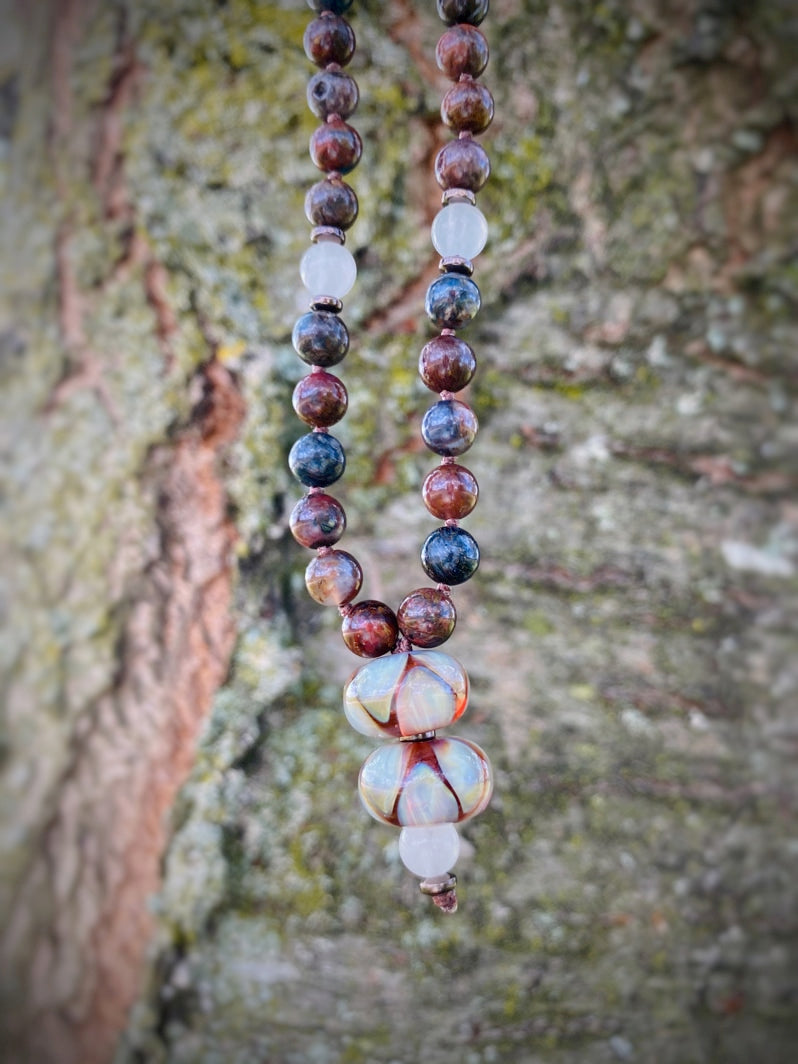 Eine Mala mit Pietersit und Schneejade - ein seltene, sehr kraftvolle Kombination