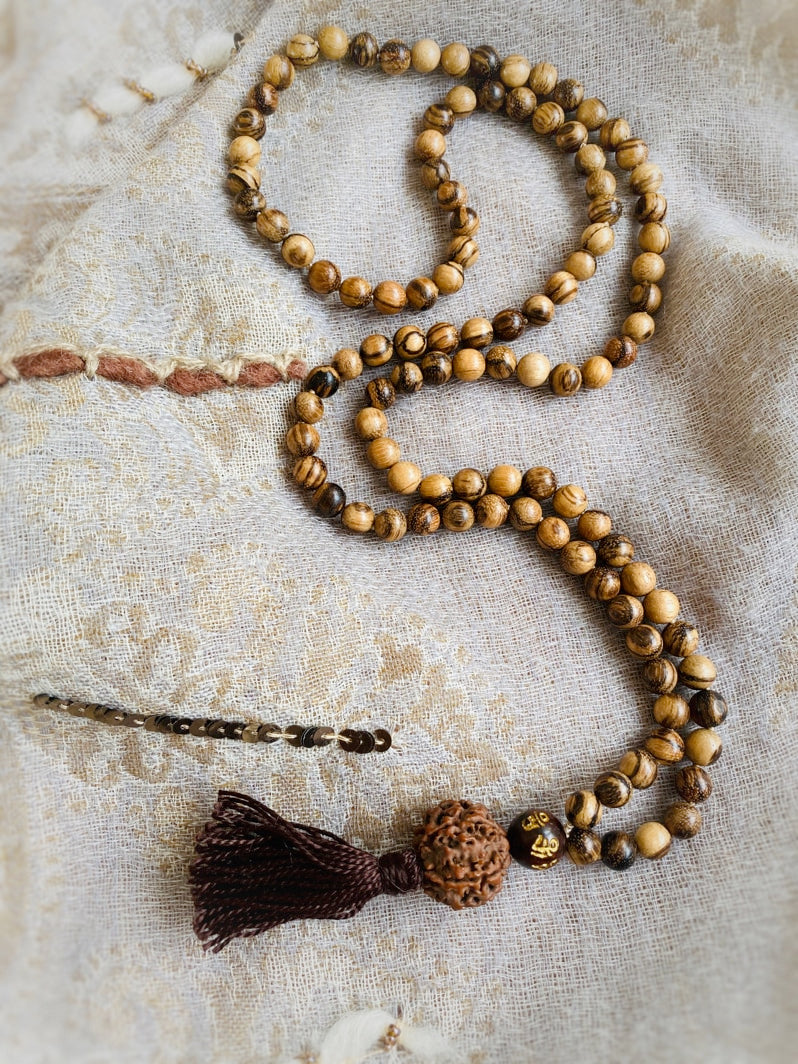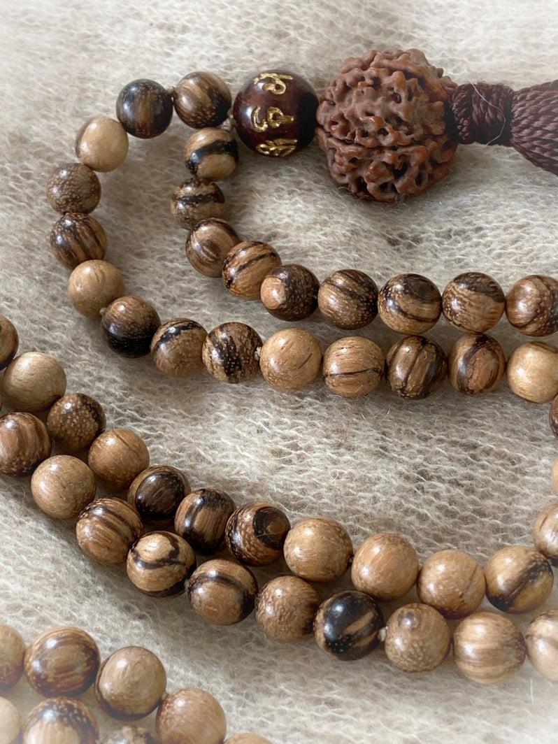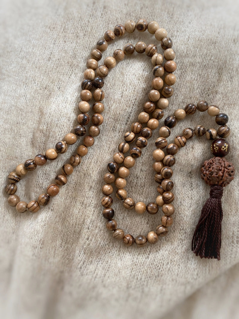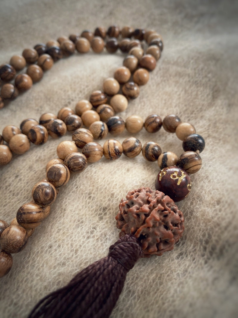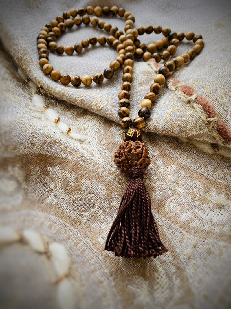 Abschluss: Mantraperle OM MANI PADME HUM, große Rudraksha und braune Quaste