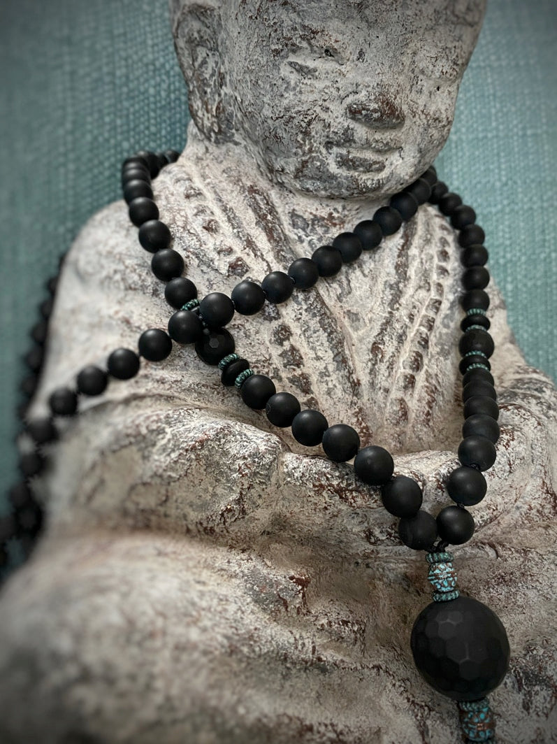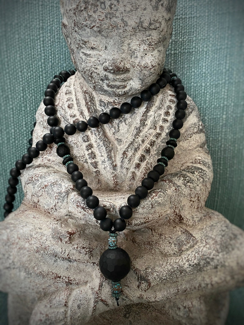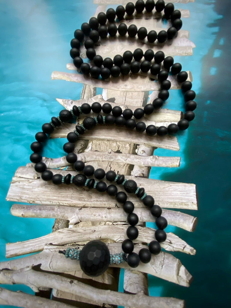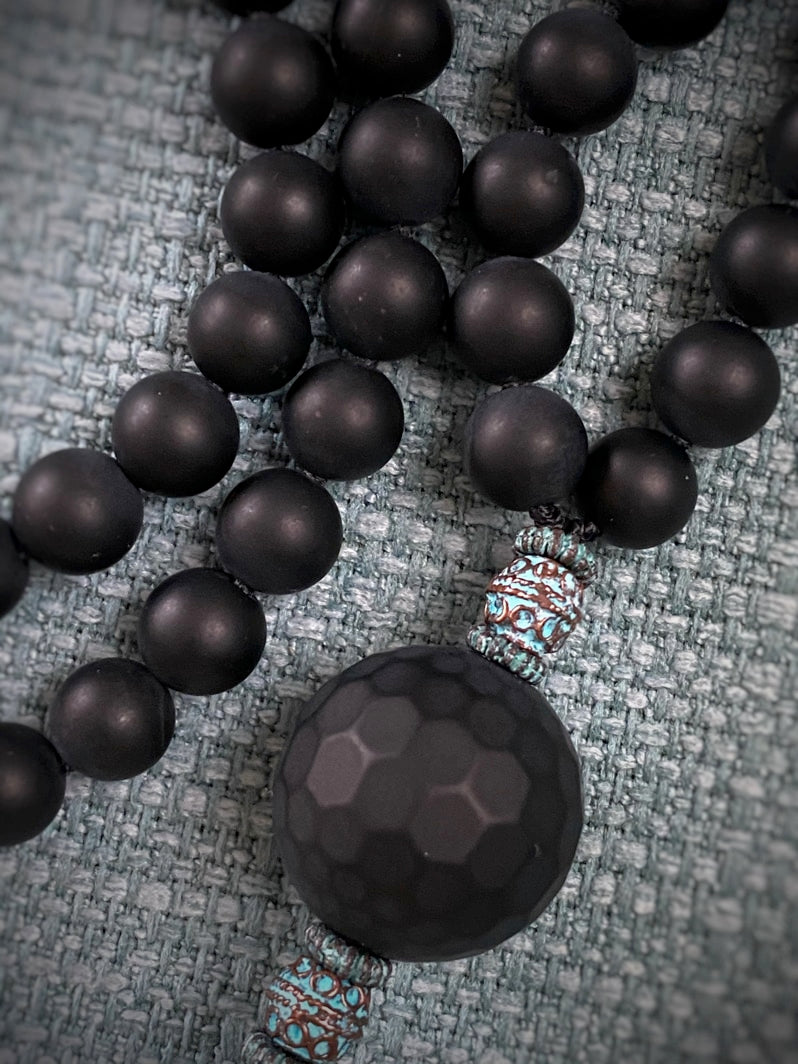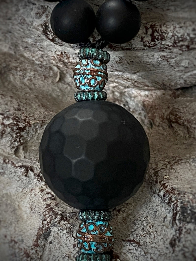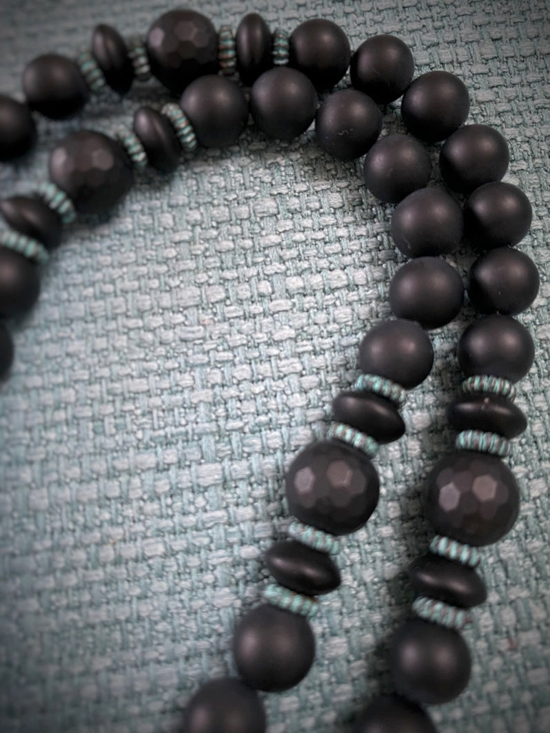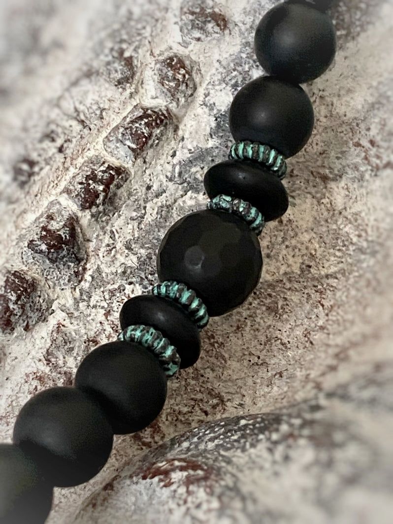 Abschluss: Facettierter matter Onyx 14mm mit türkis-oxidierten Metallscheiben und -perlen