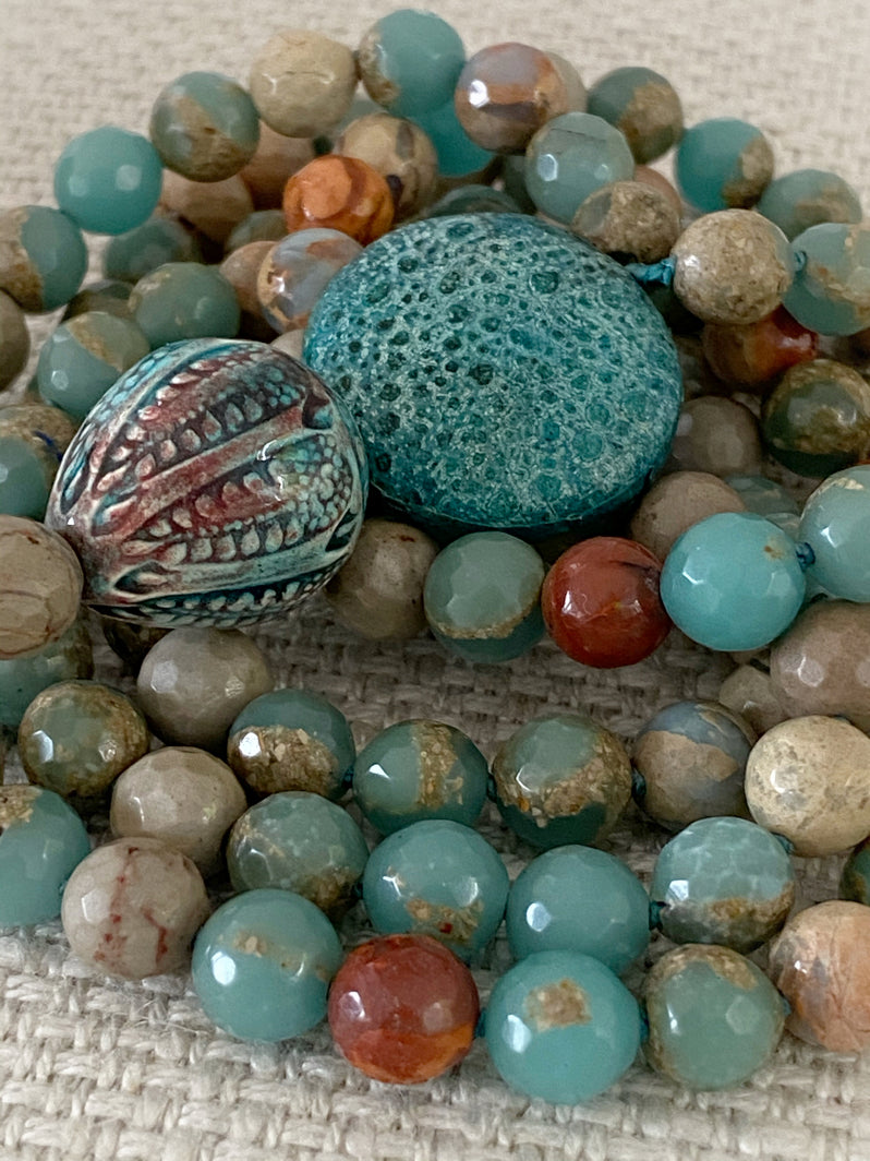 Abschluss: Mit Leder überzogene türkisfarbene Holzperle und indonesische Keramikperle