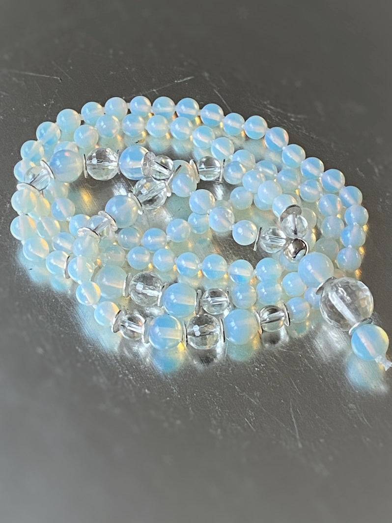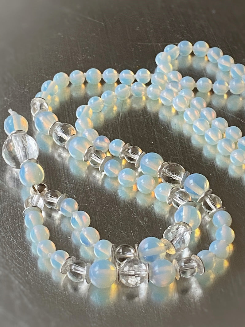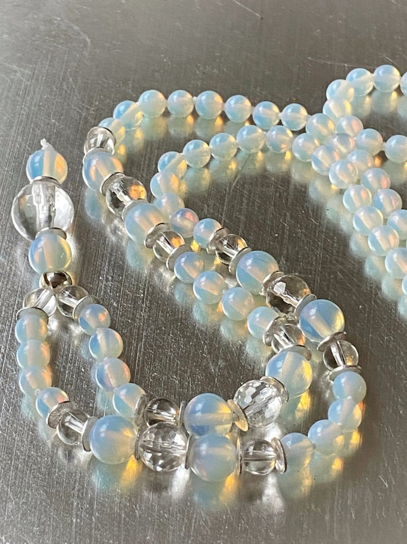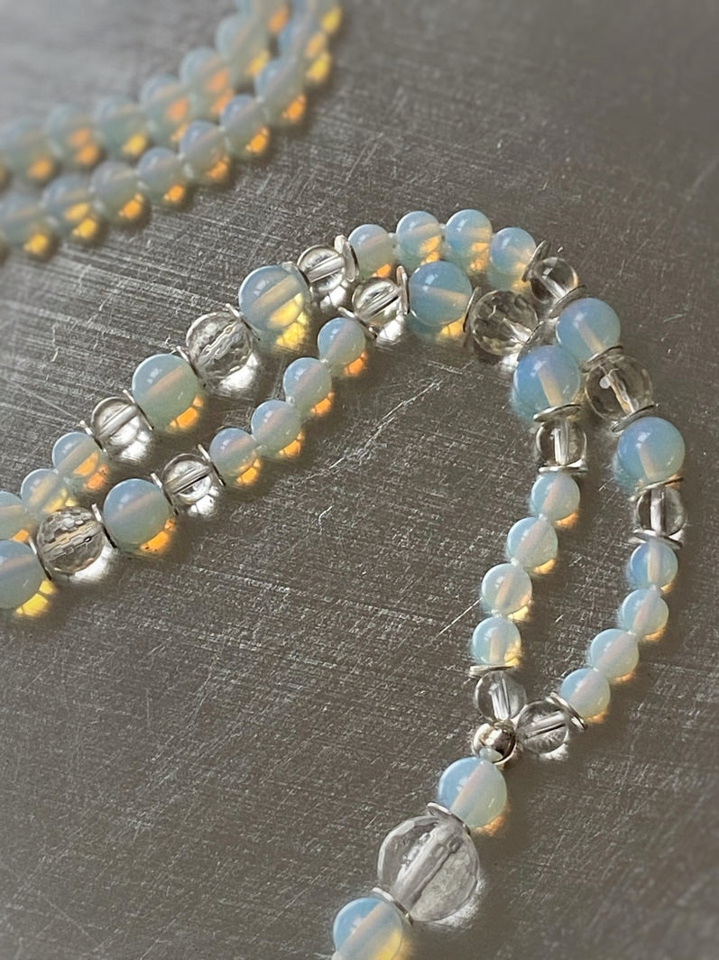 Marker: Facettierter Bergkristall 8mm eingerahmt von Bergkristall 6mm, Opalith 8mm und gebürsteten silberfarbenen Metallscheiben