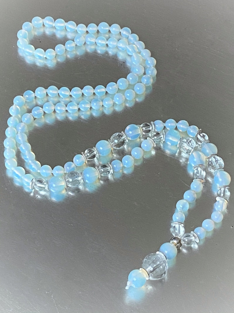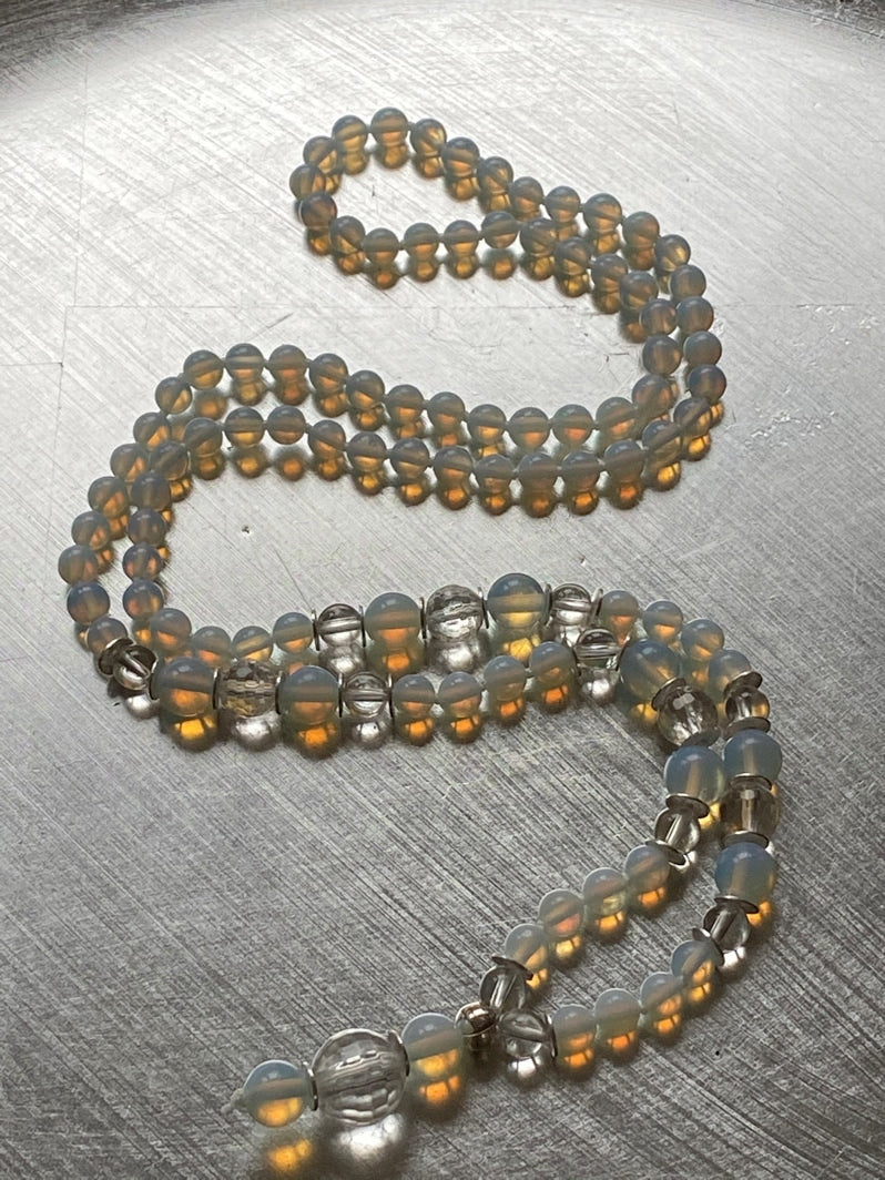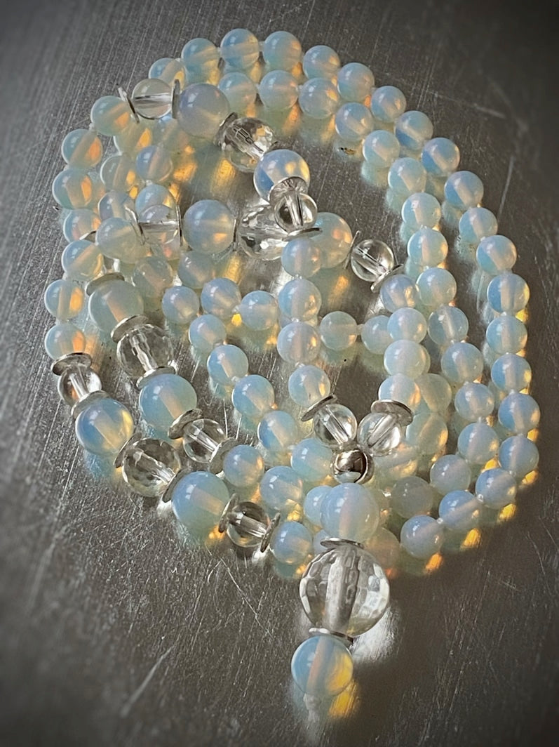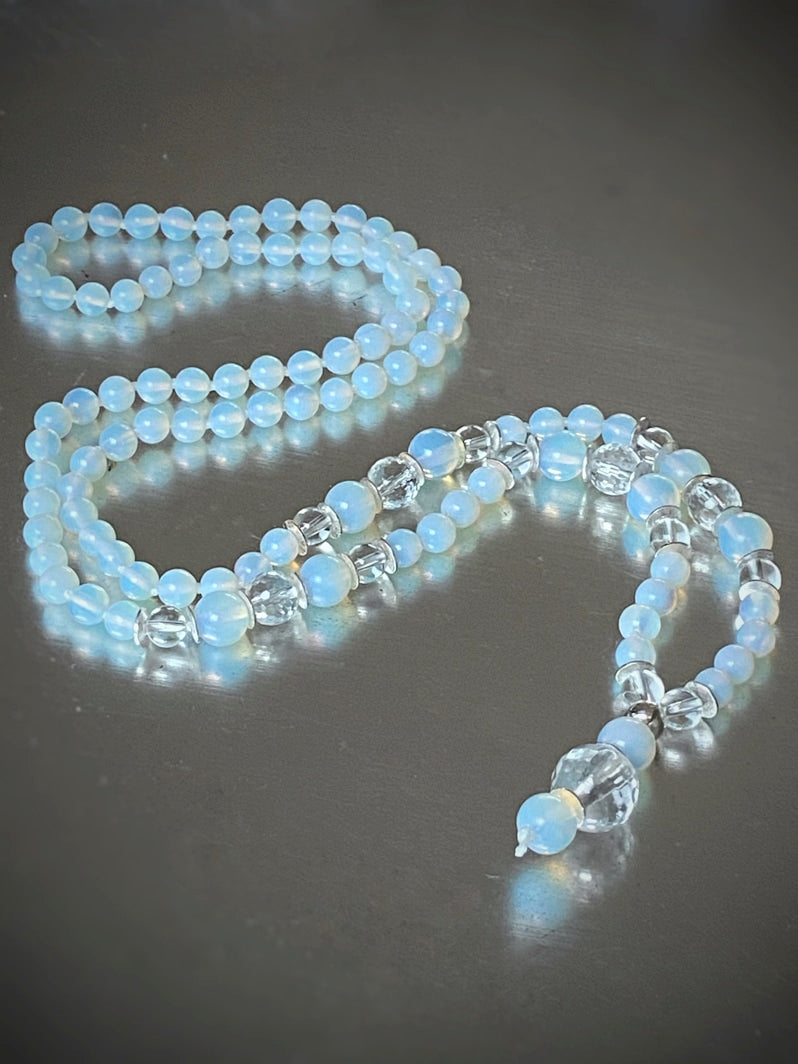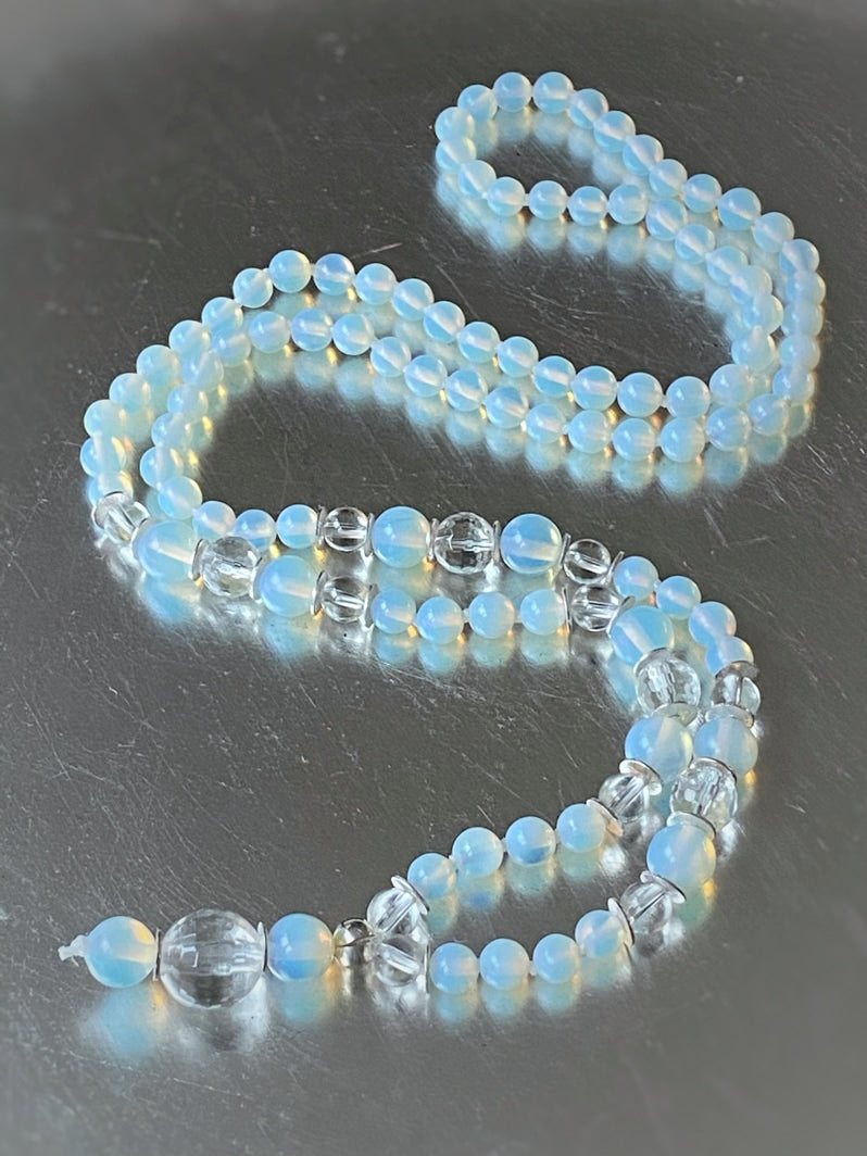 Marker: Facettierter Bergkristall 8mm eingerahmt von Bergkristall 6mm, Opalith 8mm und gebürsteten silberfarbenen Metallscheiben