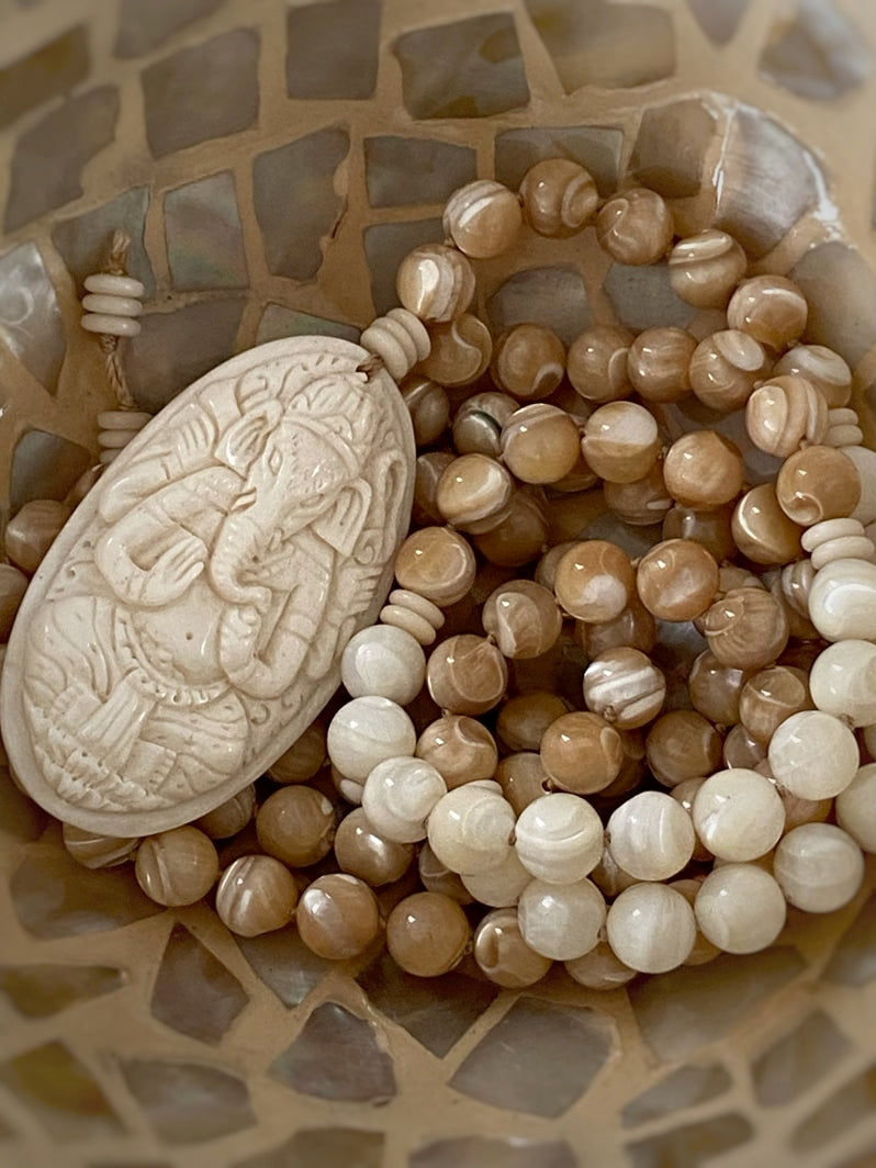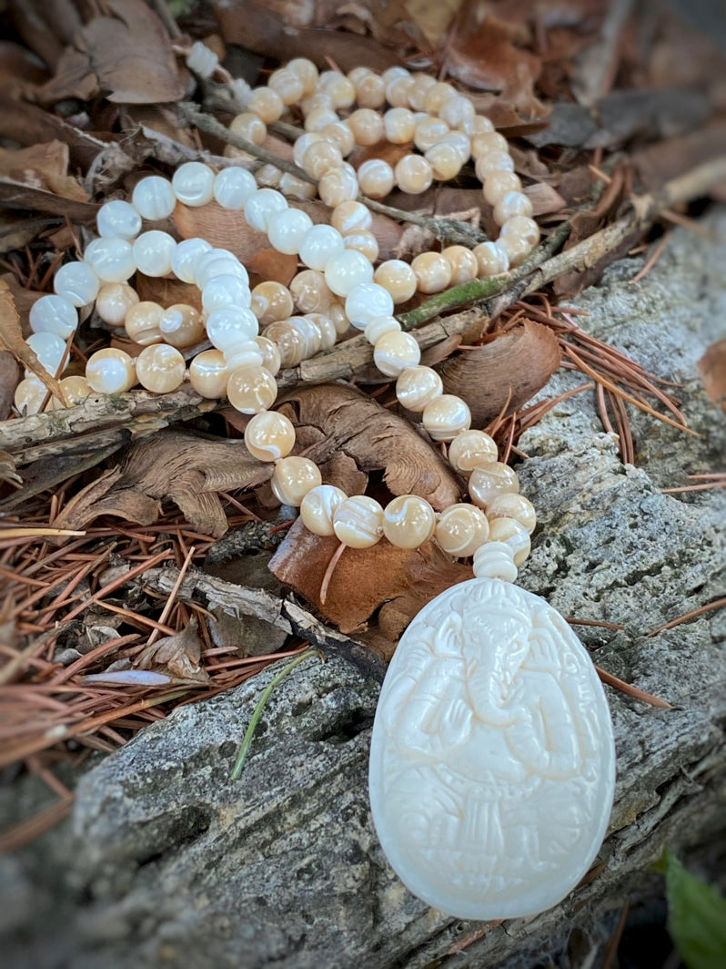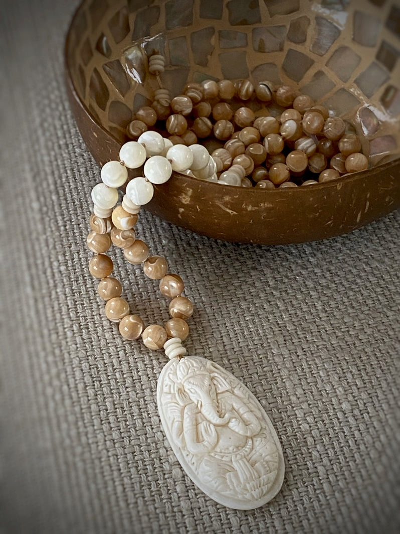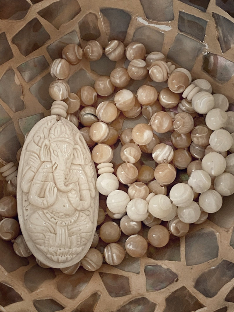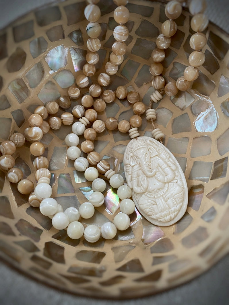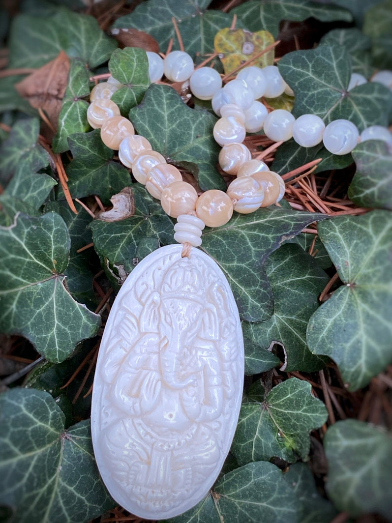Perlmutt kann melancholische Stimmungen abbauen, die Lebenskräfte wecken, Mut schenken und bei der Lösung von Konflikten helfen. Ganesha ist der hinduistische Gott, der Hindernisse aus dem Weg räumt und Glück bringt.