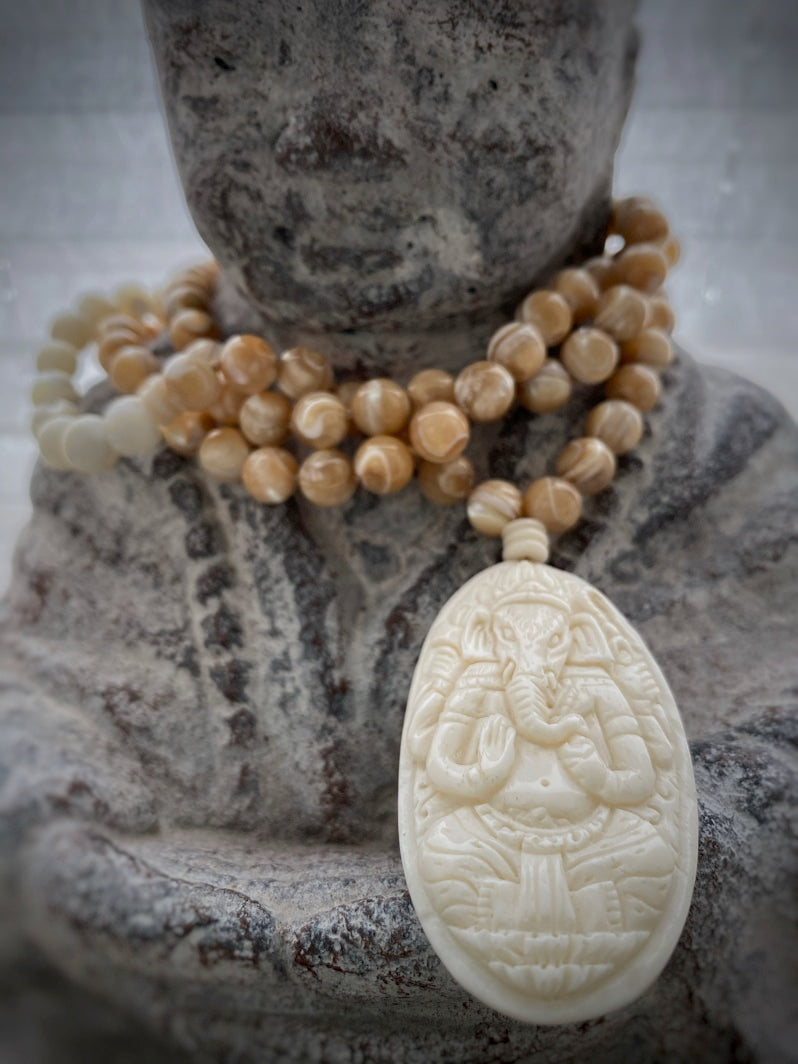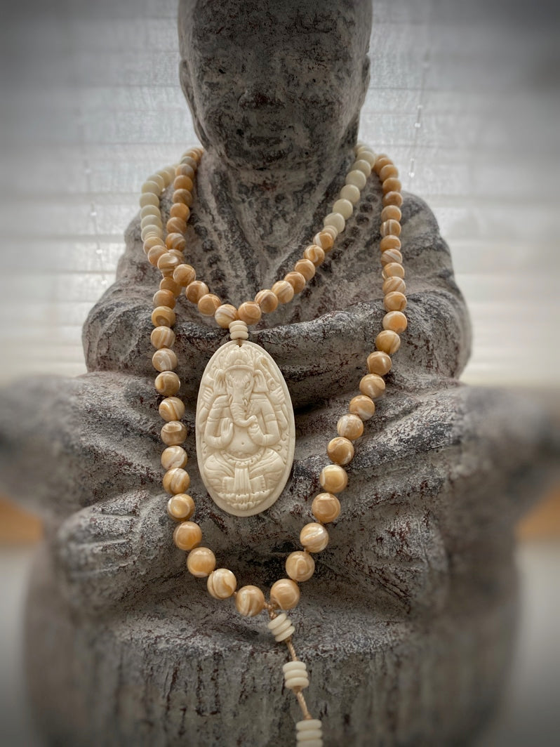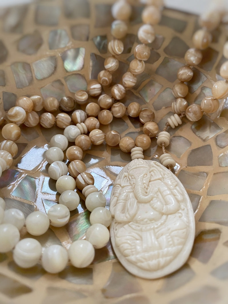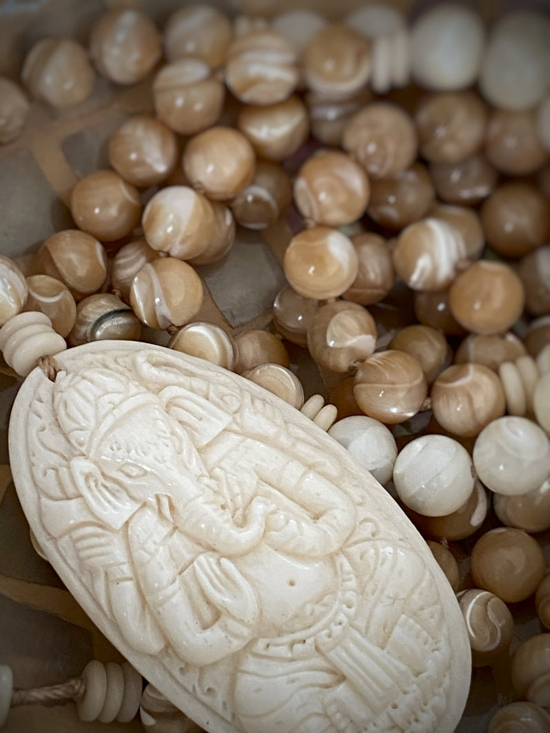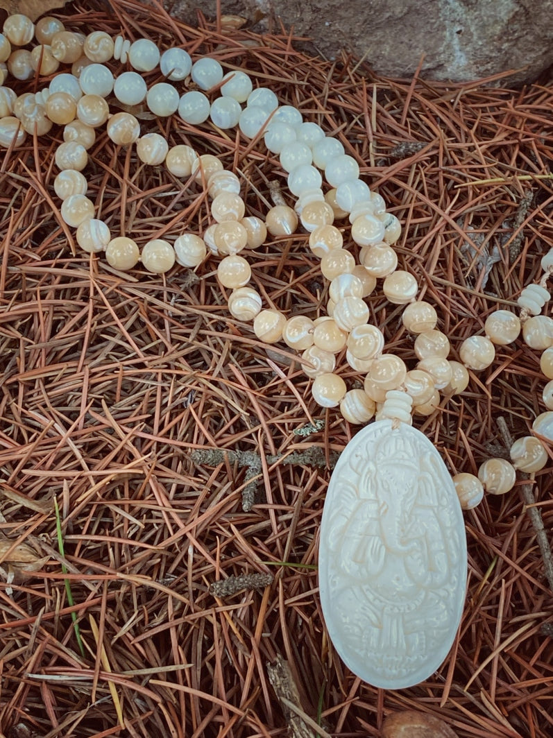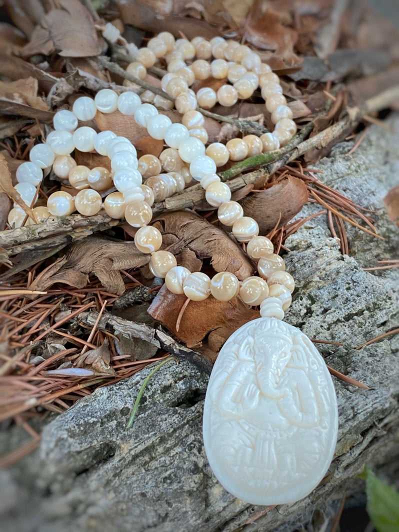 Perlmutt kann melancholische Stimmungen abbauen, die Lebenskräfte wecken, Mut schenken und bei der Lösung von Konflikten helfen. Ganesha ist der hinduistische Gott, der Hindernisse aus dem Weg räumt und Glück bringt.