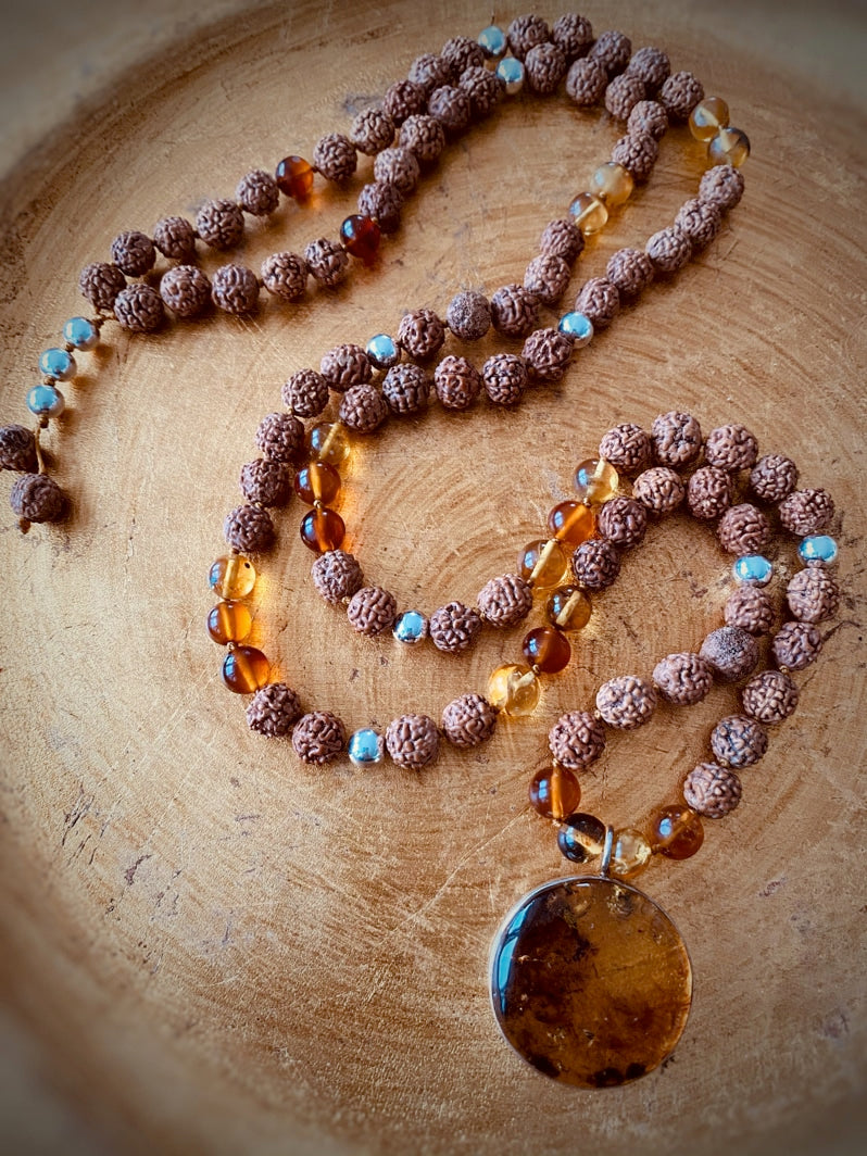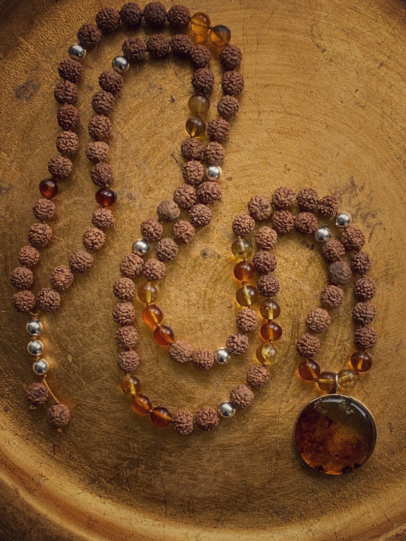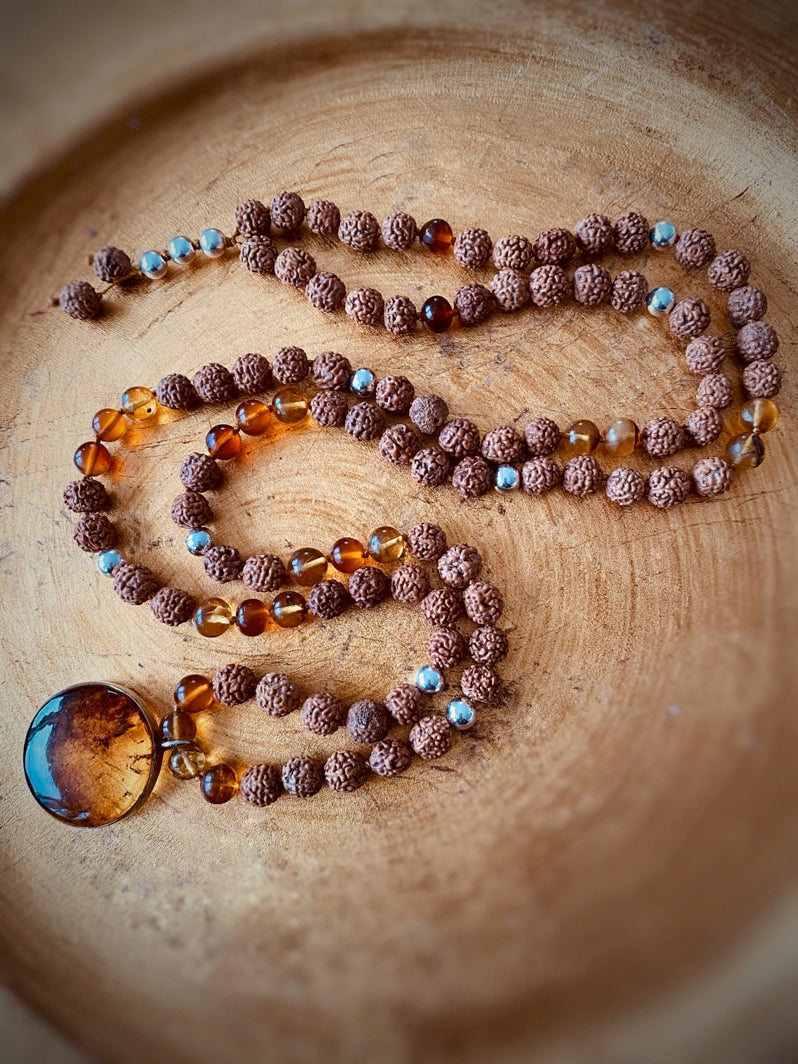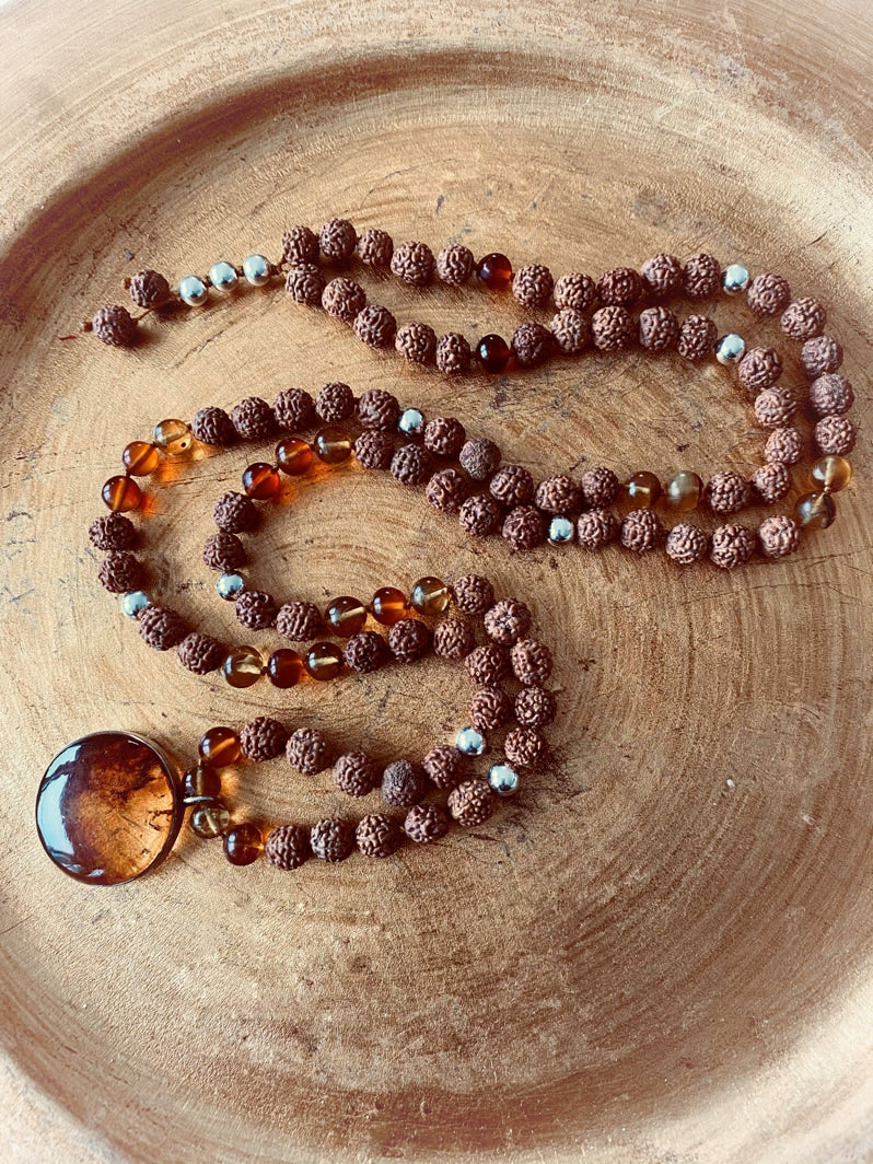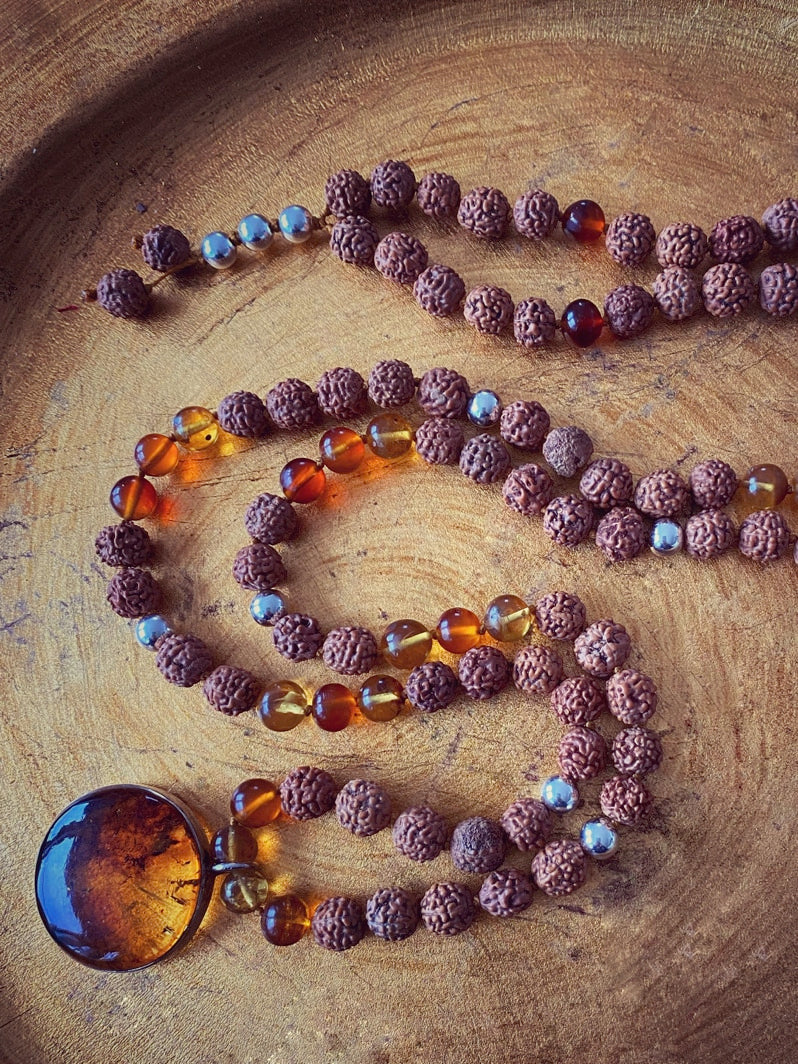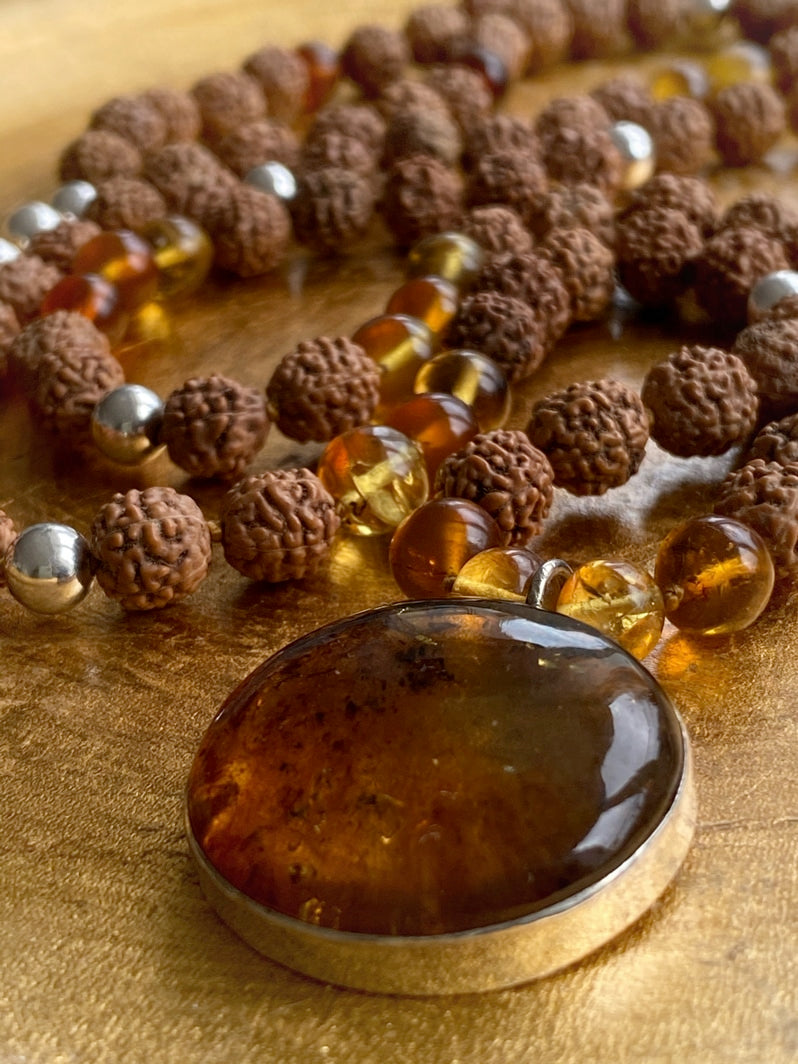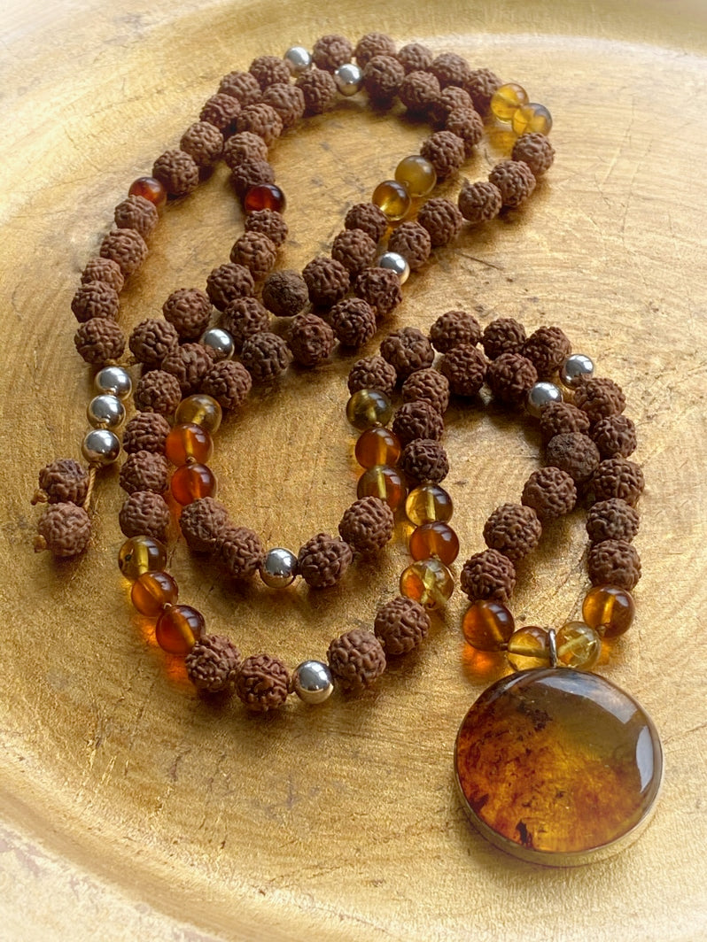Bernstein ist schon immer als besonderer Schutzstein bekannt. Zudem gilt er als Stein der Lebensfreude und des Optimismus. Er soll beruhigend auf die Stimmung wirken und so bei Depressionen und Ängsten Linderung verschaffen. Bernstein weckt die Lebensgeister und sorgt für kreative Ideen. Er fördert durch seine positiven Eigenschaften auch die Flexibilität und die Entscheidungsfreude. Diese wunderbaren Wirkungen des Bernsteins tragen zu einer lebendigeren und attraktiveren Ausstrahlung bei. Rudraksha soll nach der Überlieferung besondere energetische Eigenschaften haben und das Nervensystem beruhigen, in dem die Samen den Blutdruck regulieren. Sie sollen die Fähigkeit haben, die Energie des Trägers zu absorbieren und ihn so umhüllen und vor fremden Energien schützen. So wirken Malas mit Rudraksha-Perlen wie ein Schild gegen negative Energien. So kann man sich auch an fremden Orten mehr heimisch fühlen. Rudraksha ist auch ein bewährter Begleiter auf dem eigenen spirituellen Weg, wirkt unterstützend und kann helfen, sich auf das Wesentliche zu fokussieren. Die Kombination aus Bernstein und Rudraksha ist sehr außergewöhnlich und besonders kraftvoll, auch dadurch dass die verwendeten Bernstein-Elemente von drei verschiedenen Kontinenten stammen.