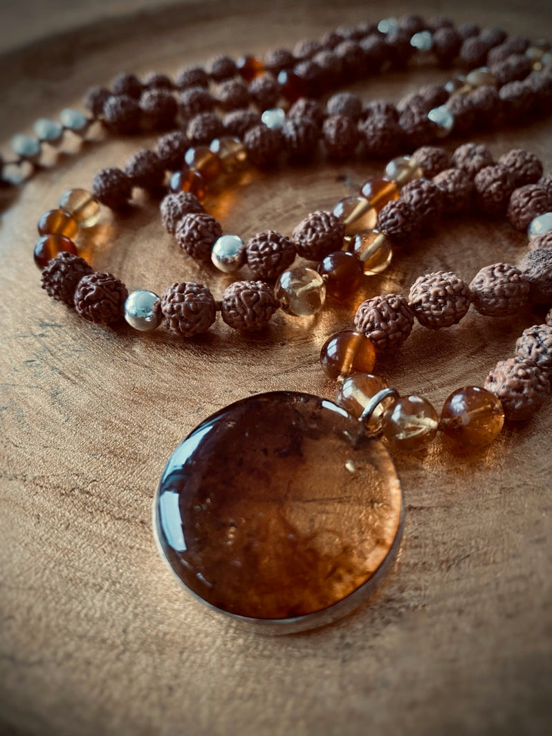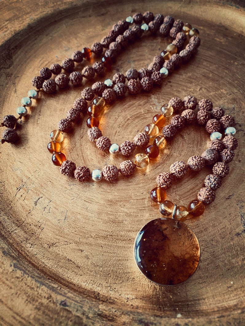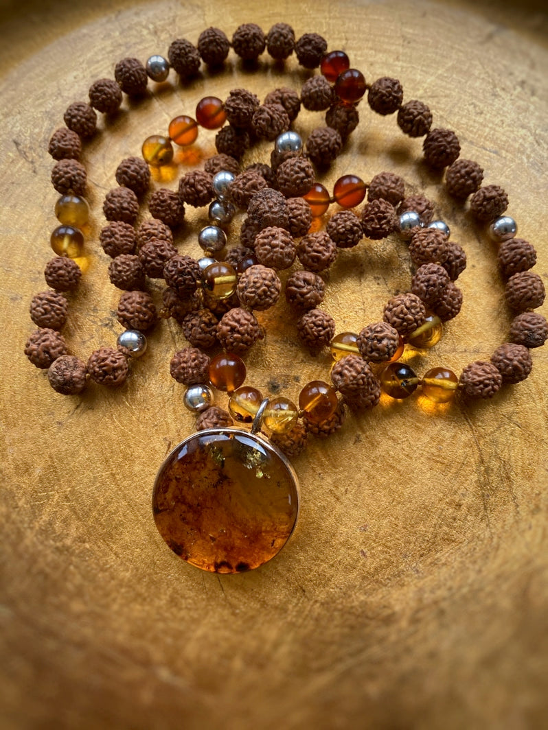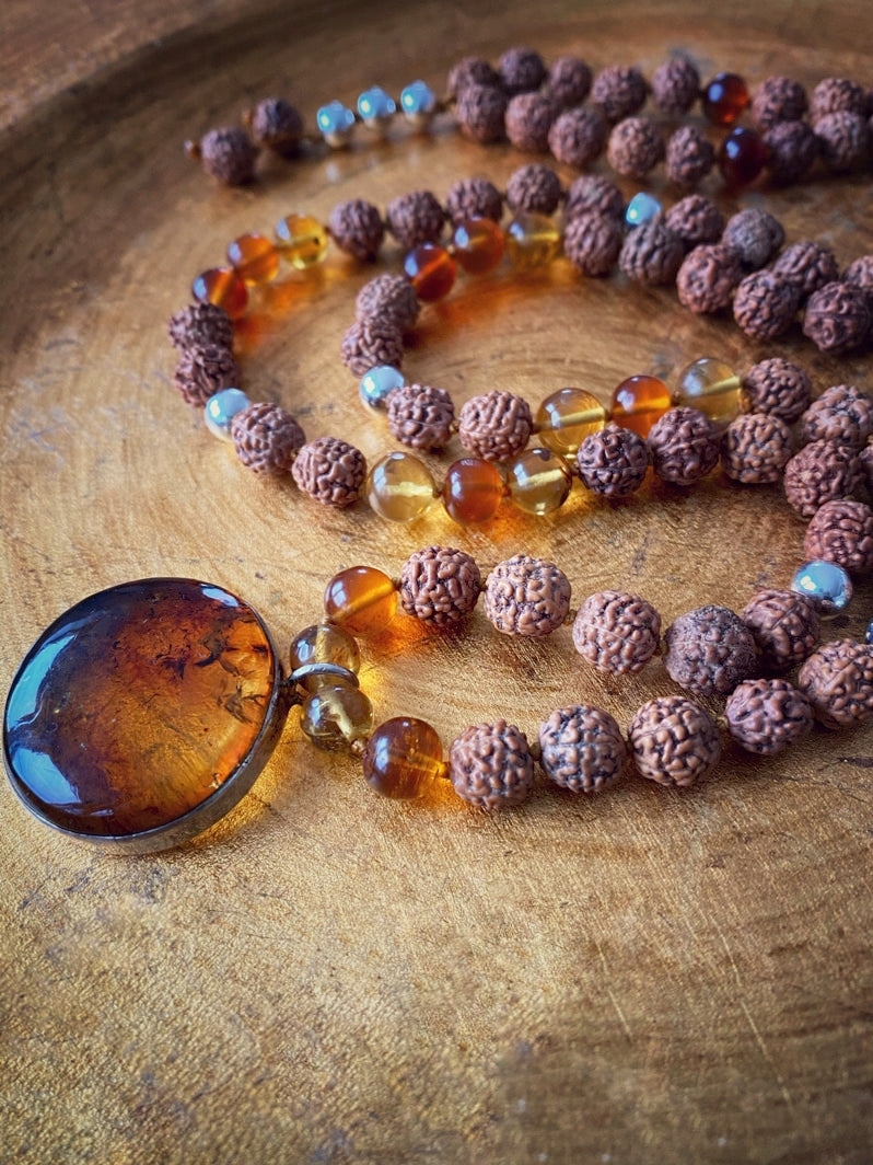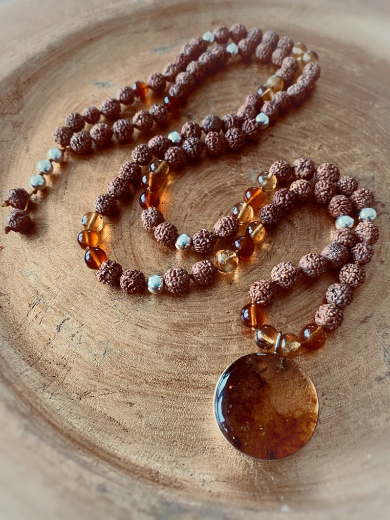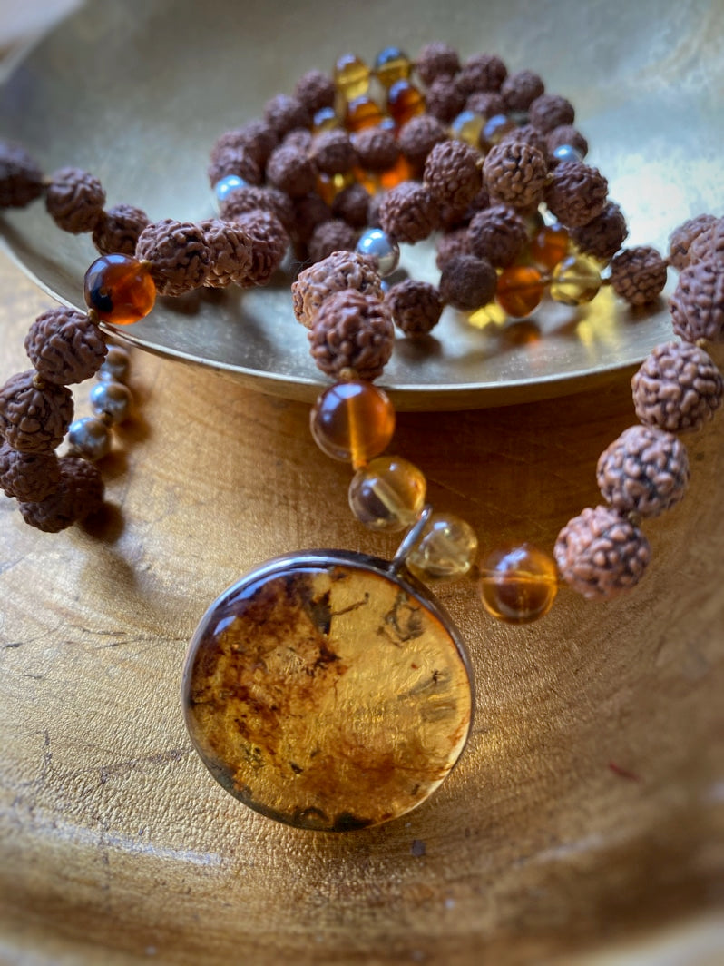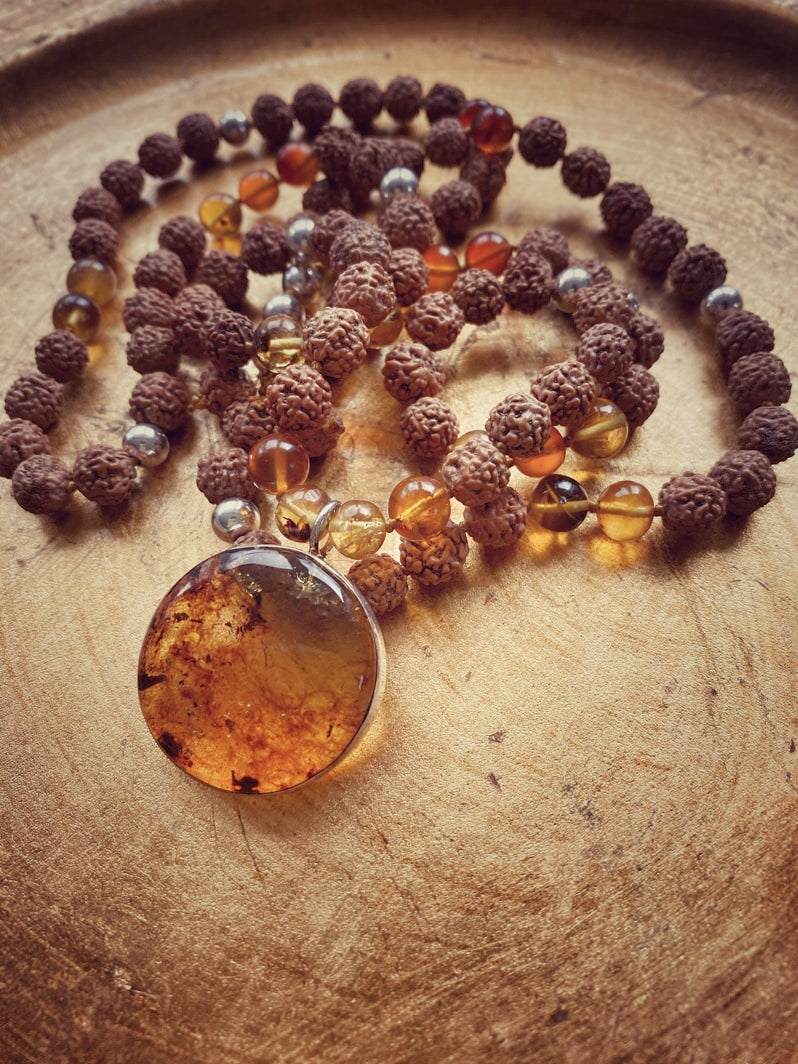 Bernstein ist schon immer als besonderer Schutzstein bekannt. Zudem gilt er als Stein der Lebensfreude und des Optimismus. Er soll beruhigend auf die Stimmung wirken und so bei Depressionen und Ängsten Linderung verschaffen. Bernstein weckt die Lebensgeister und sorgt für kreative Ideen. Er fördert durch seine positiven Eigenschaften auch die Flexibilität und die Entscheidungsfreude. Diese wunderbaren Wirkungen des Bernsteins tragen zu einer lebendigeren und attraktiveren Ausstrahlung bei. Rudraksha soll nach der Überlieferung besondere energetische Eigenschaften haben und das Nervensystem beruhigen, in dem die Samen den Blutdruck regulieren. Sie sollen die Fähigkeit haben, die Energie des Trägers zu absorbieren und ihn so umhüllen und vor fremden Energien schützen. So wirken Malas mit Rudraksha-Perlen wie ein Schild gegen negative Energien. So kann man sich auch an fremden Orten mehr heimisch fühlen. Rudraksha ist auch ein bewährter Begleiter auf dem eigenen spirituellen Weg, wirkt unterstützend und kann helfen, sich auf das Wesentliche zu fokussieren. Die Kombination aus Bernstein und Rudraksha ist sehr außergewöhnlich und besonders kraftvoll, auch dadurch dass die verwendeten Bernstein-Elemente von drei verschiedenen Kontinenten stammen.