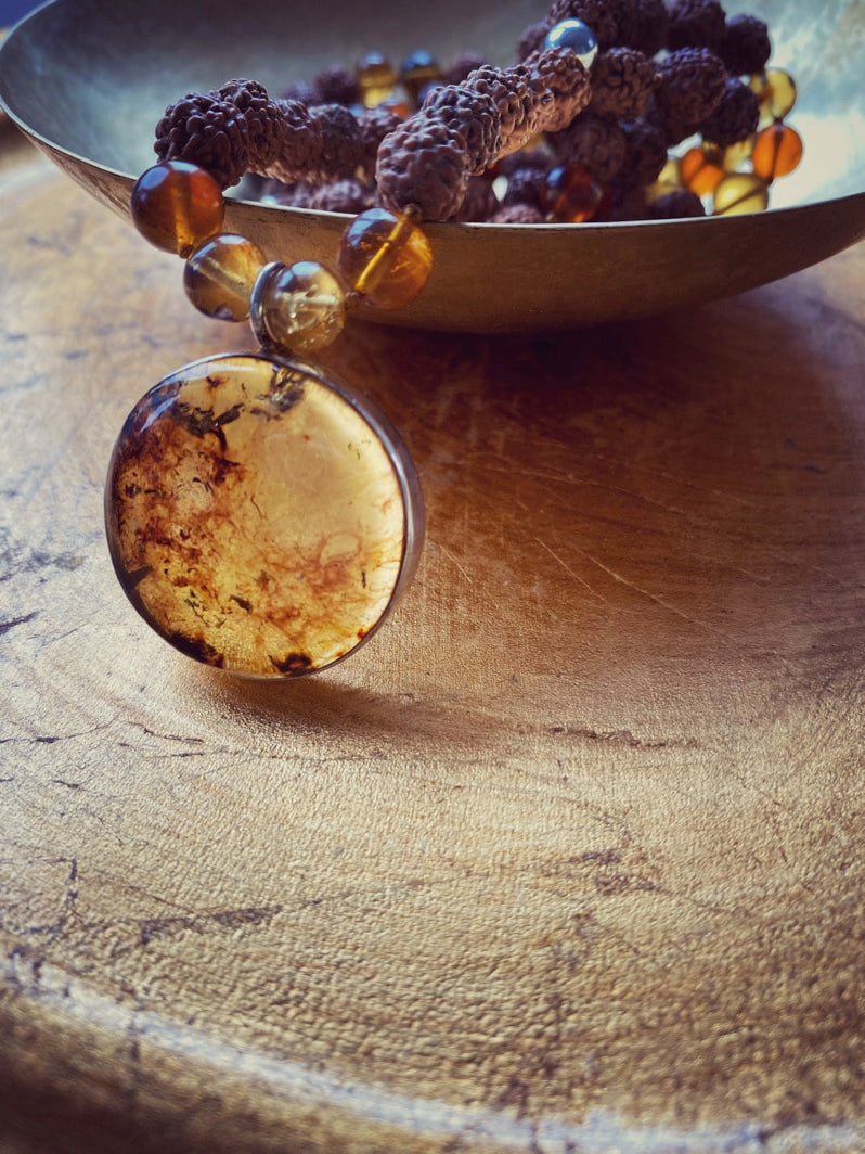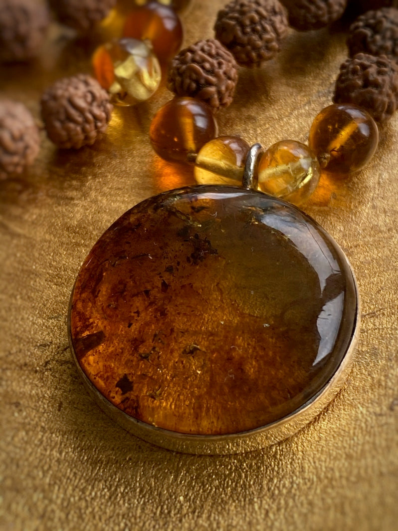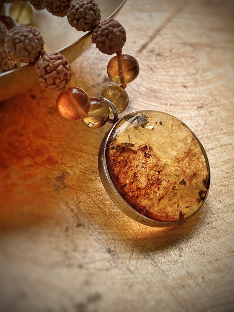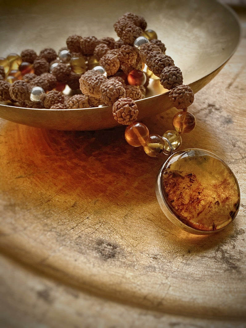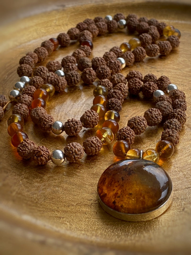 Perlen: Thailändische helle Bernsteinperlen 7mm, Baltische dunkle Bernsteinperlen 7mm, Rudraksha 8mm