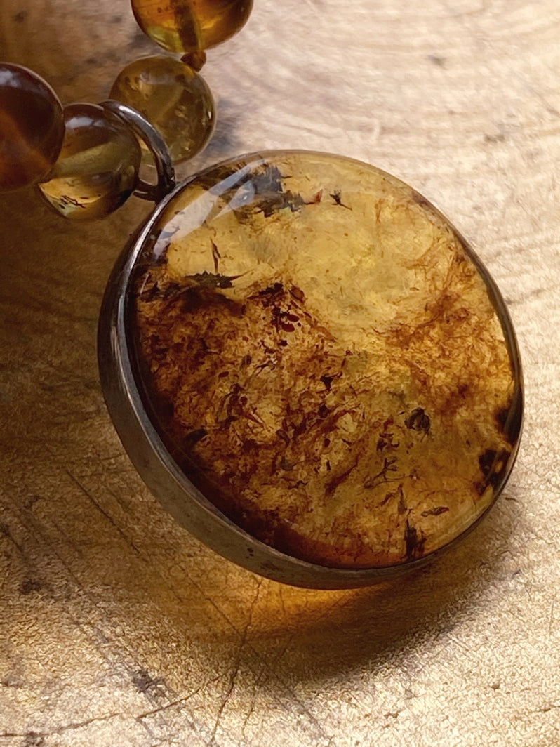 Abschluss: Bernstein-Medaillon aus Mexiko handgefasst in Silber in Indien