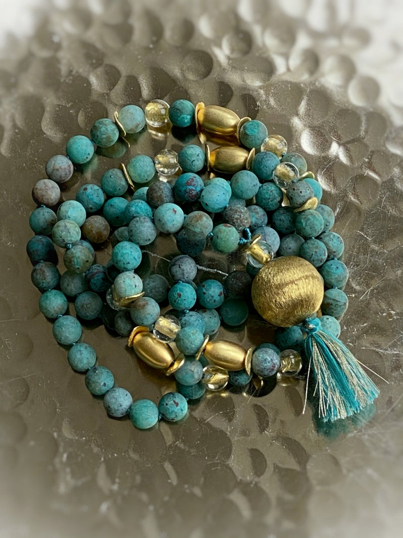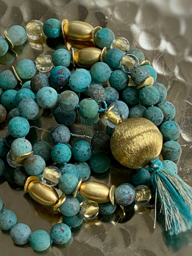 Abschluss: Goldfoil-Glasperle, Stoffbezogene Gold-Kugel, türkisfarbene Miniquaste mit Goldfäden