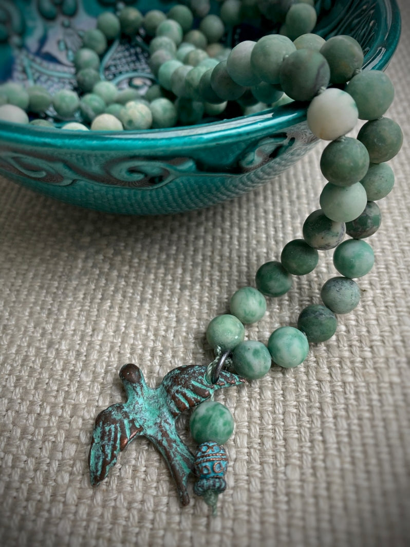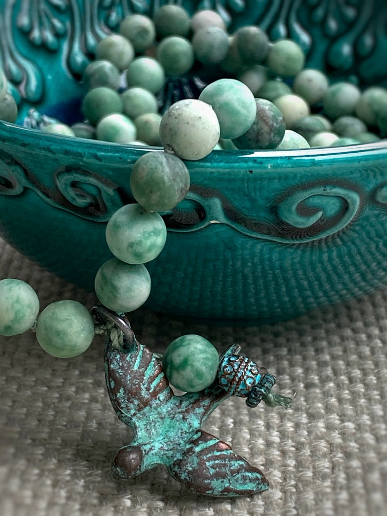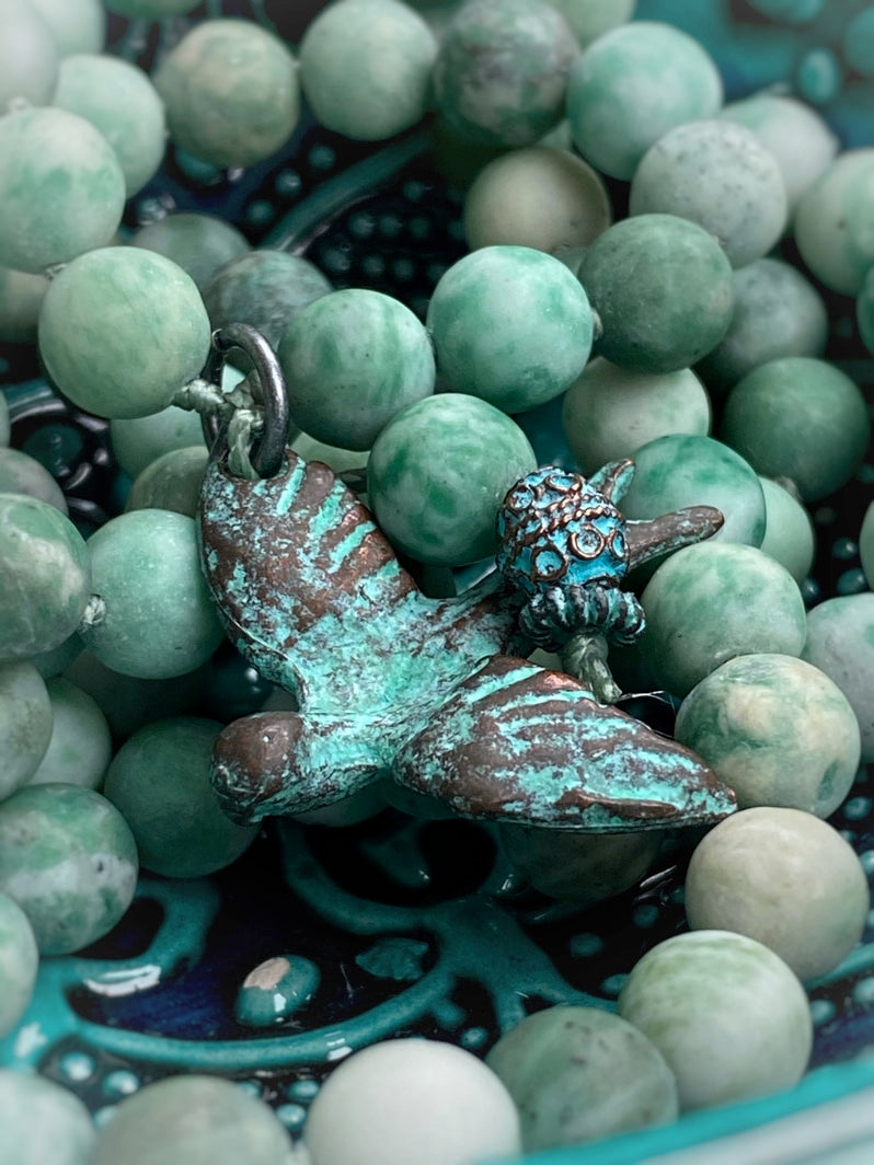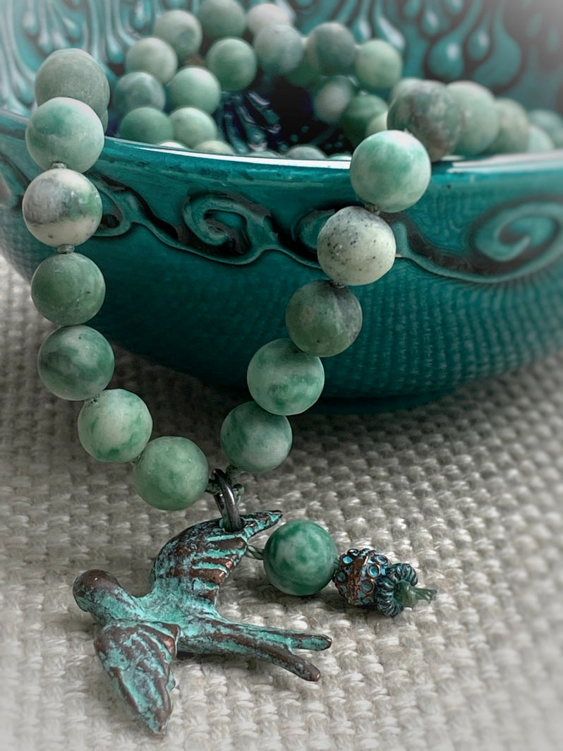 Abschluss: Schwalbe aus Kupfer mit Patina und Jadeperle mit patinierten Kupferelementen