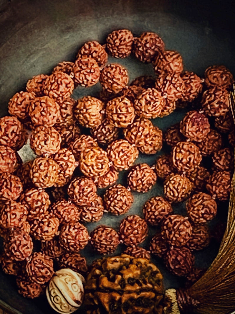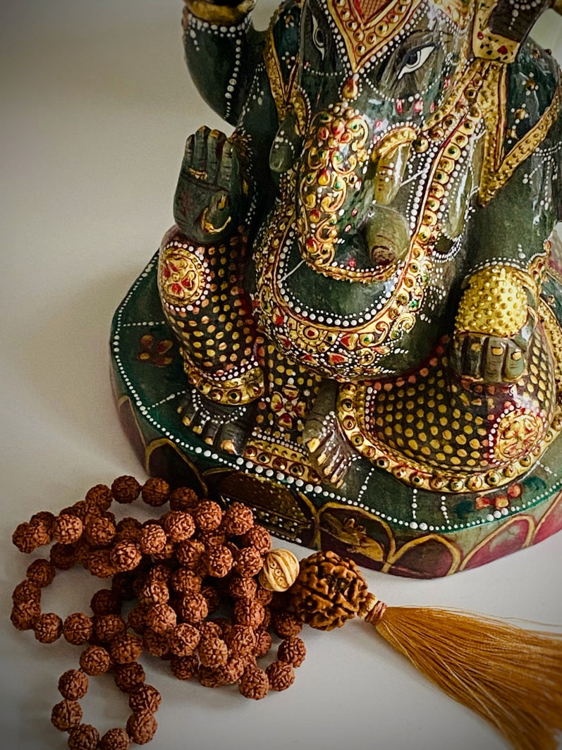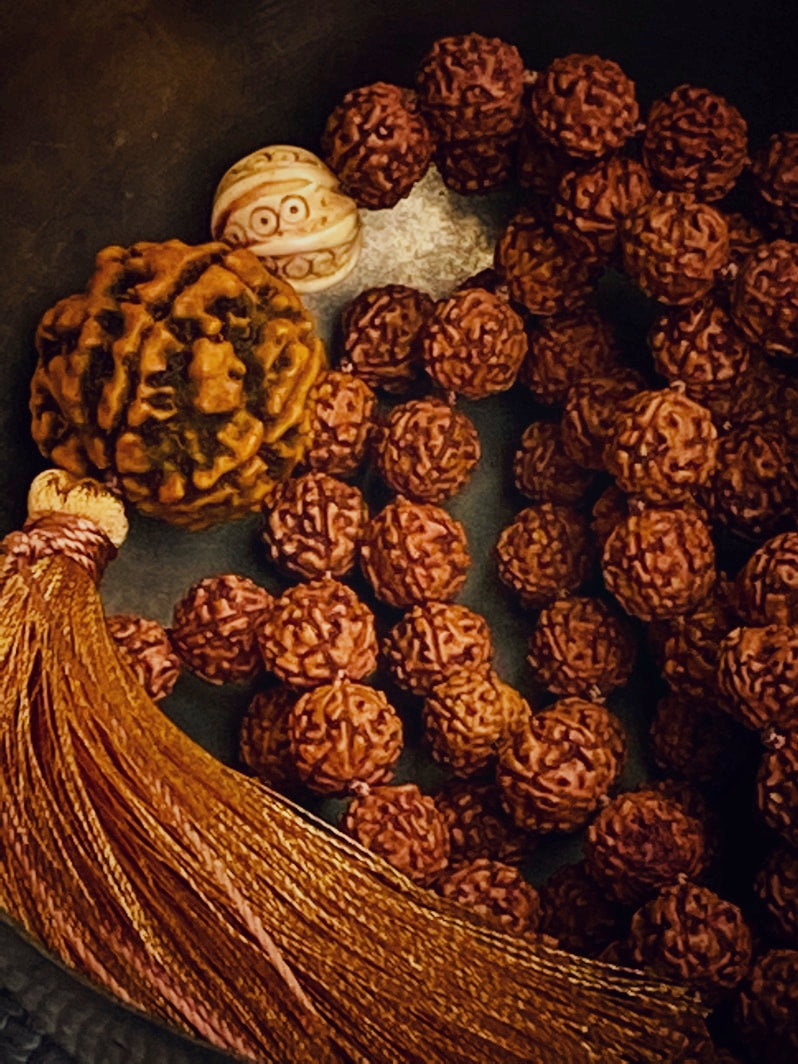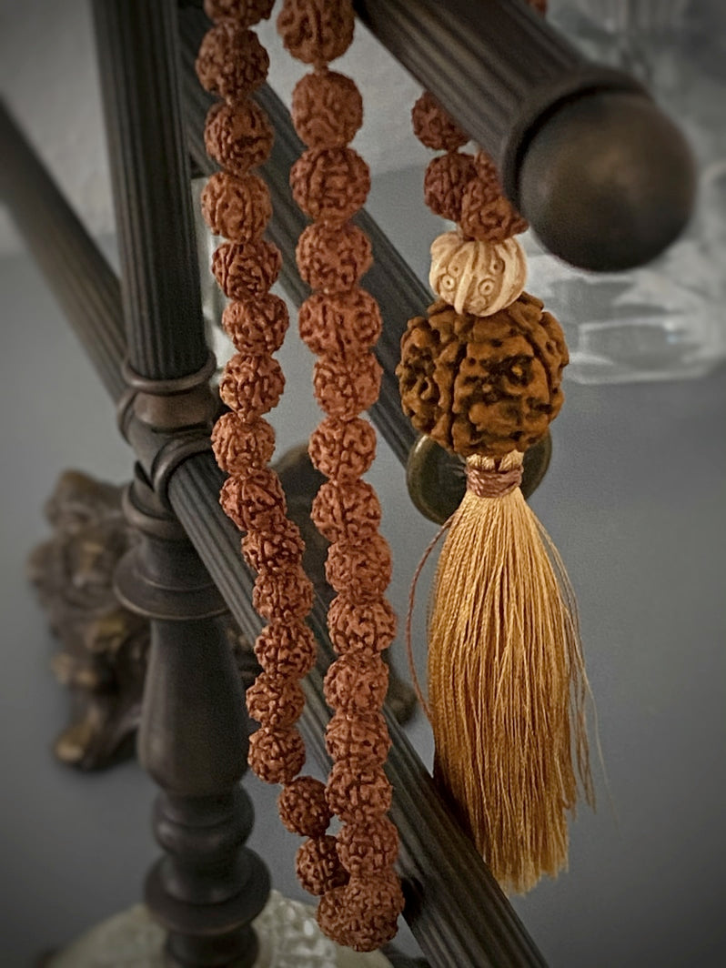 Ein Klassiker unter den Malas: Rudraksha-Mala mit goldener Quaste