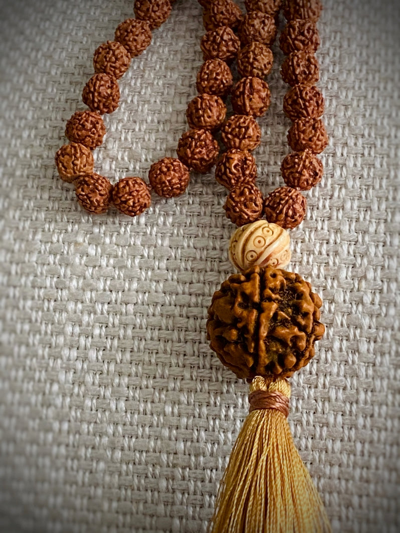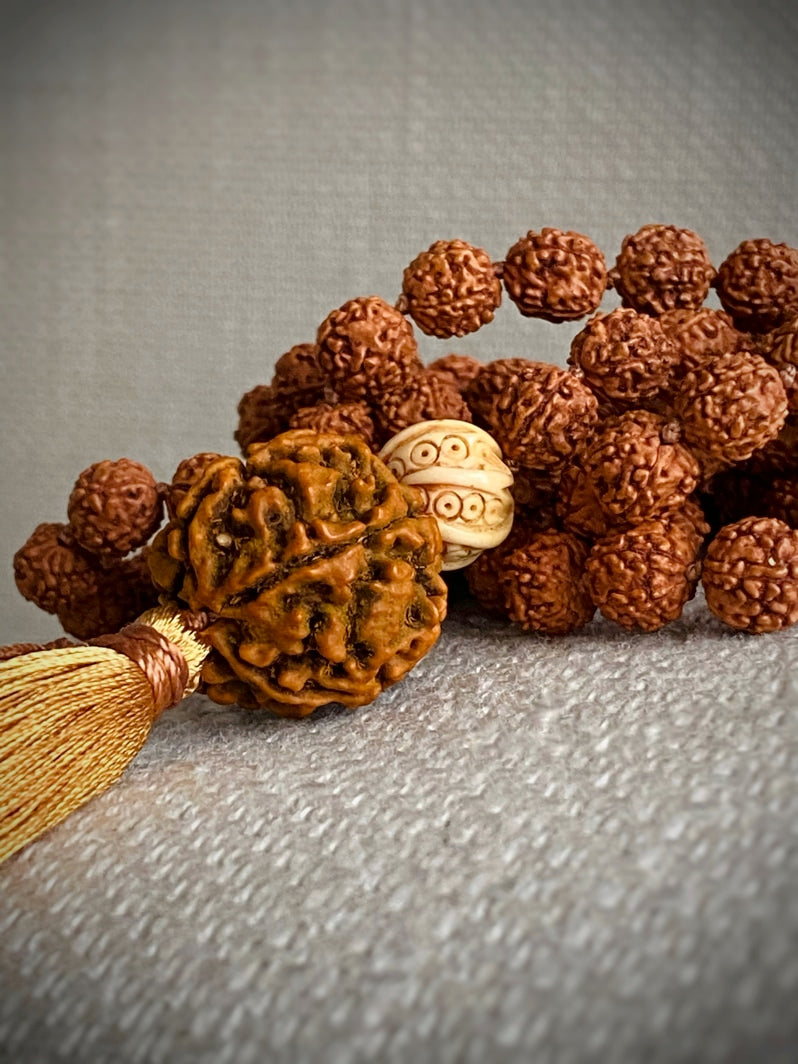 Abschluss: Große Rudraksha mit geschnitzter und gravierter Knochenperle aus Tibet und goldfarbener Quaste