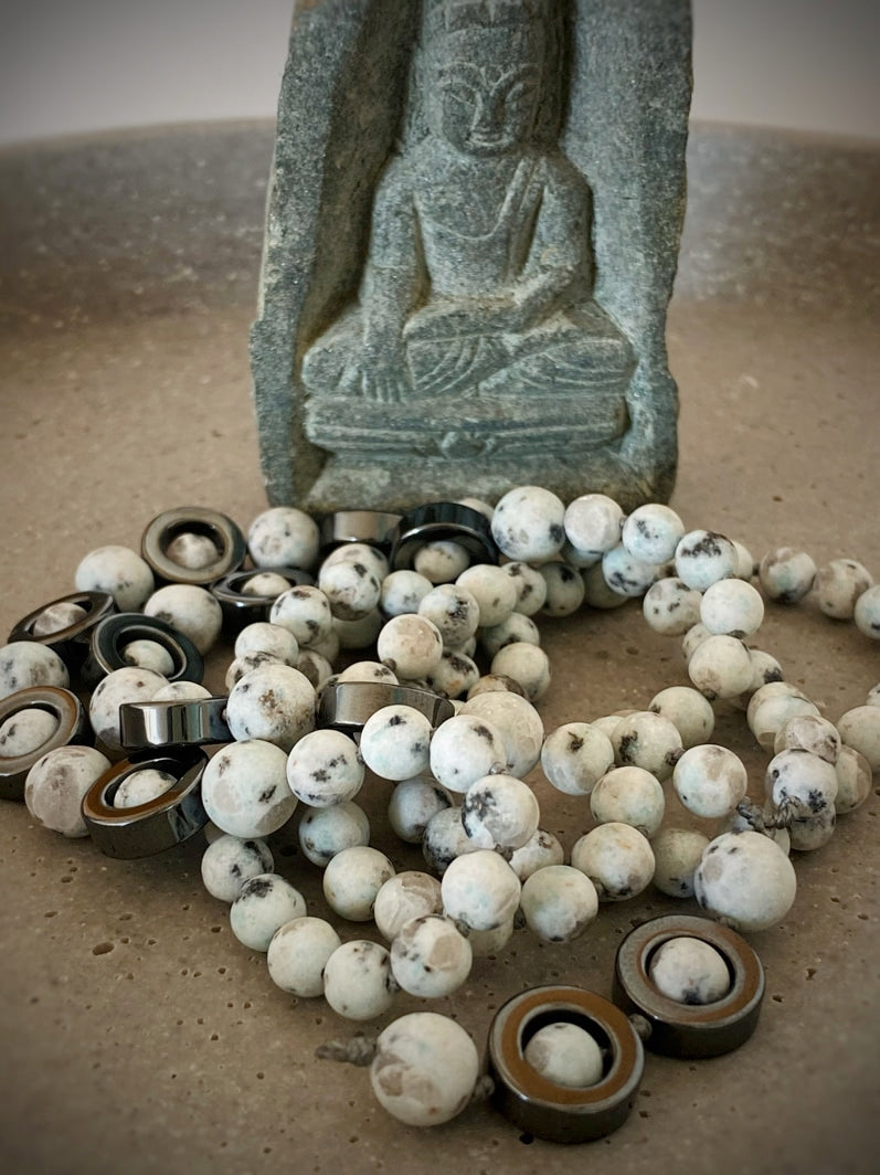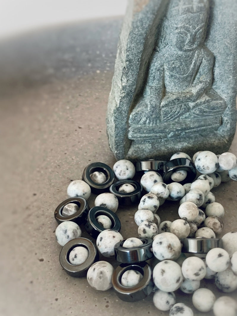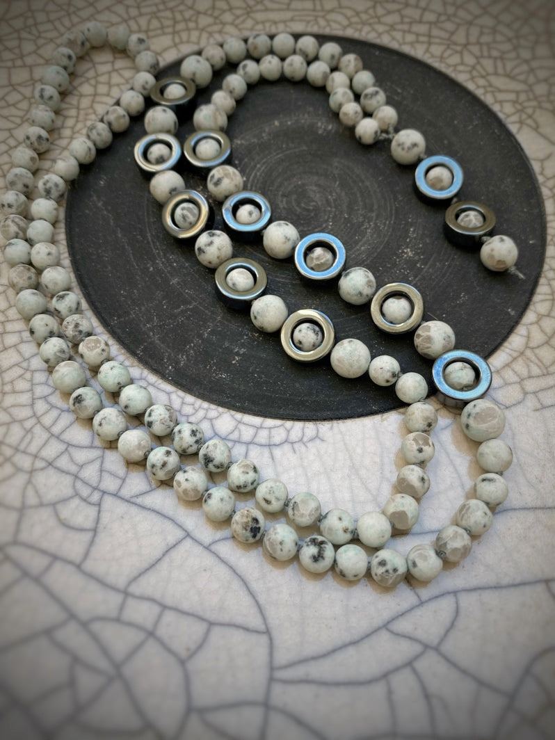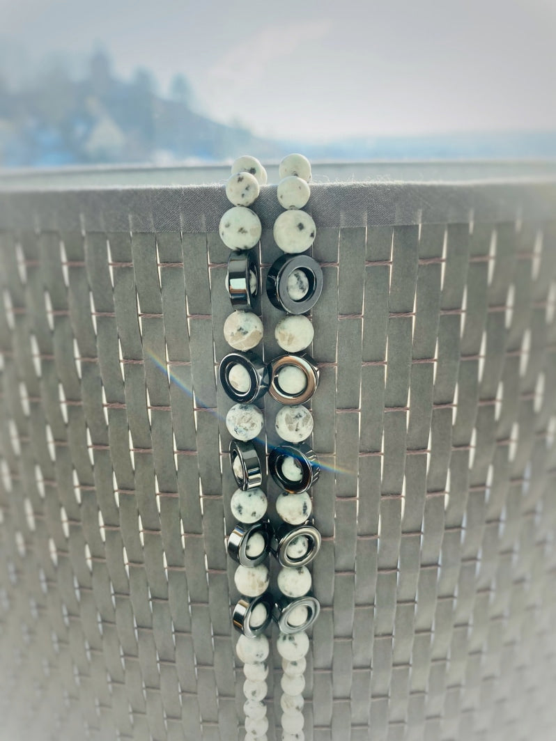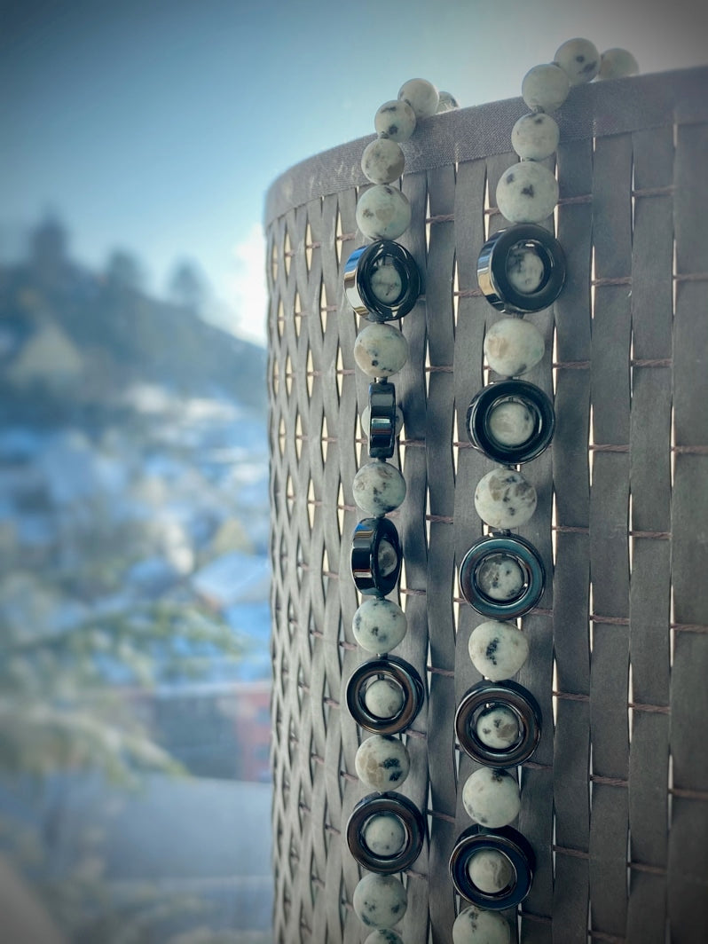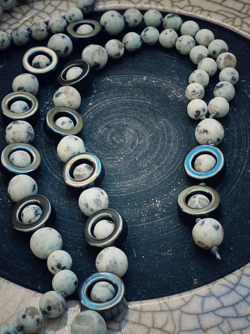 Abschluss: Hämatit-Rahmenringe mit Sky Mountain Blue Jaspis 6mm