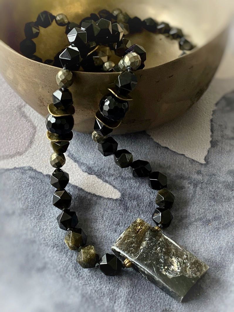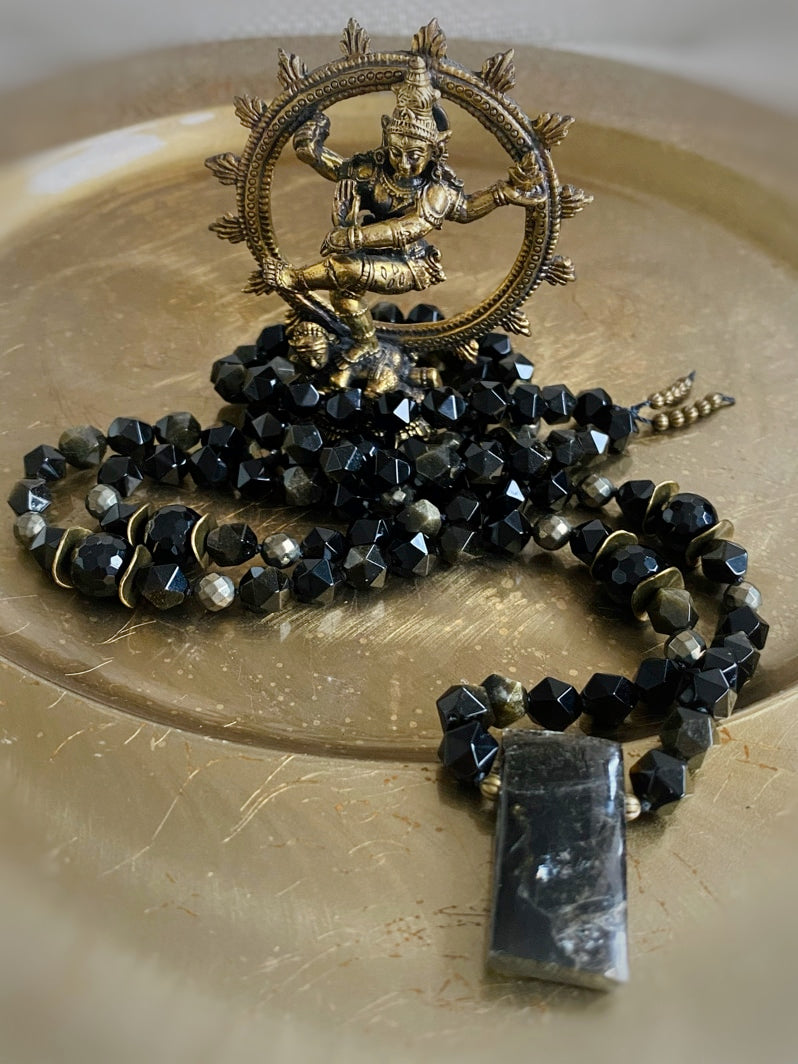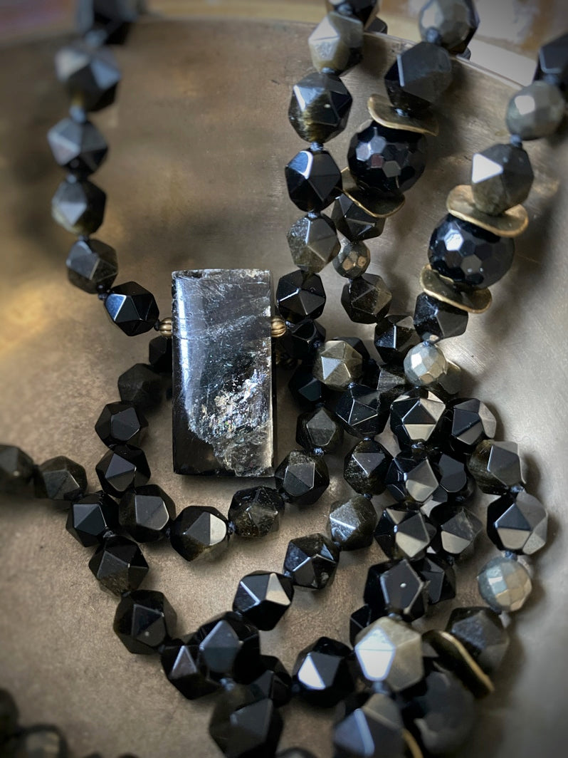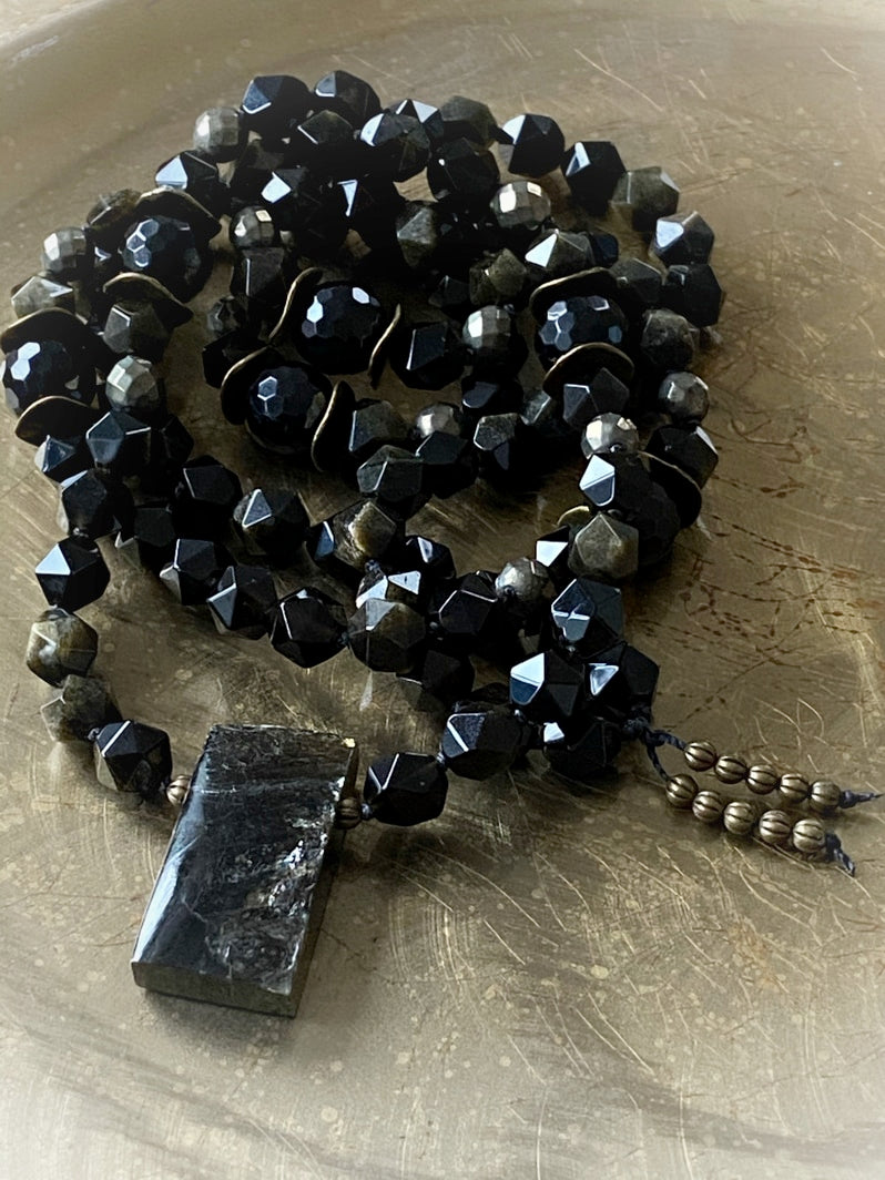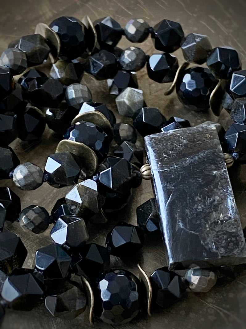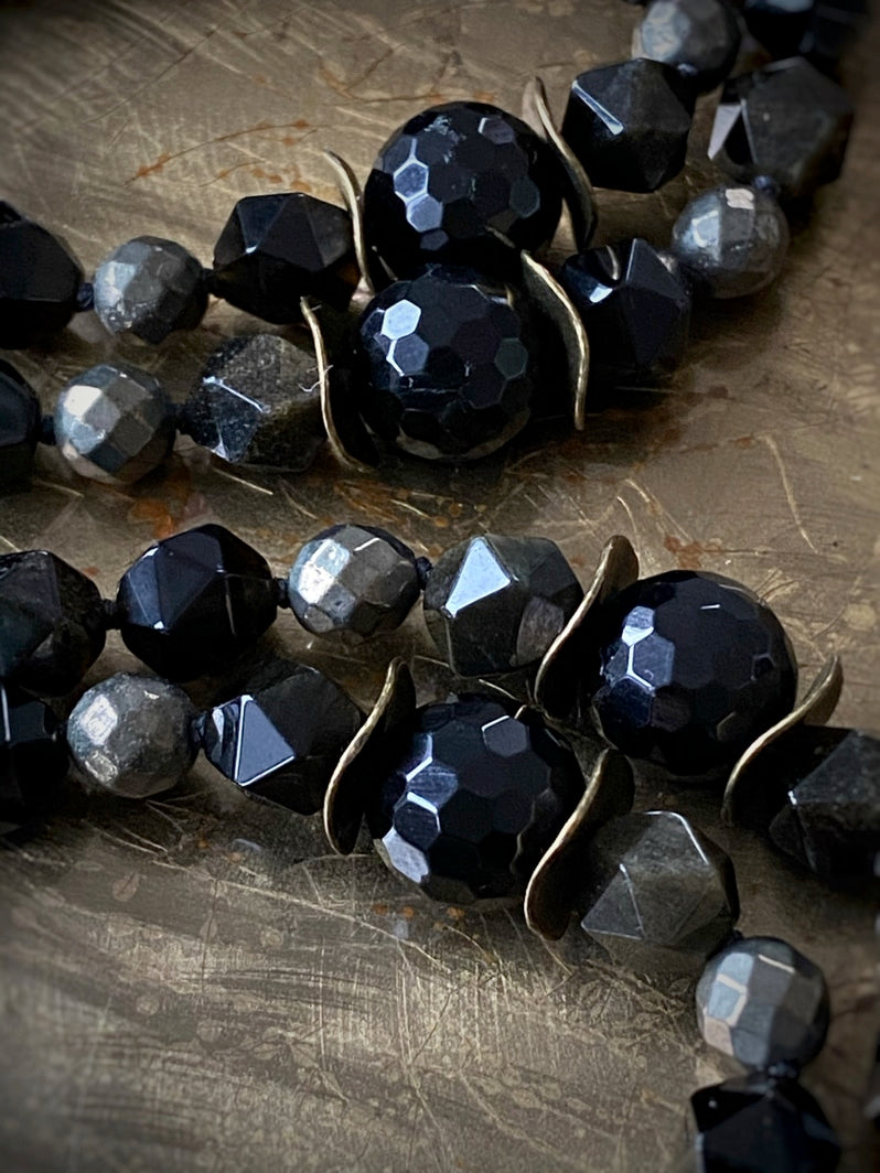 Marker: Schwarze fein-facettierte Turmalinperlen 12mm eingerahmt von gewellten Messingscheiben, flankiert von facettierten Pyrit-Perlen 6mm