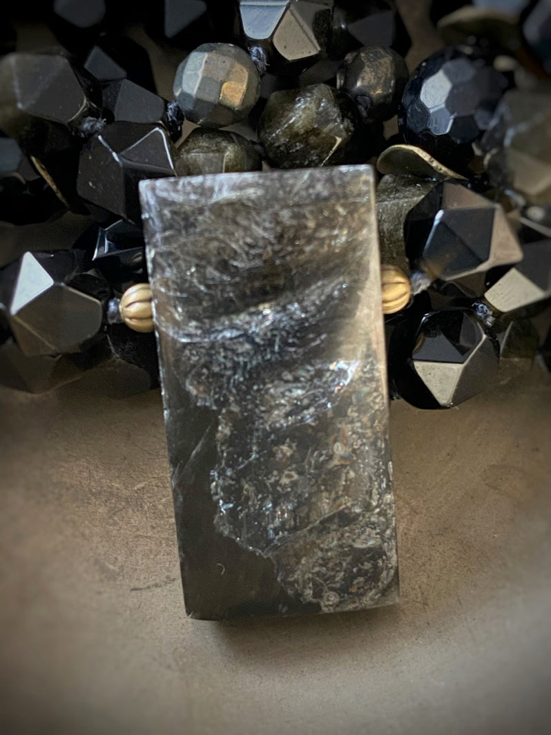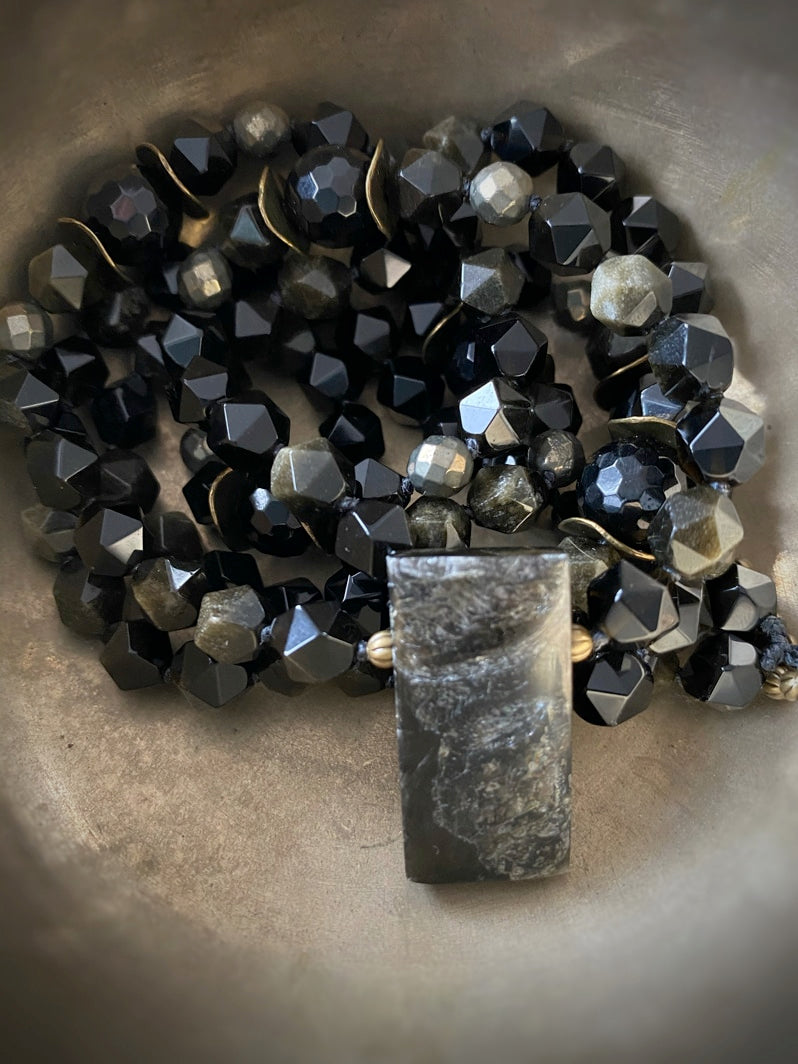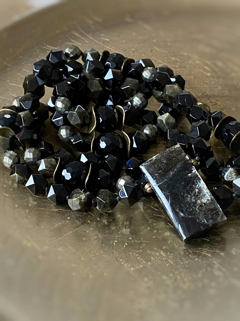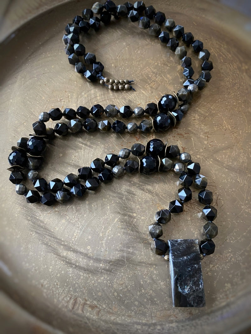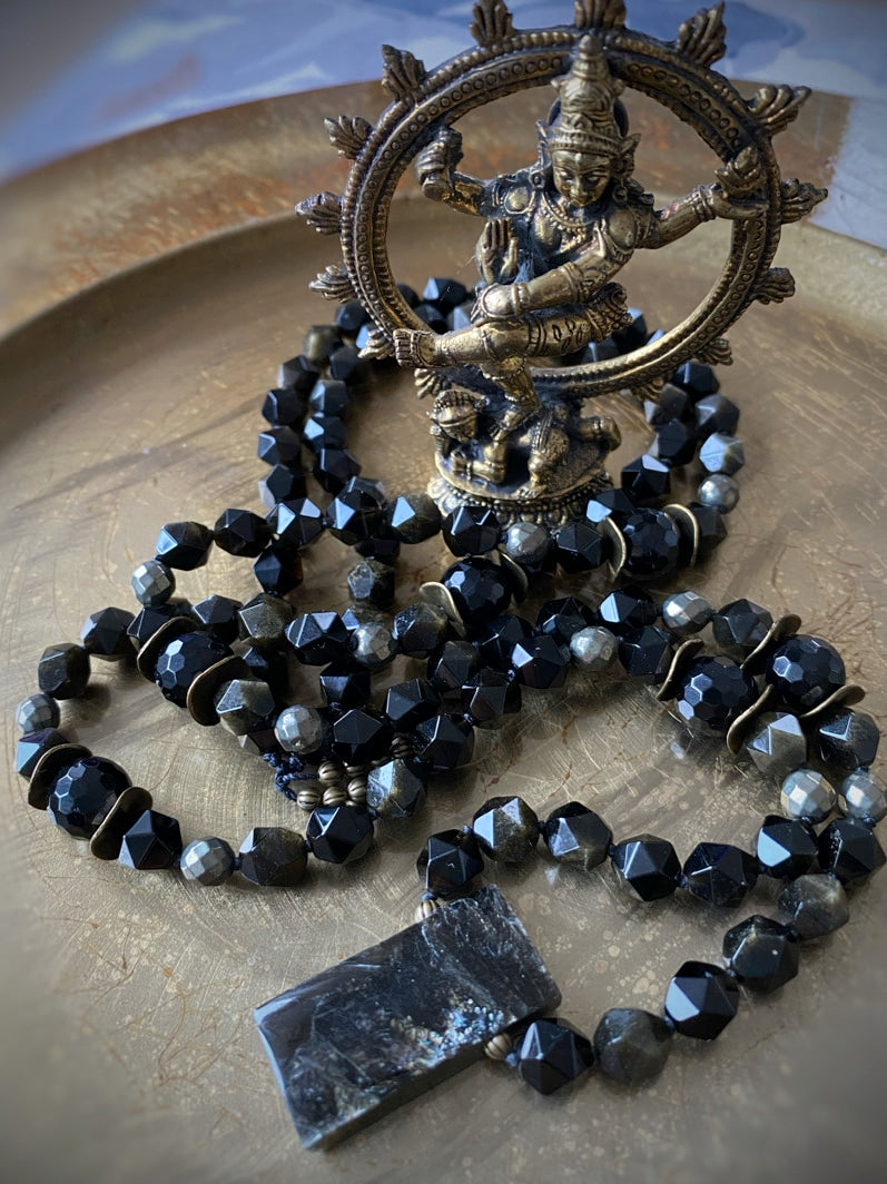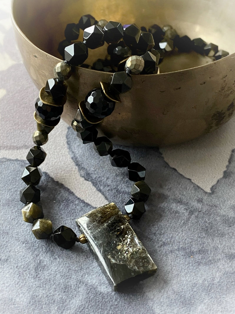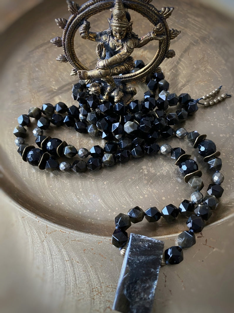 Marker: Schwarze fein-facettierte Turmalinperlen 12mm eingerahmt von gewellten Messingscheiben, flankiert von facettierten Pyrit-Perlen 6mm