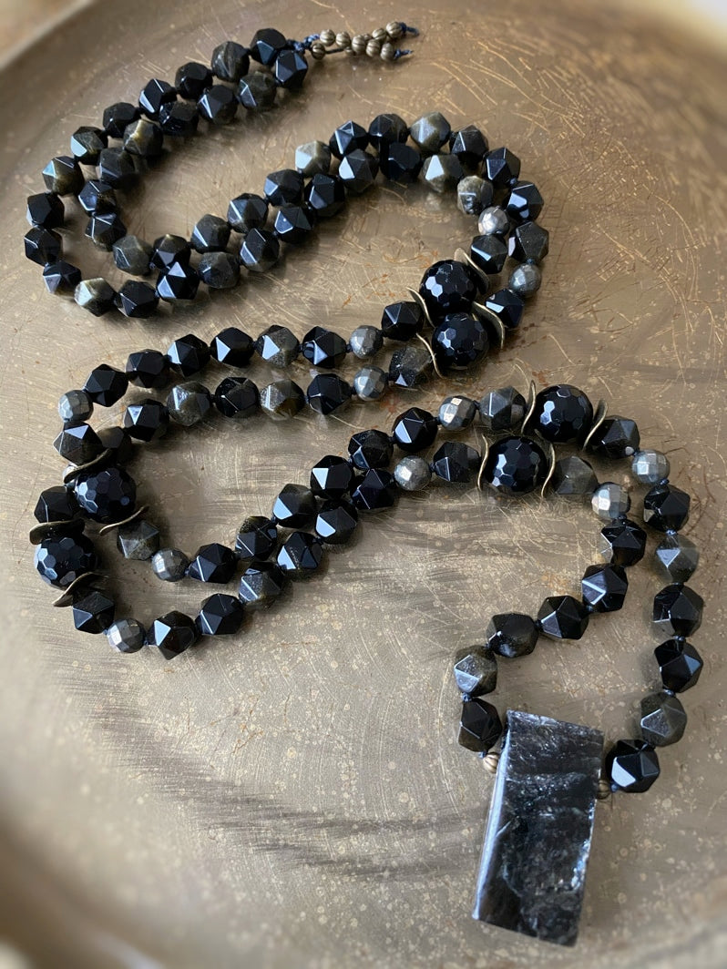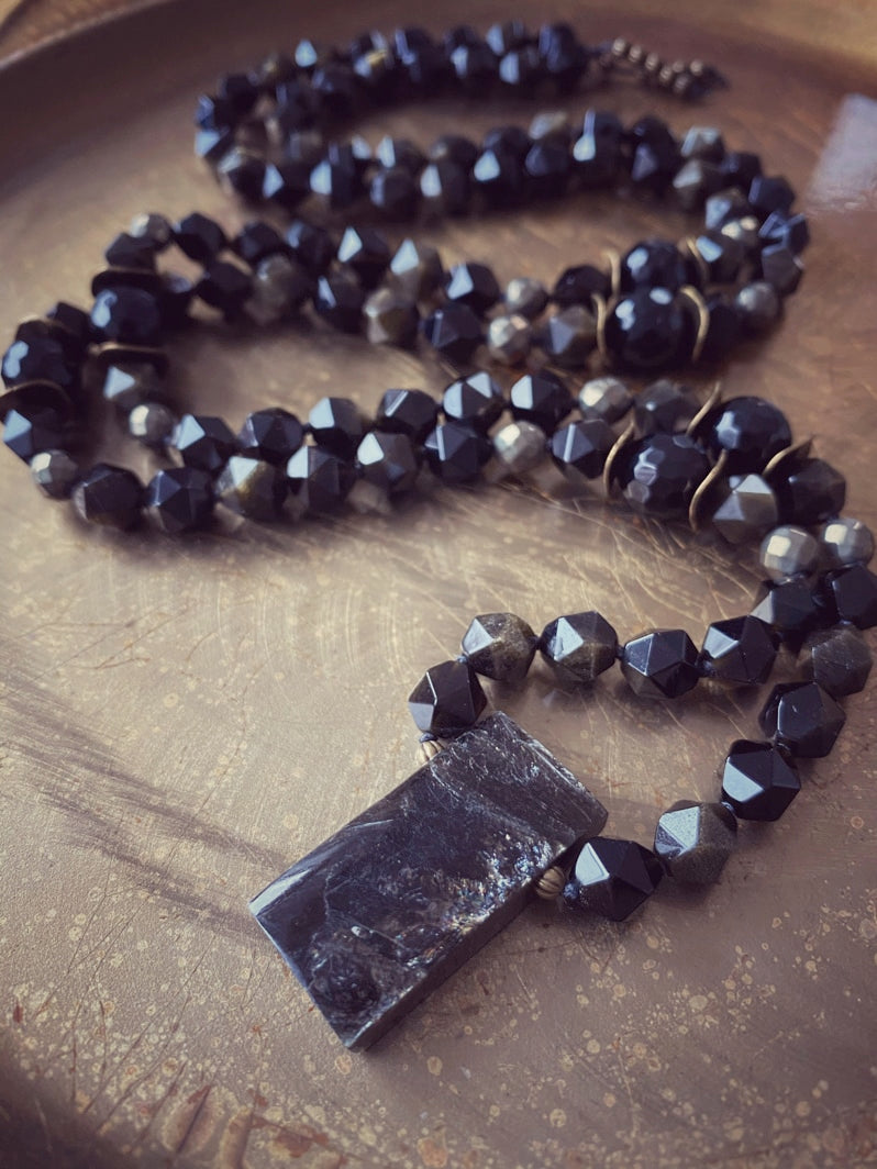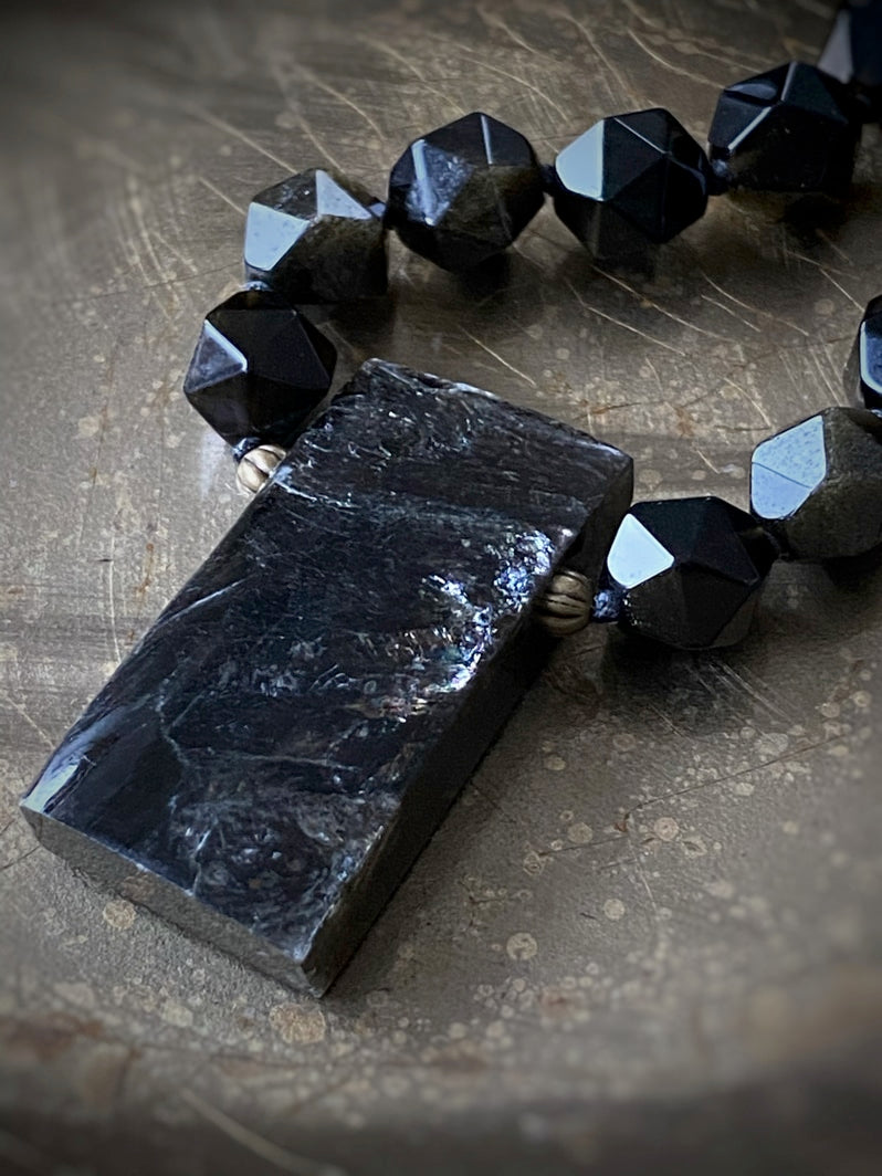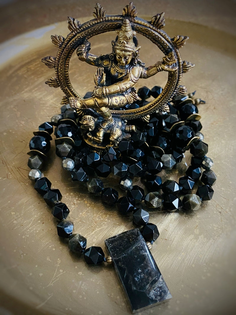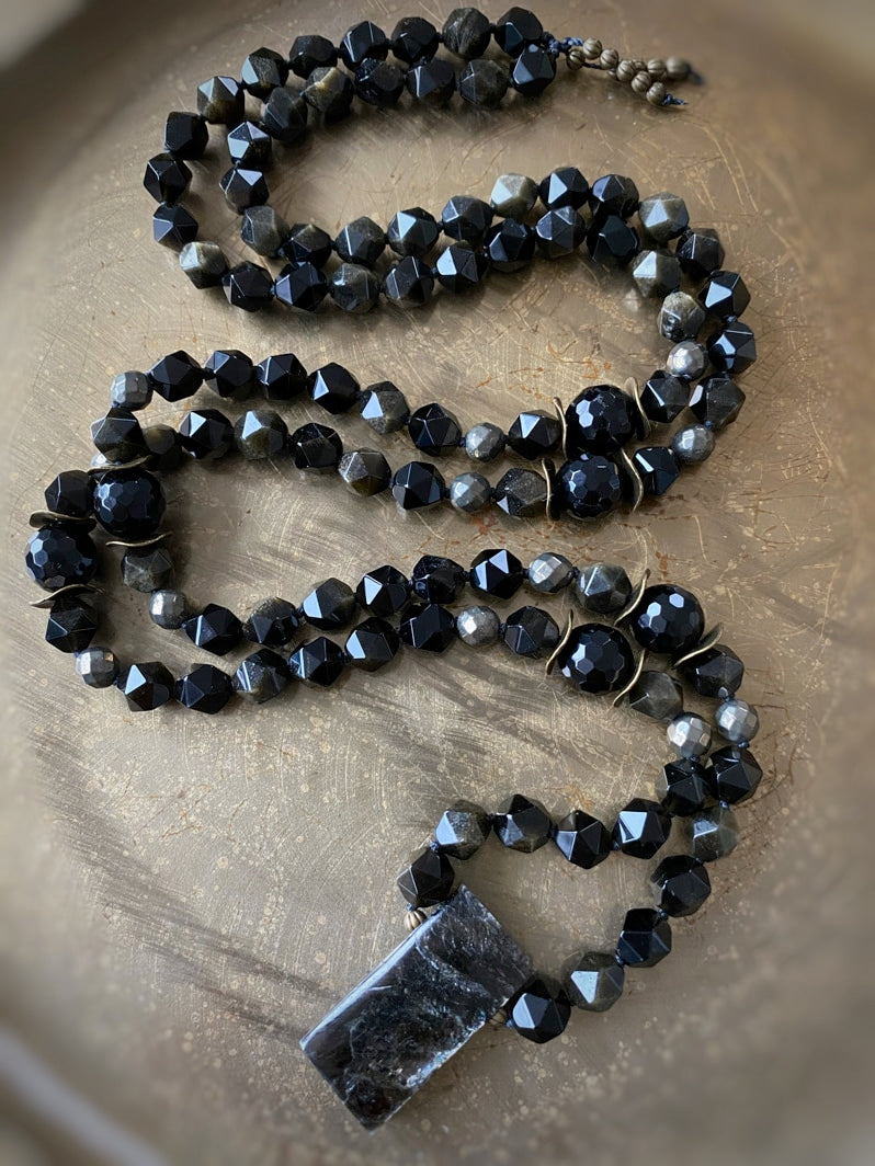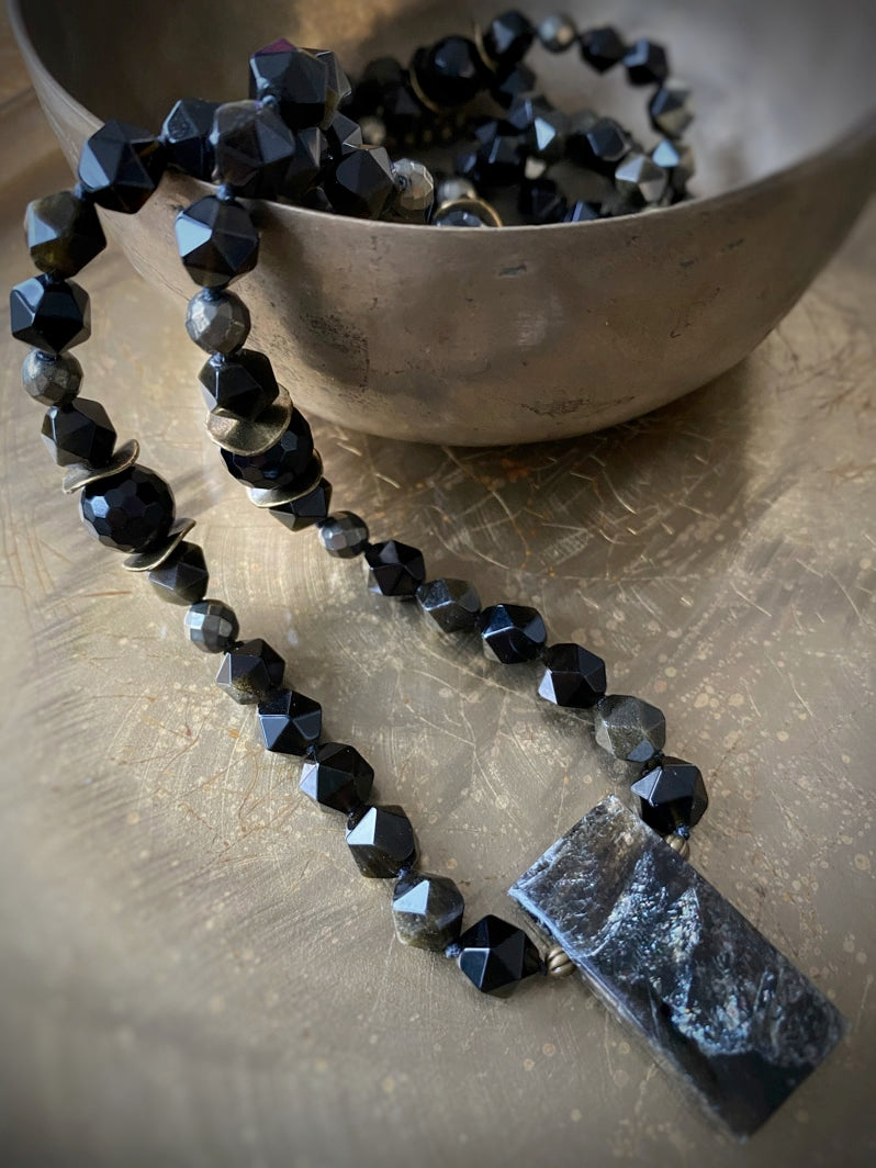 Marker: Schwarze fein-facettierte Turmalinperlen 12mm eingerahmt von gewellten Messingscheiben, flankiert von facettierten Pyrit-Perlen 6mm