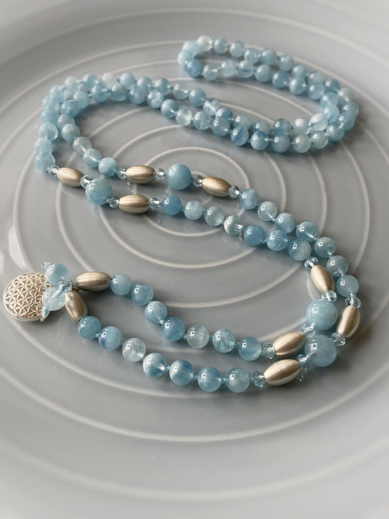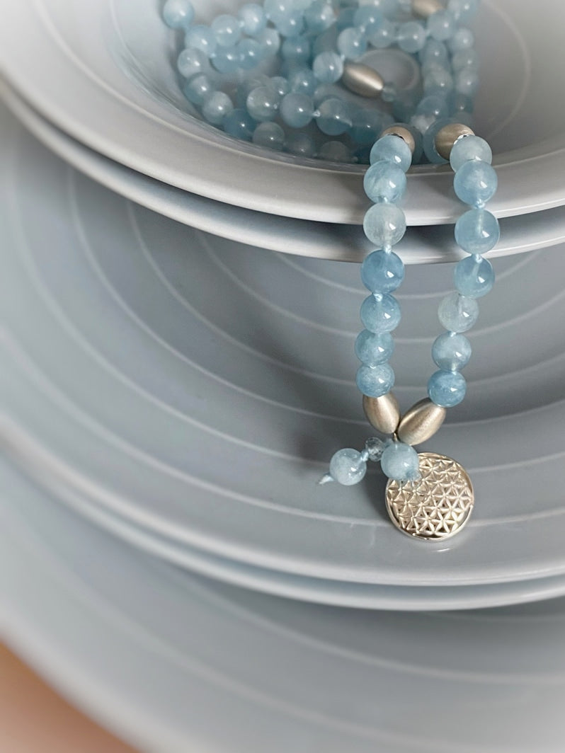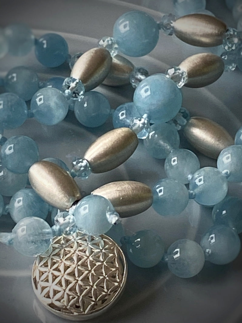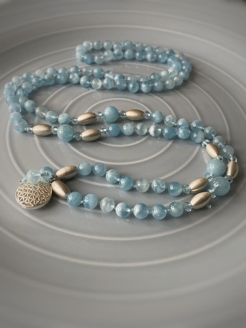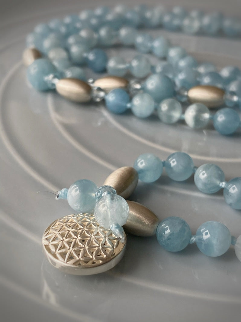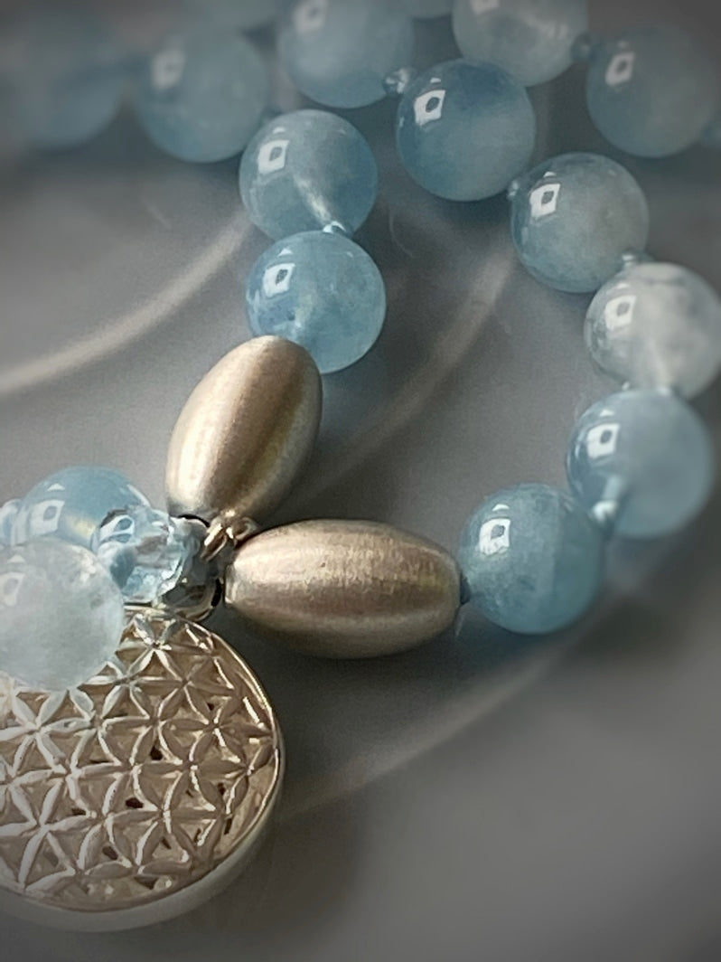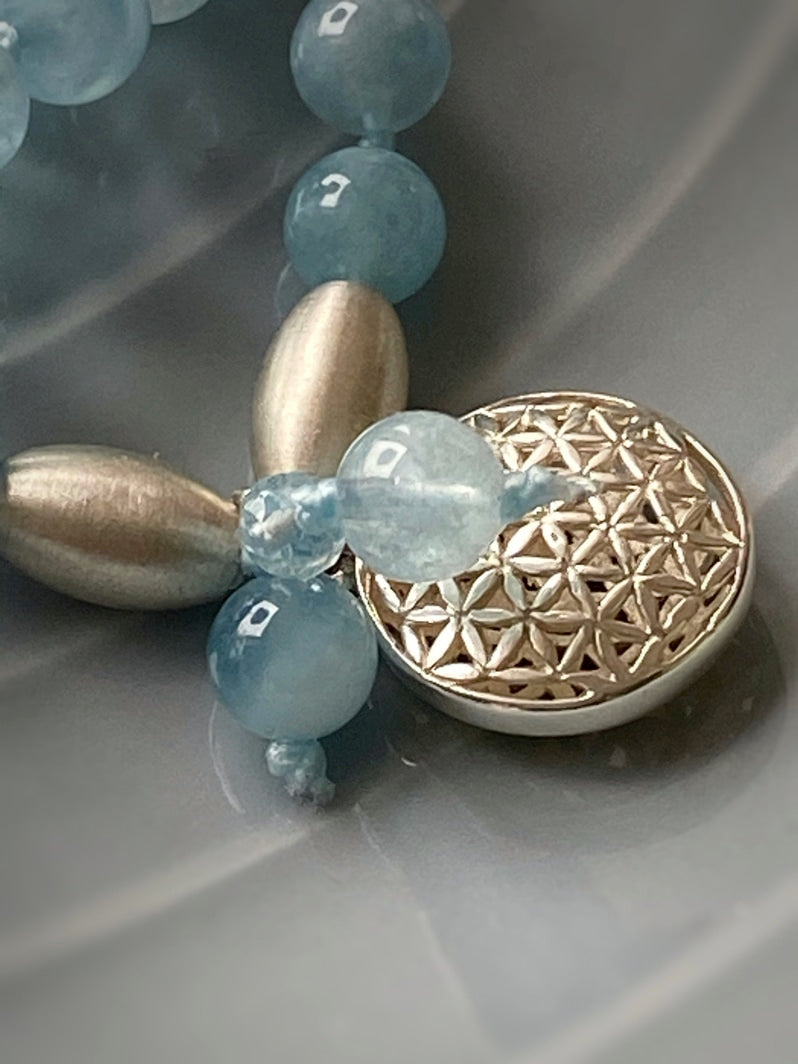 Abschluss: Blume des Lebens in Silber mit Aquamarinperlen und -rondell