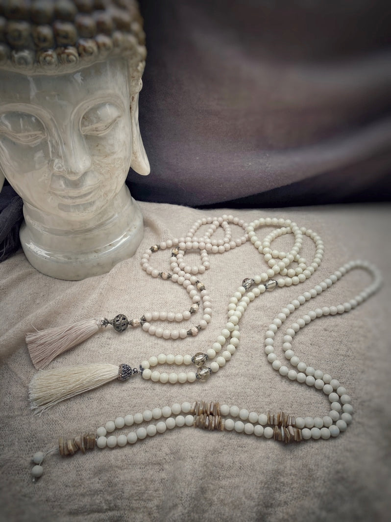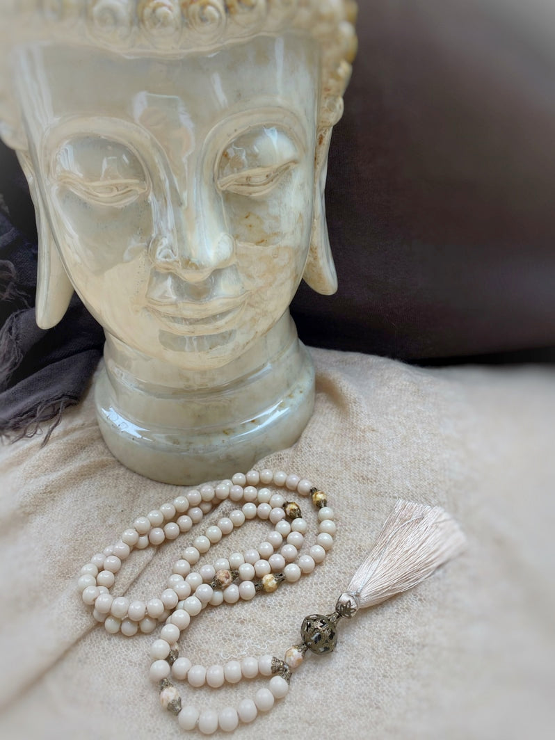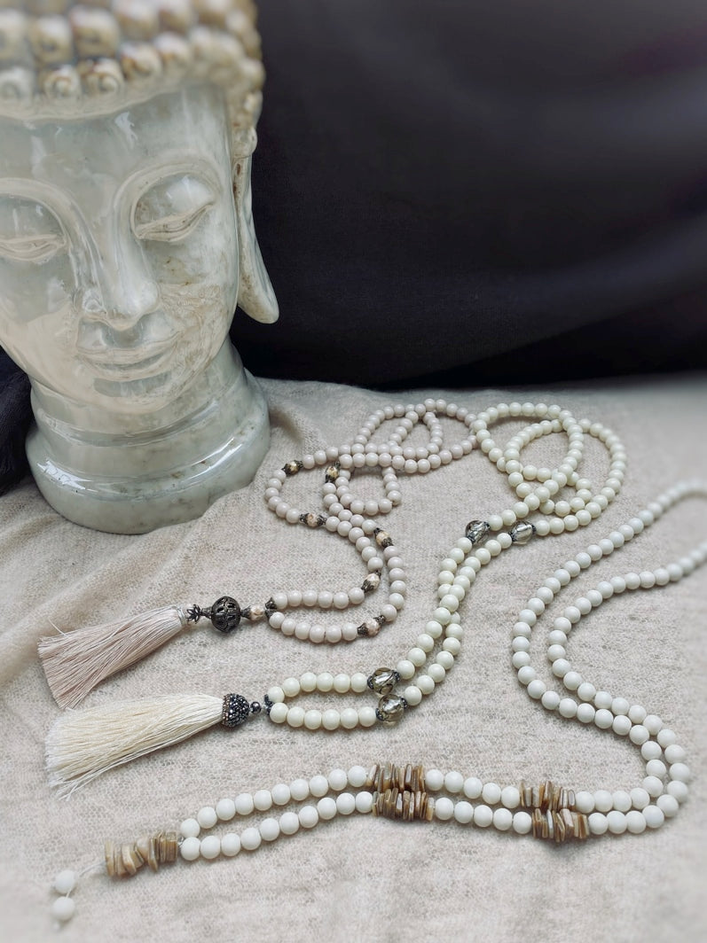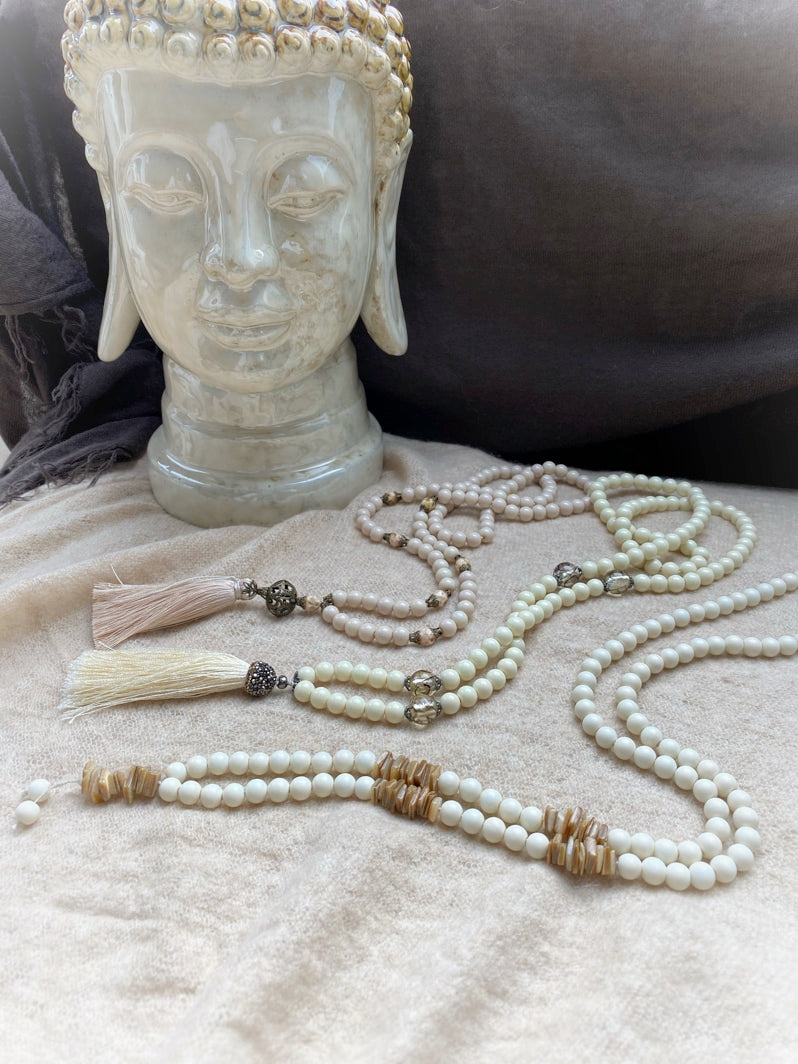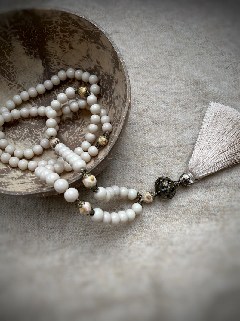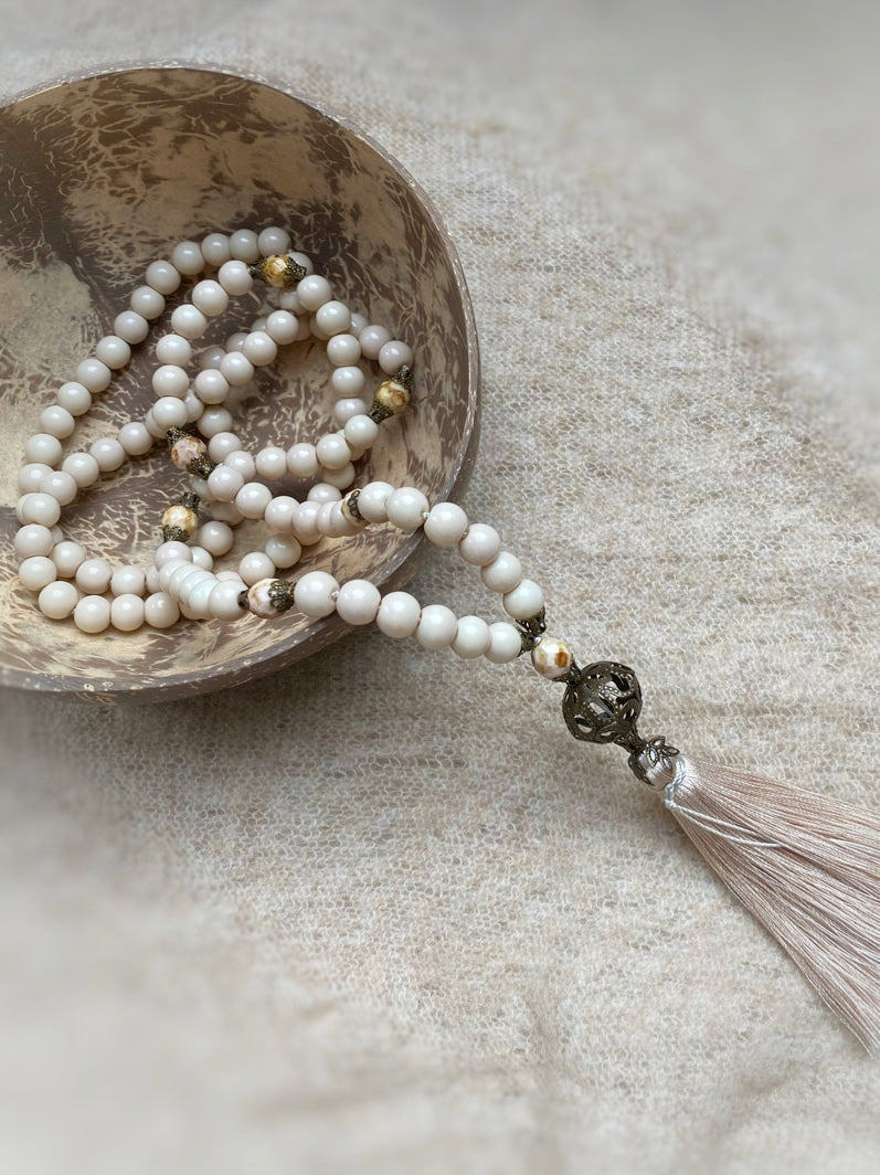 Abschluss: Filigrane bronzefarbene Großperle und beigefarbene Seidenquaste