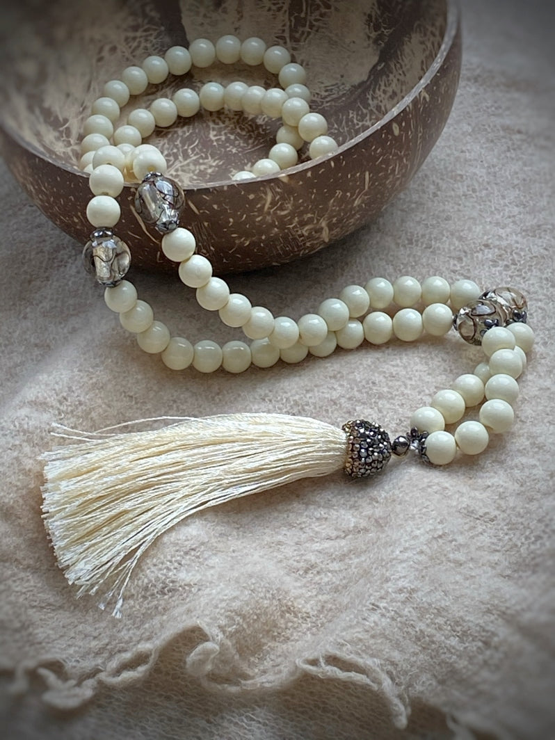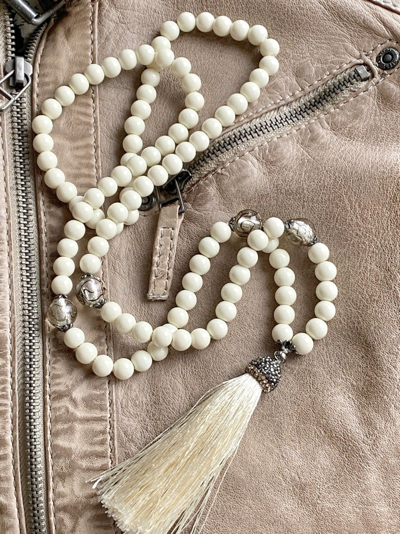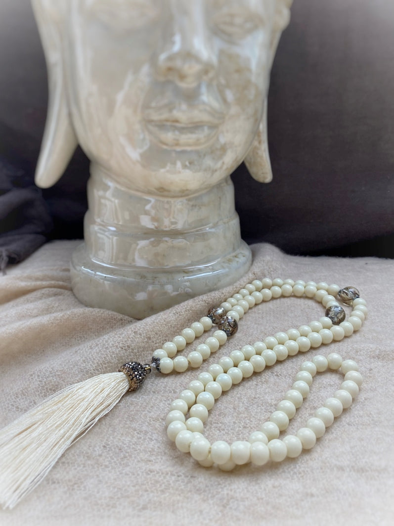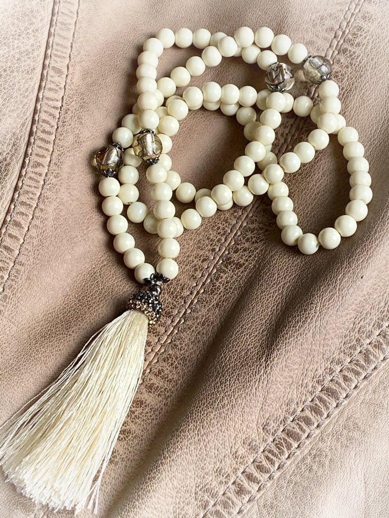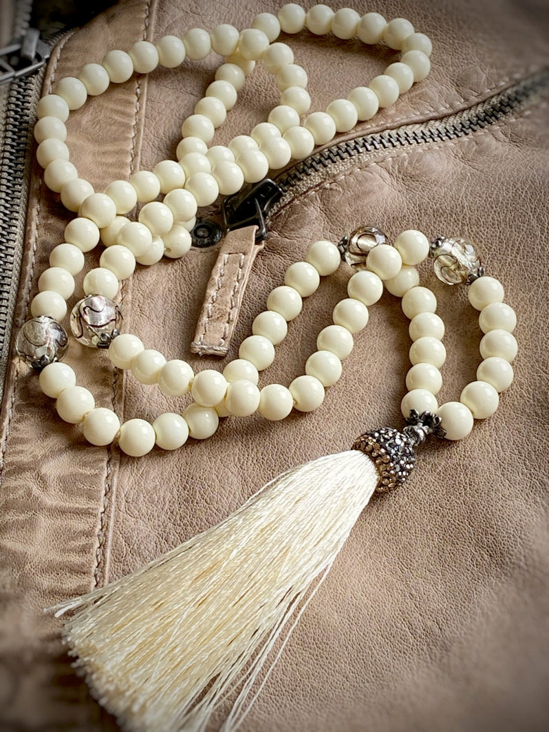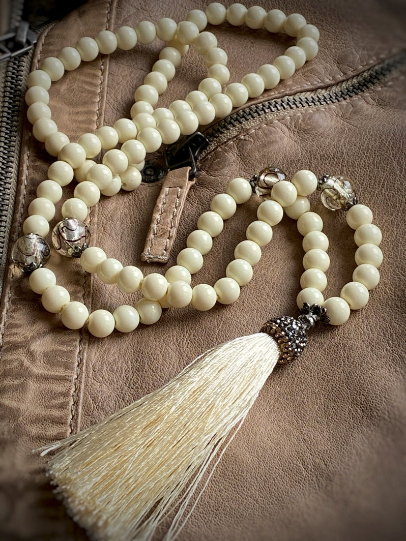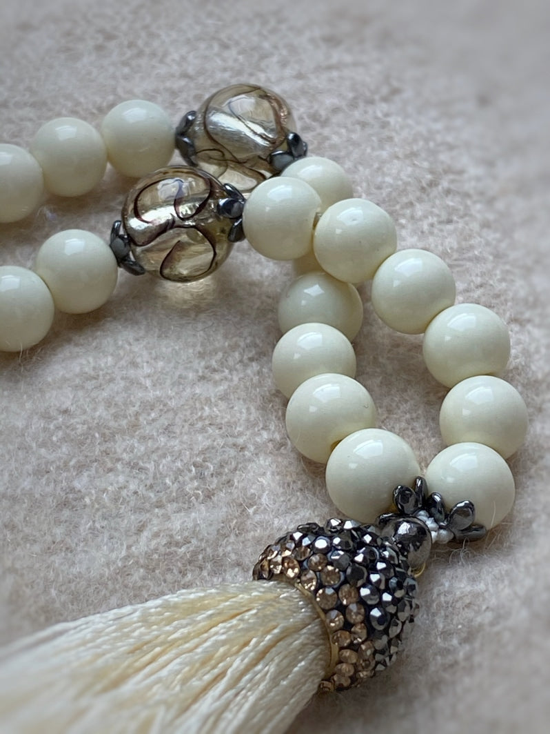 Abschluss: Eierschalenfarbene Quaste mit mit Strass besetzter Kappe