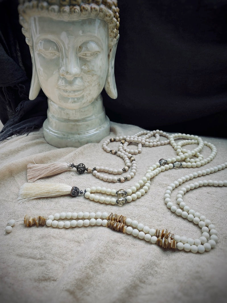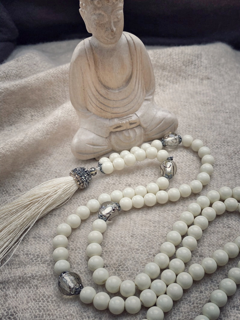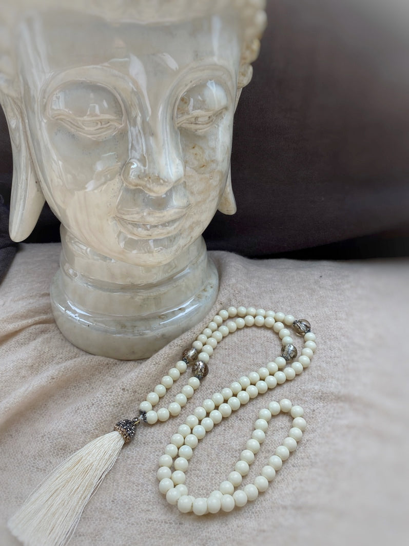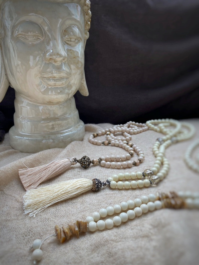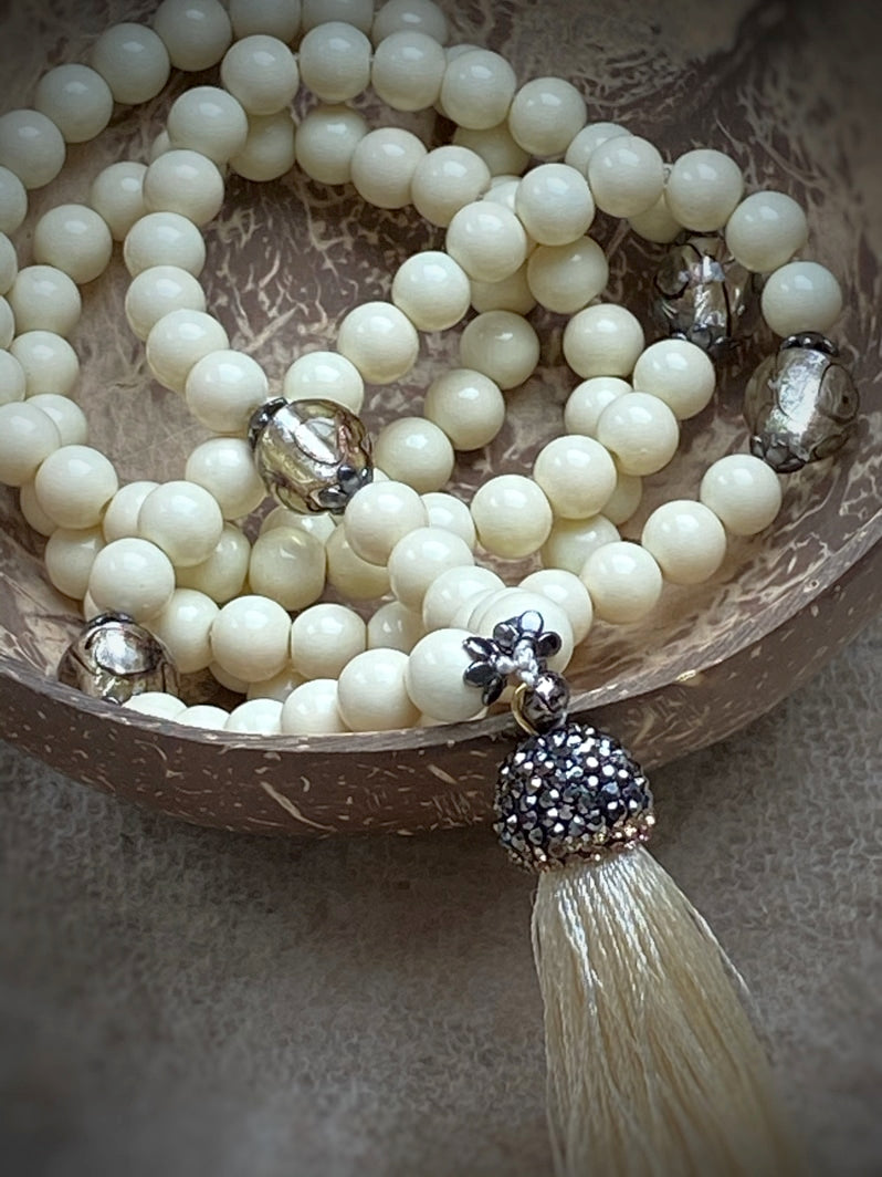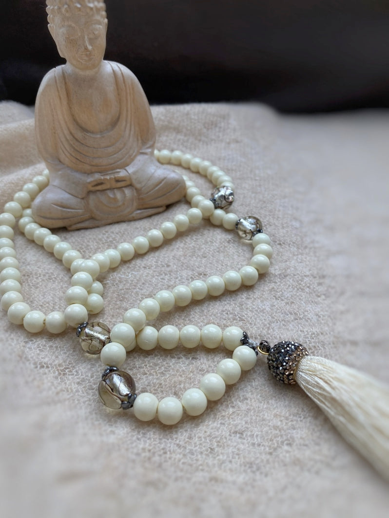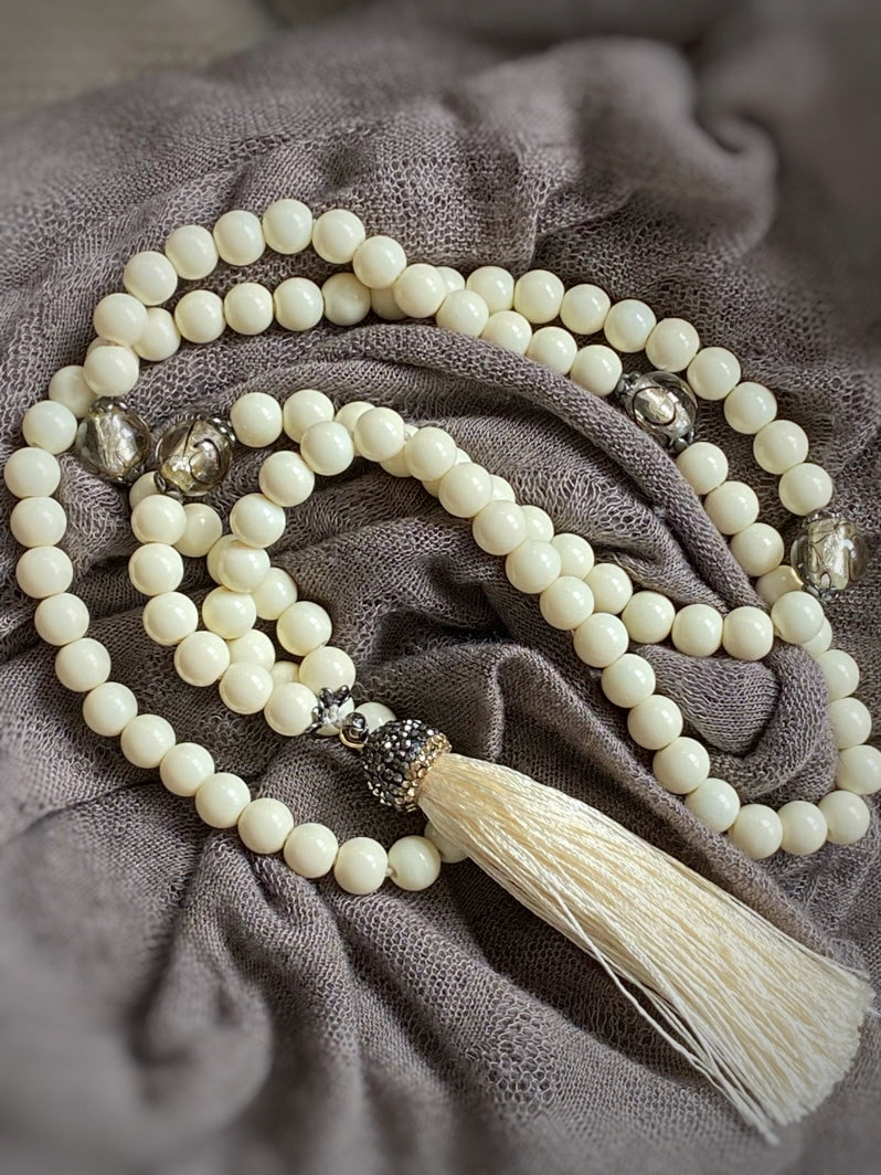 Abschluss: Eierschalenfarbene Quaste mit mit Strass besetzter Kappe