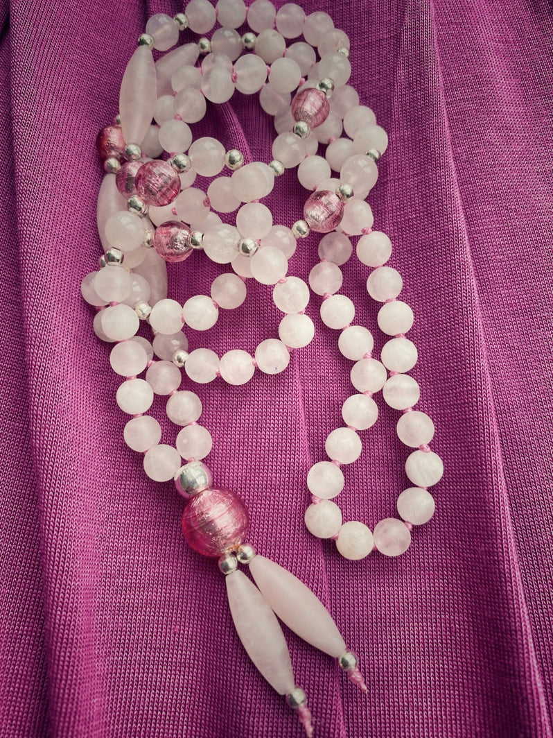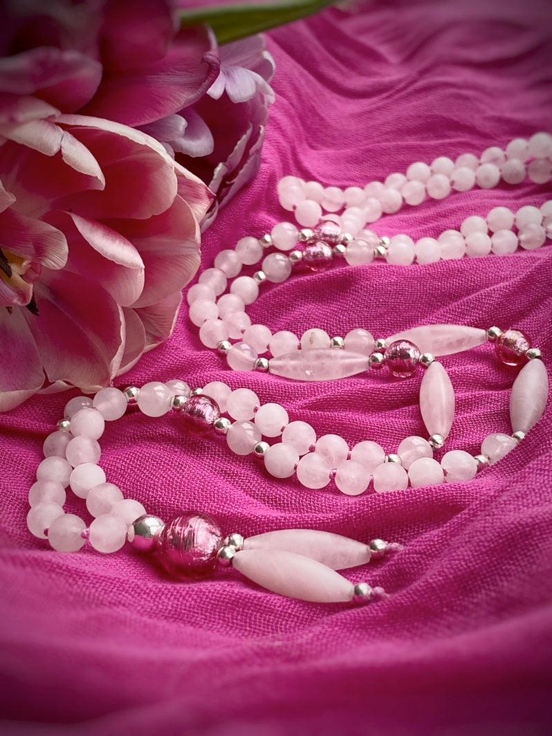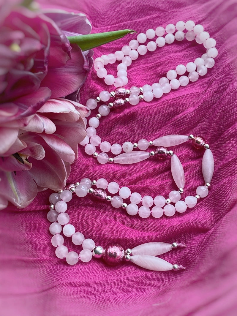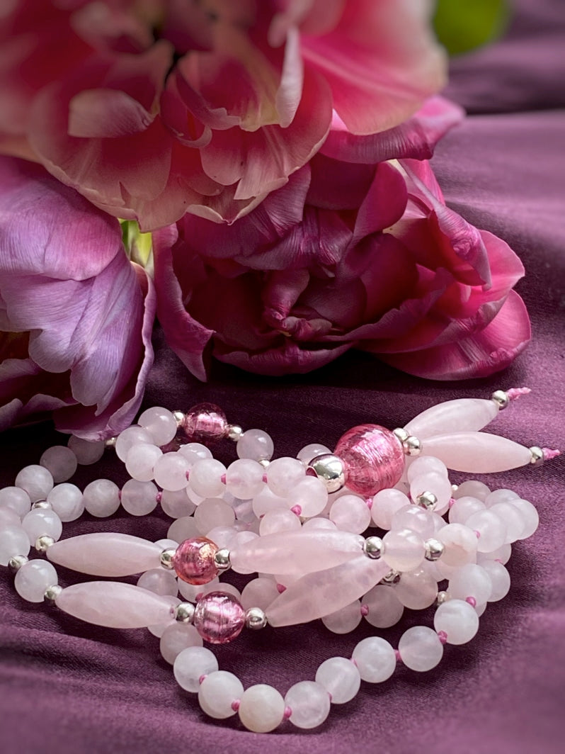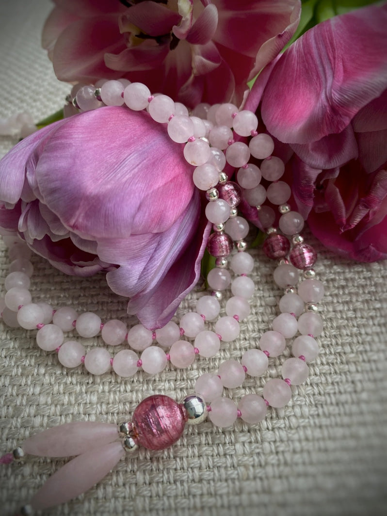 Abschluss: Rosafarbene Murano-Glasfolien-Perle 8mm, silberfarbene Spacer und matte Rosenquarz-Spindeln