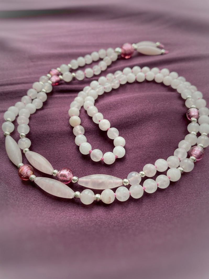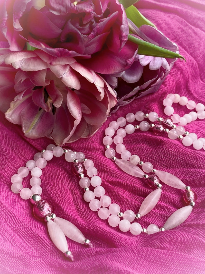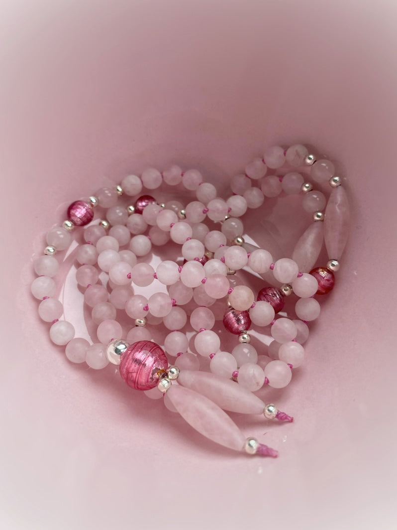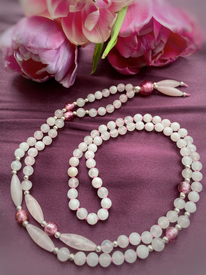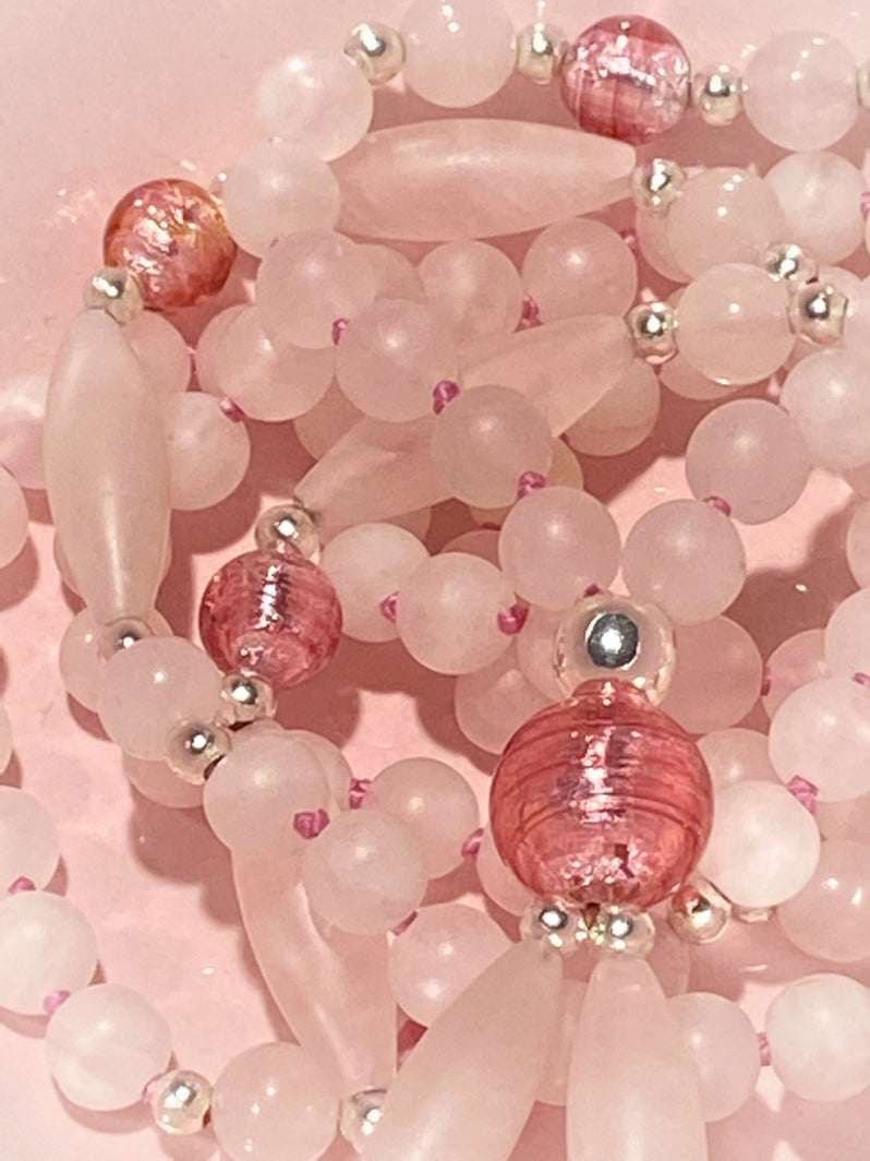 Abschluss: Rosafarbene Murano-Glasfolien-Perle 8mm, silberfarbene Spacer und matte Rosenquarz-Spindeln