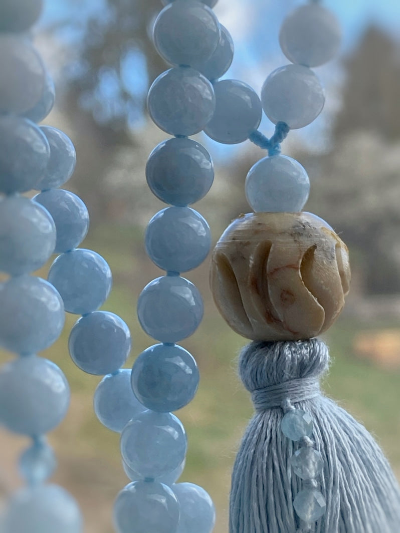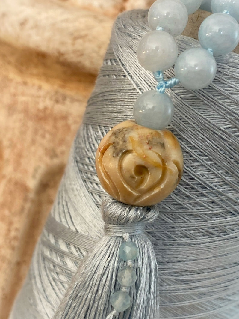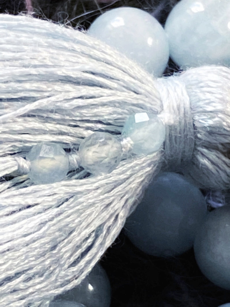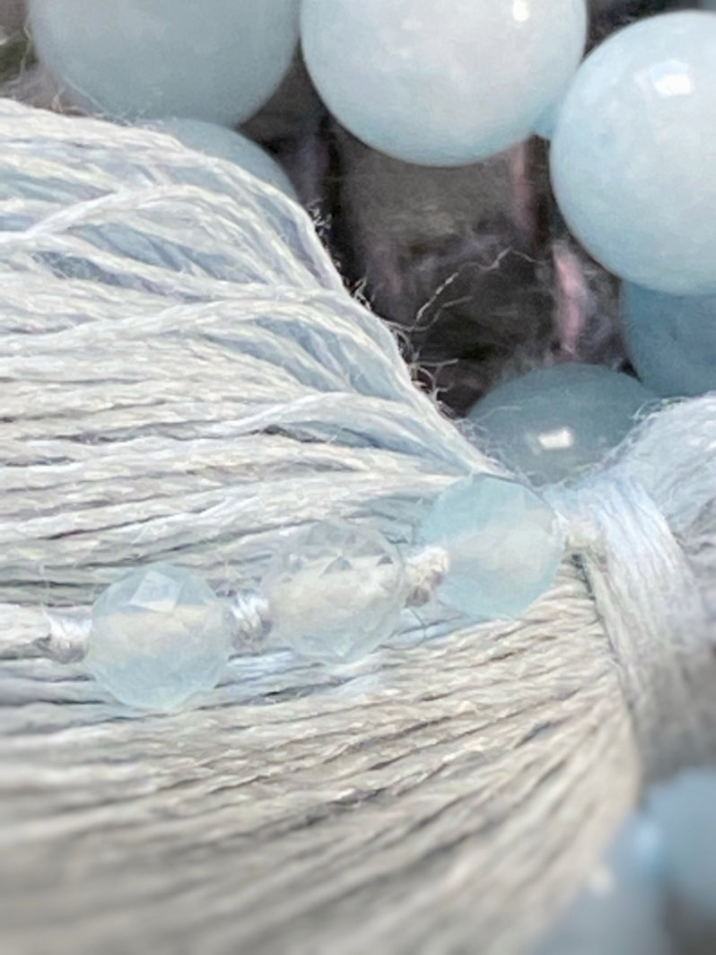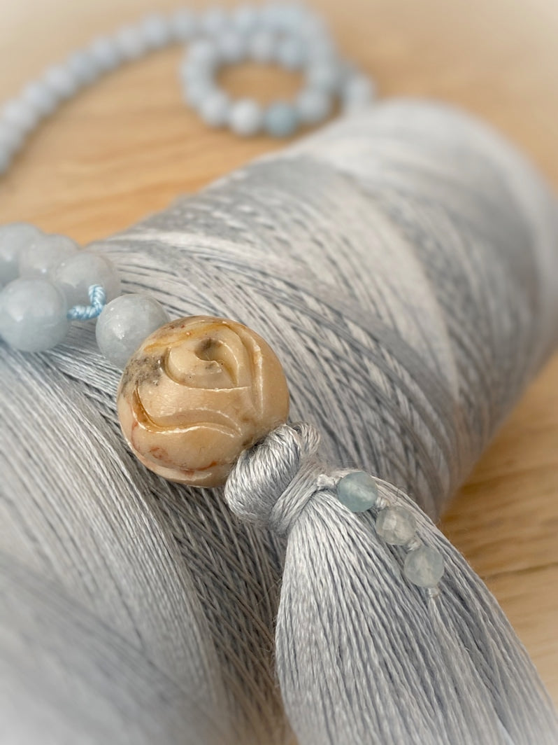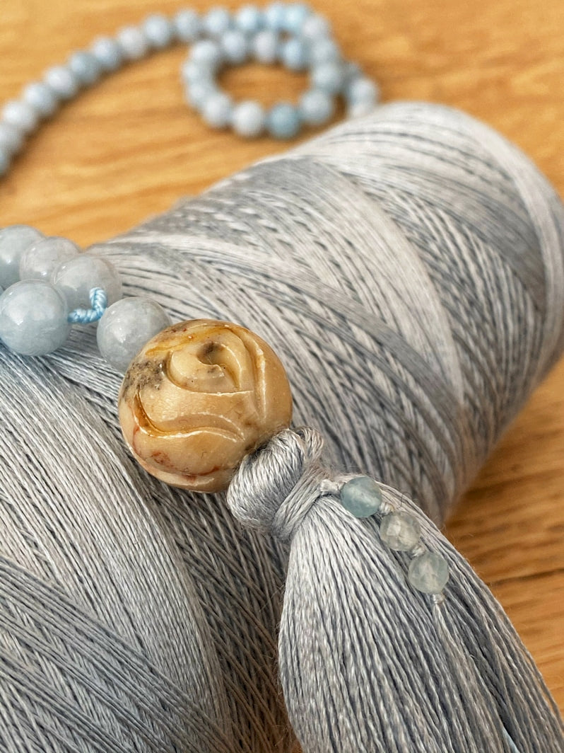 Abschluss: Handgeschnitzter Speckstein und hellblaue Quaste aus feinstem italienischem Seidengarn mit facettierten hellblauen Onyx-Perlchen
