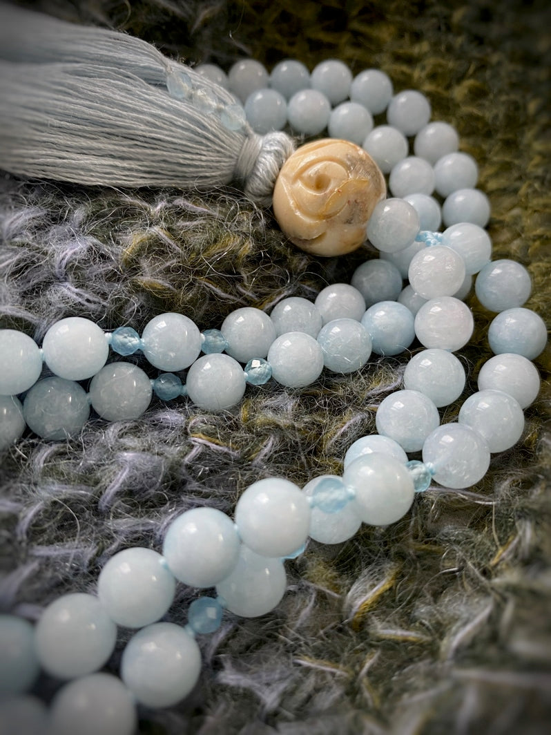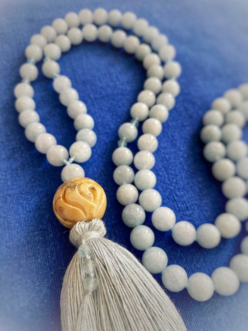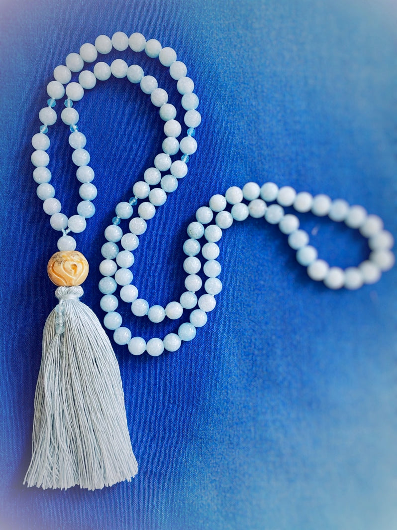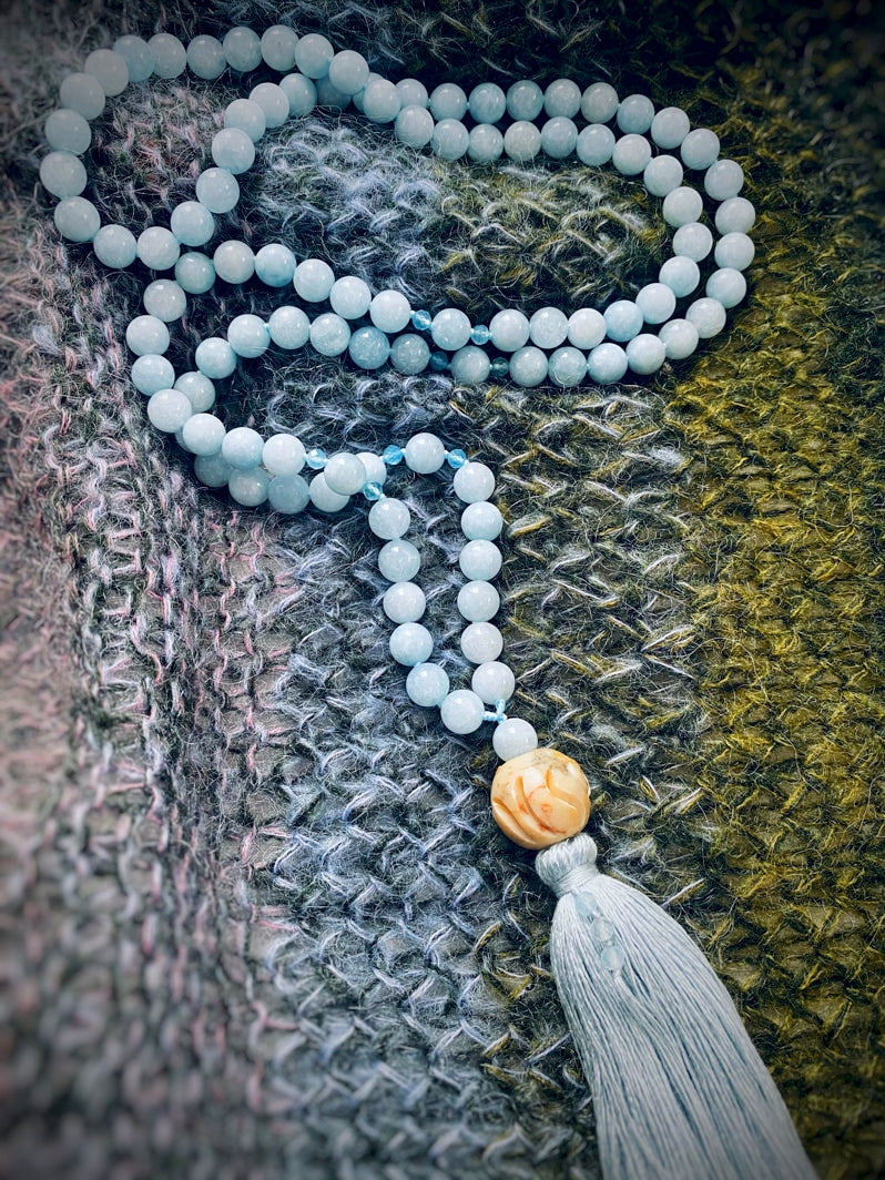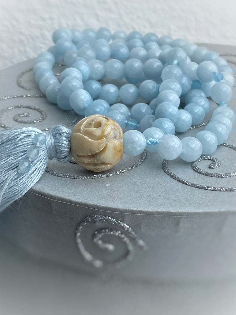 Abschluss: Handgeschnitzter Speckstein und hellblaue Quaste aus feinstem italienischem Seidengarn mit facettierten hellblauen Onyx-Perlchen