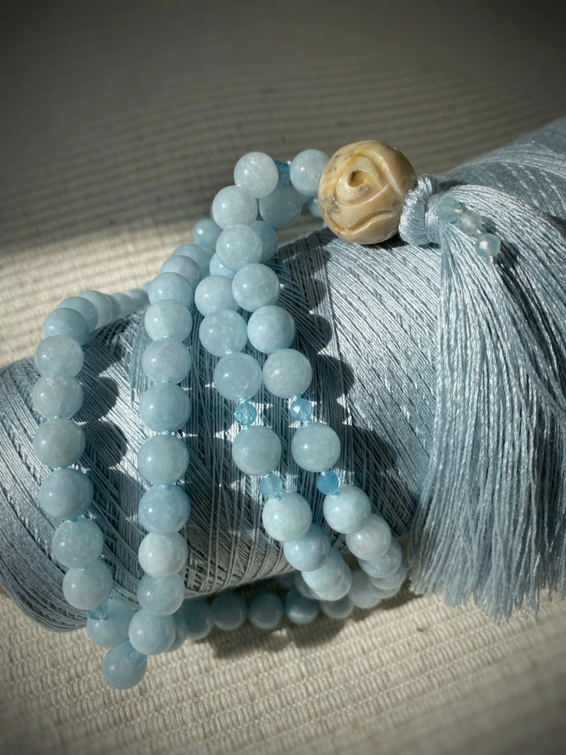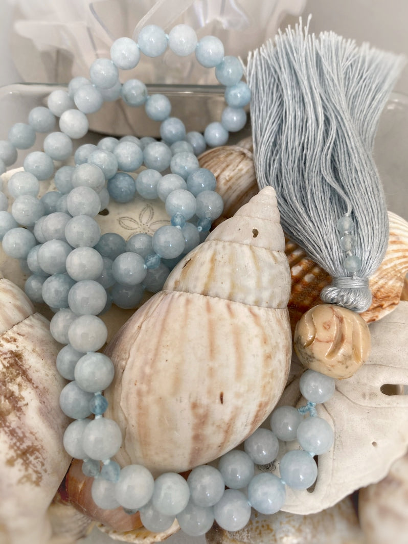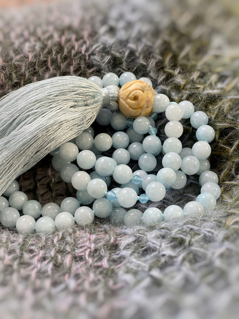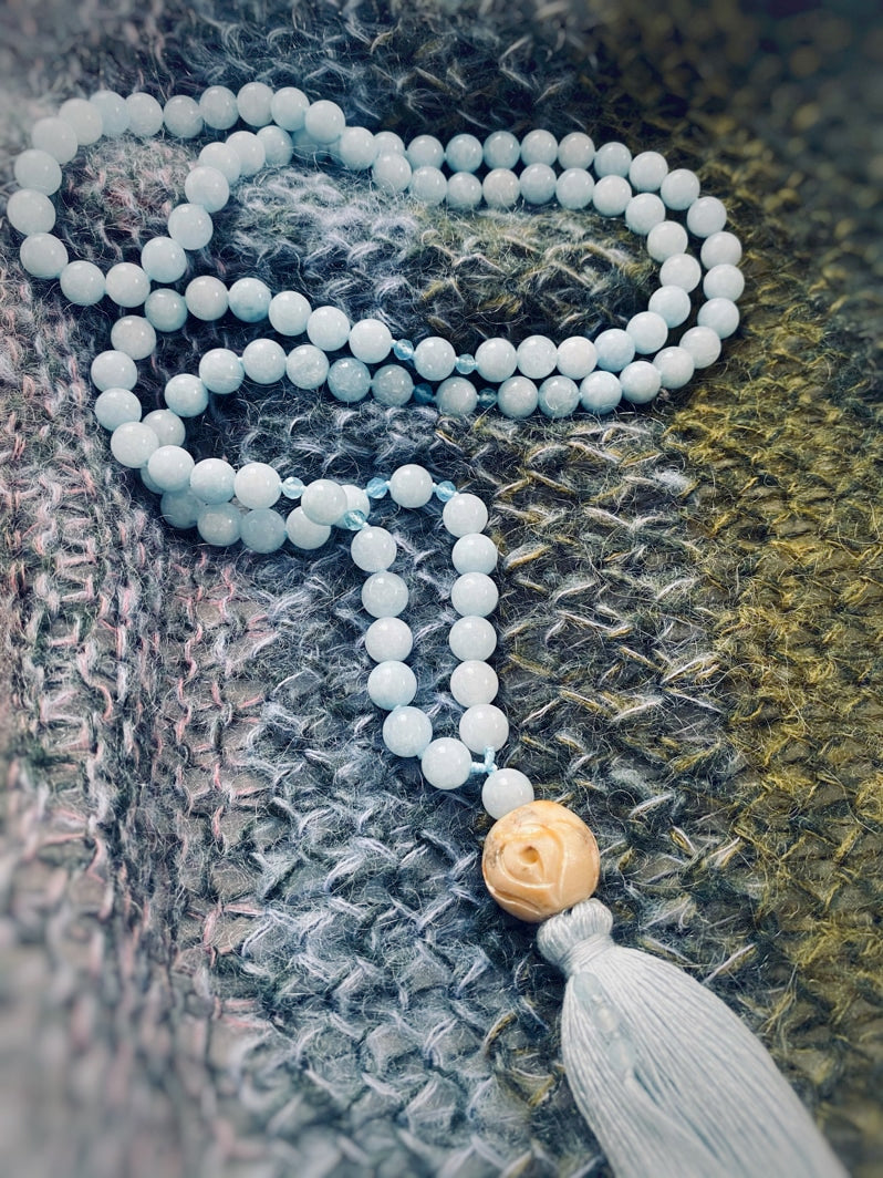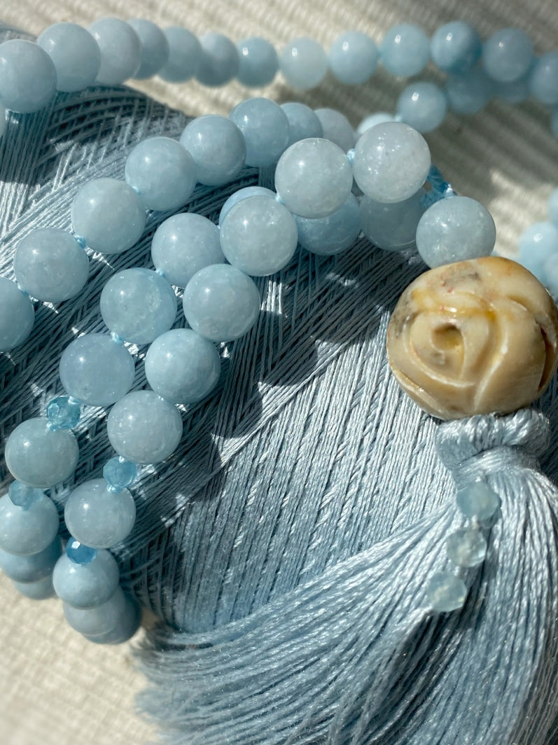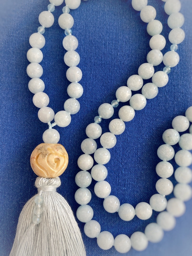 Abschluss: Handgeschnitzter Speckstein und hellblaue Quaste aus feinstem italienischem Seidengarn mit facettierten hellblauen Onyx-Perlchen