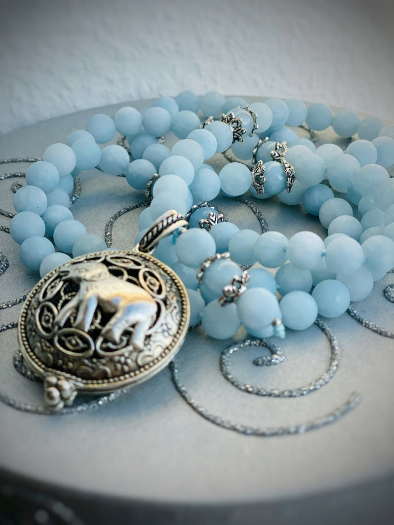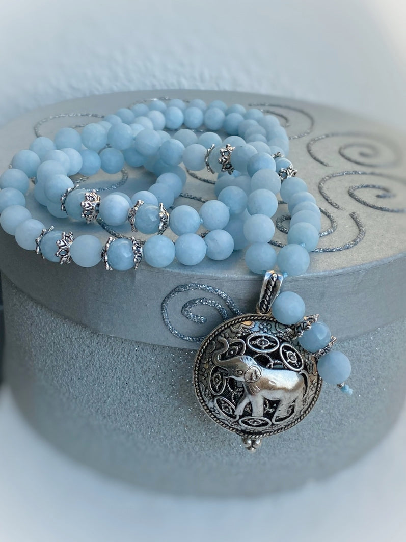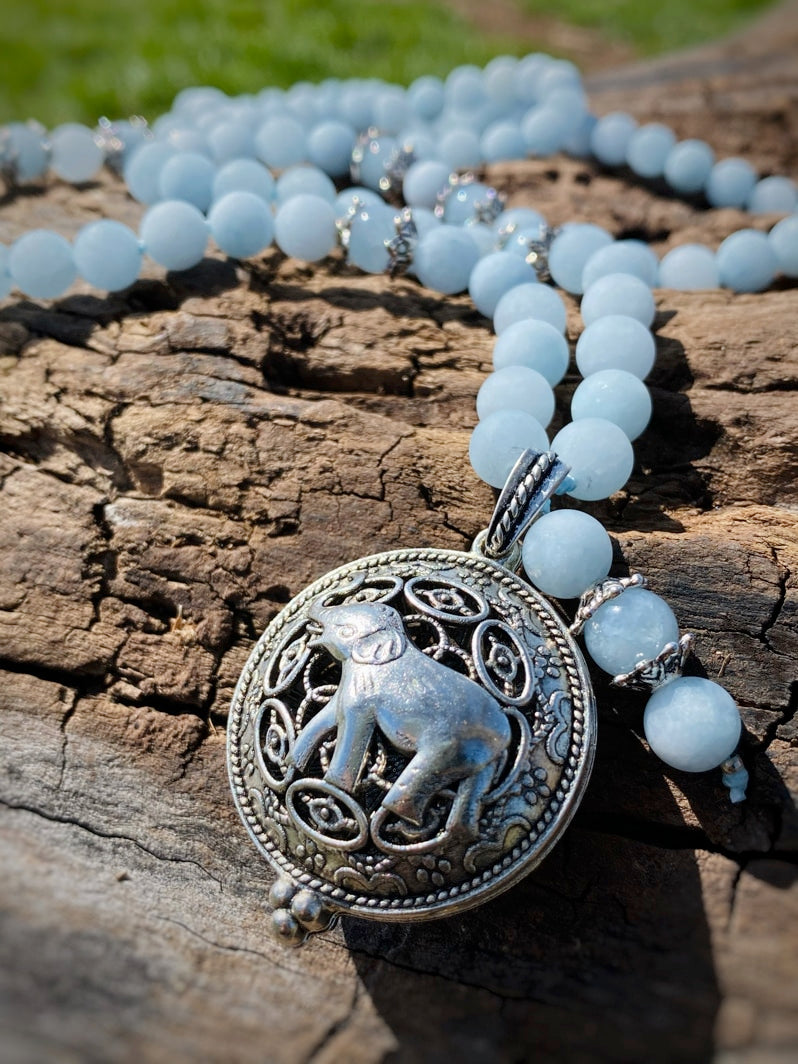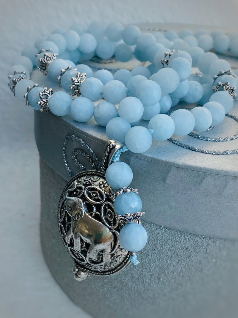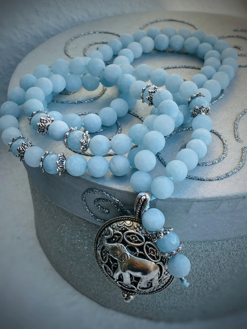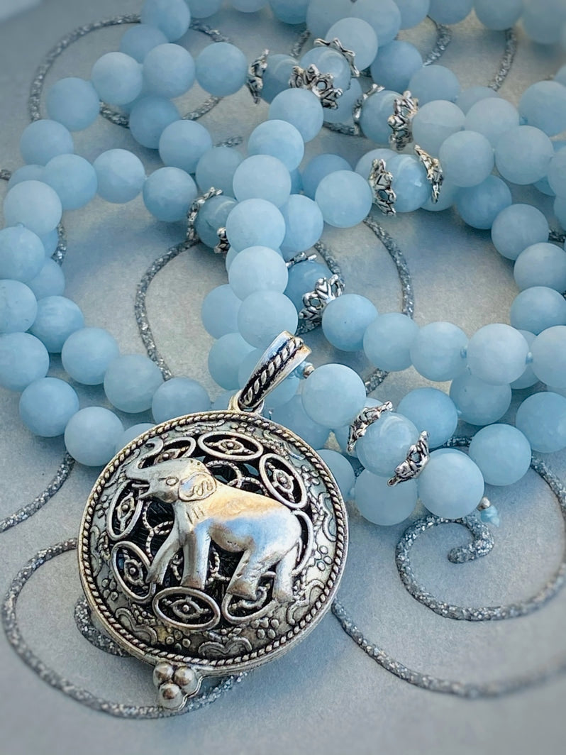 Abschluss: Ausgefallenes Hohl-Medaillon mit kunstvollem Elefanten, magnetischer Verschluss - kombiniert mit hellblauen Jadeperlen mit Perlkappen