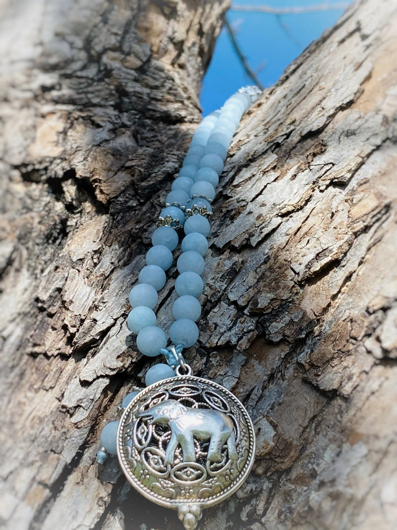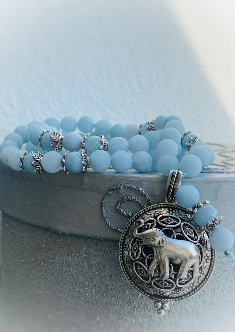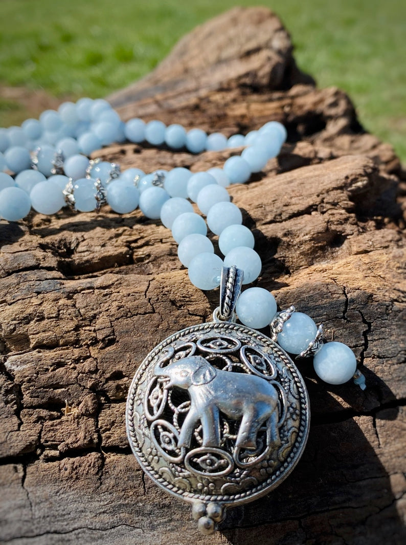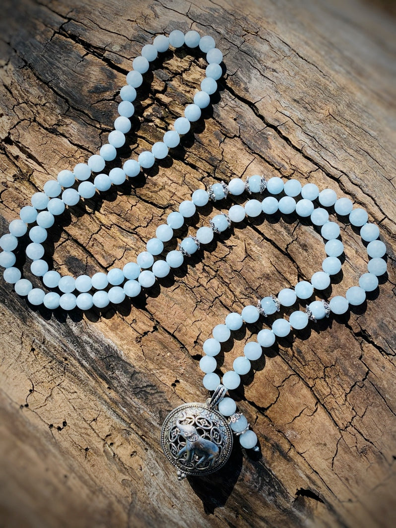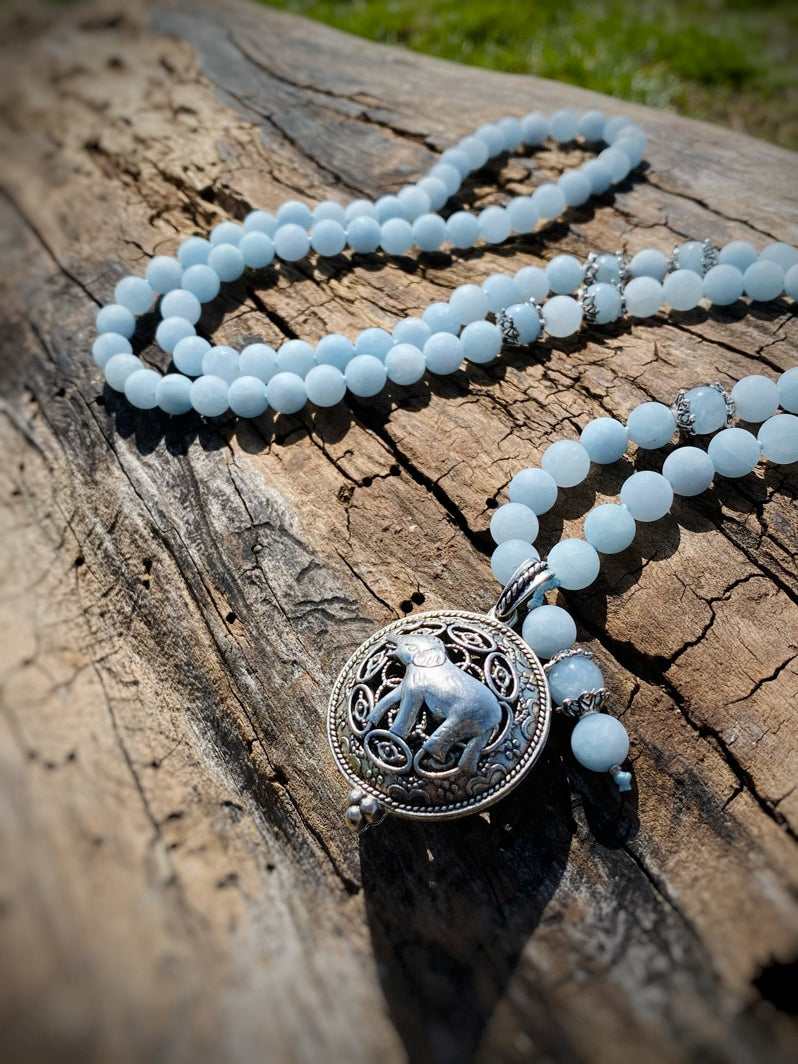Abschluss: Ausgefallenes Hohl-Medaillon mit kunstvollem Elefanten, magnetischer Verschluss - kombiniert mit hellblauen Jadeperlen mit Perlkappen