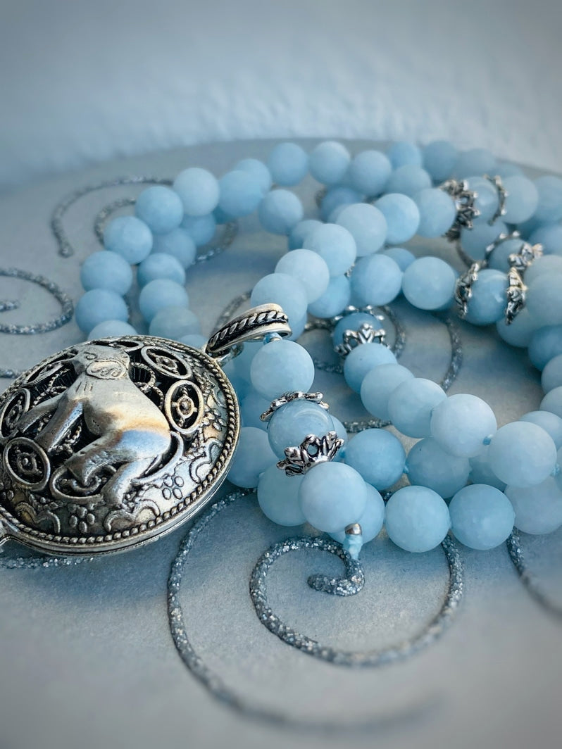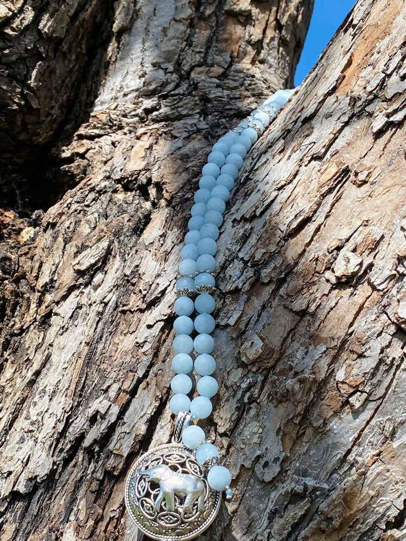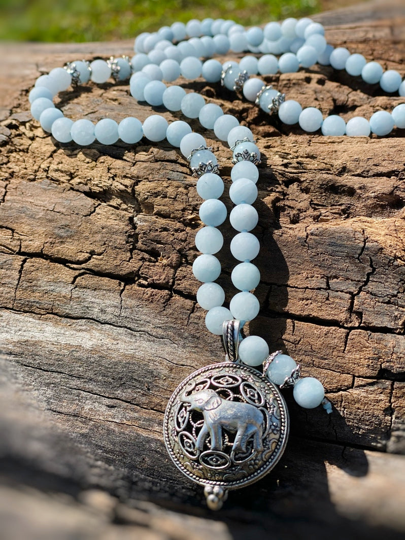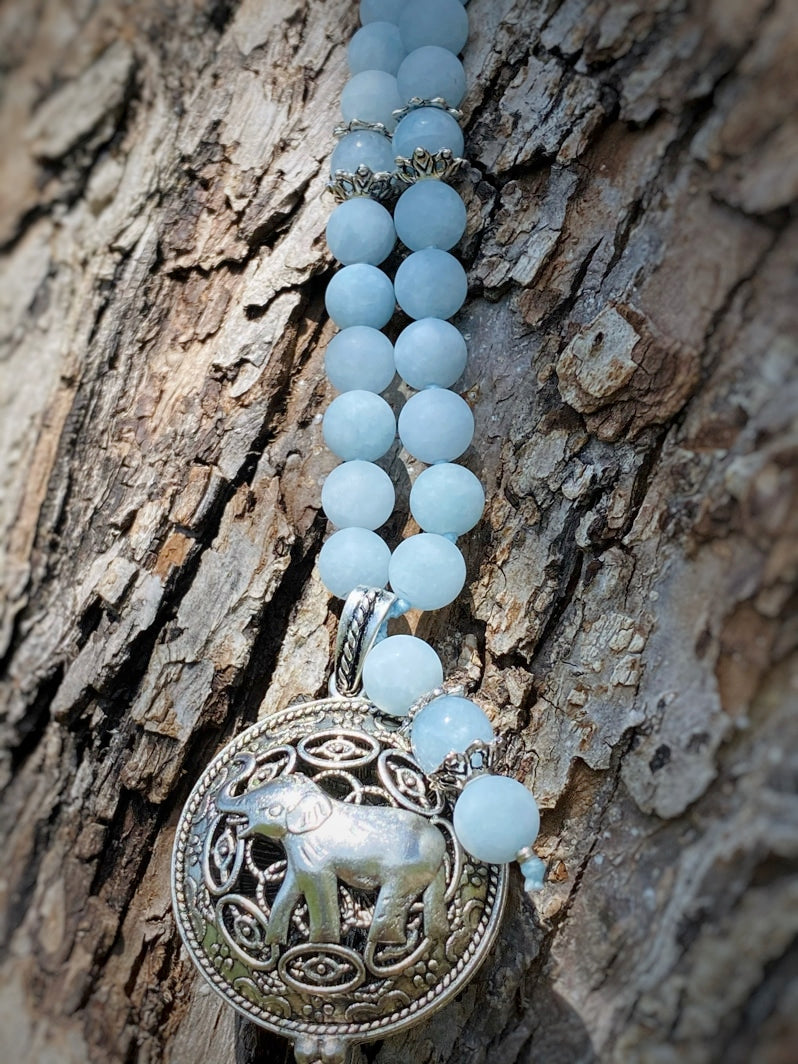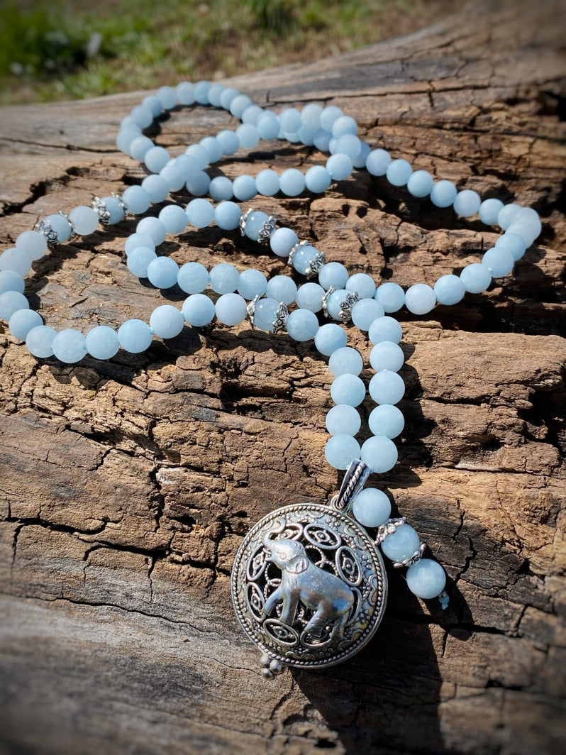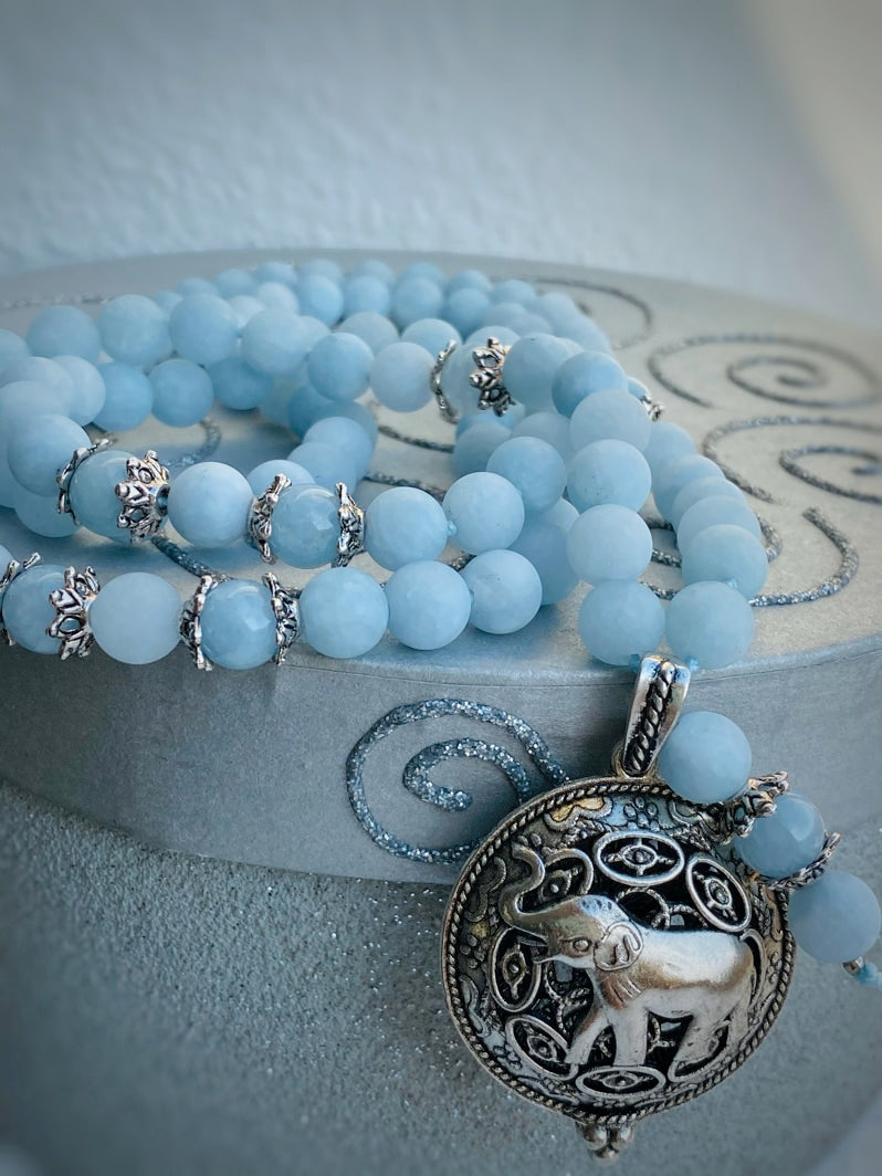 Abschluss: Ausgefallenes Hohl-Medaillon mit kunstvollem Elefanten, magnetischer Verschluss - kombiniert mit hellblauen Jadeperlen mit Perlkappen