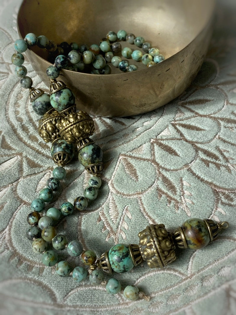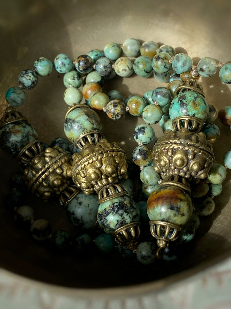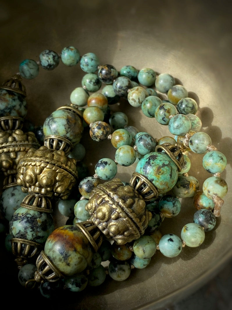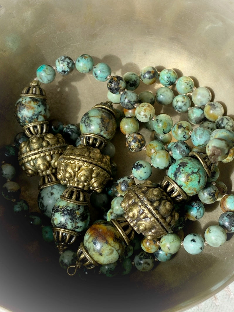 Marker und Abschluss: Afrikanische Türkis-Perlen 10mm mit Messing-Perlkappen und ornamentierter Messingperle 12mm