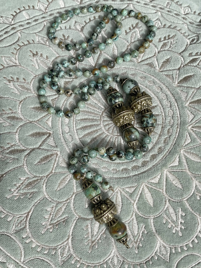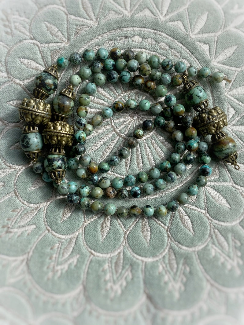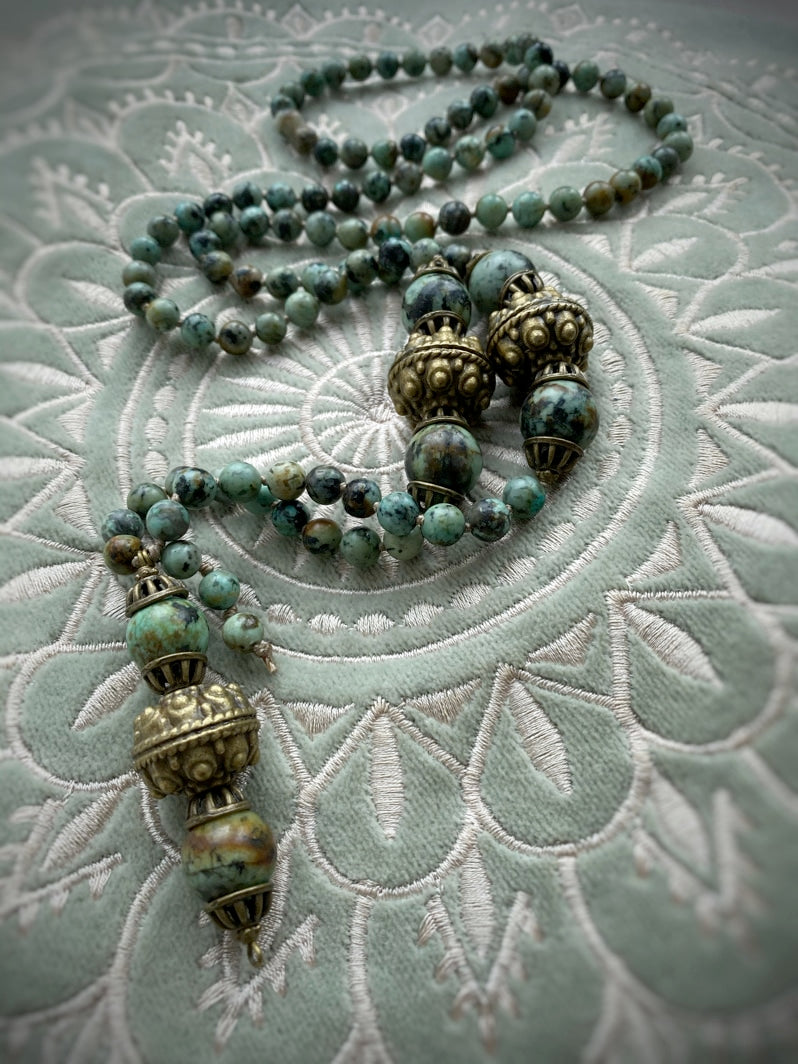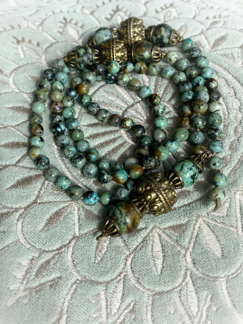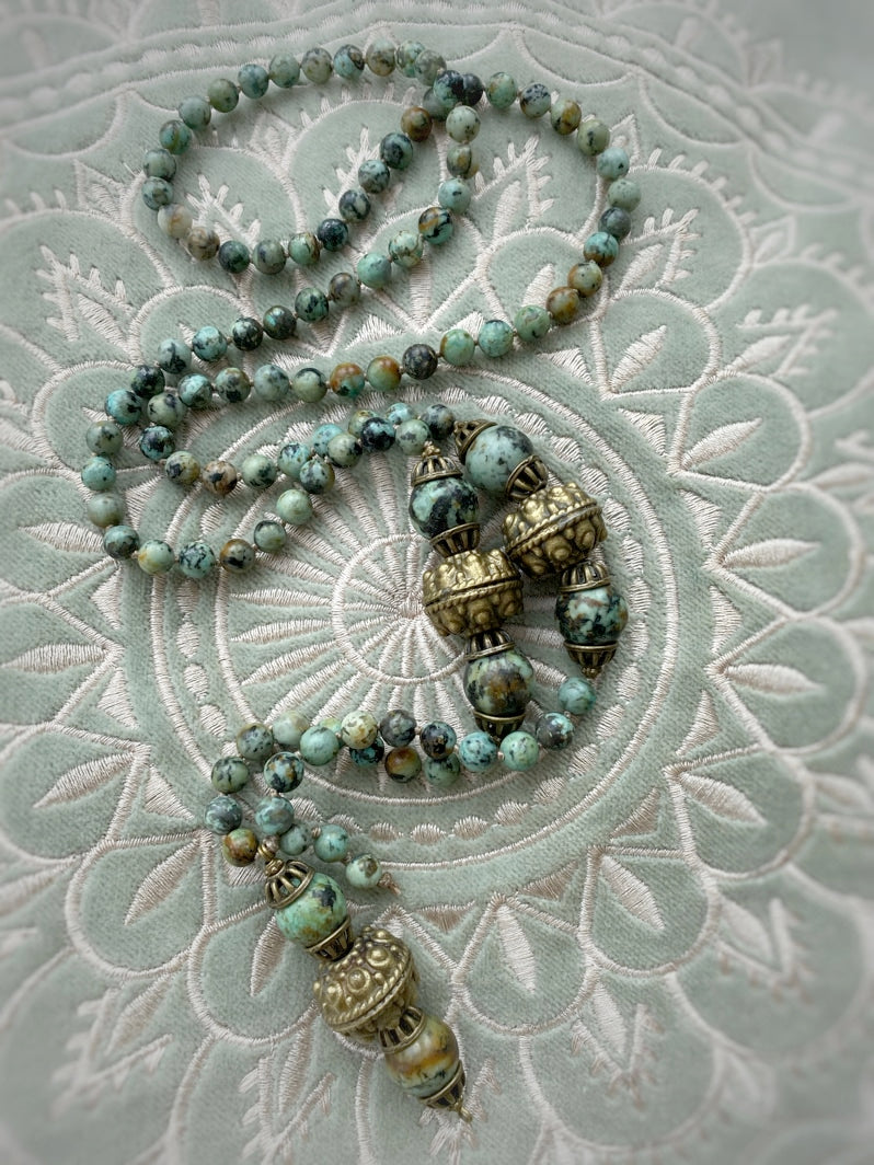 Marker und Abschluss: Afrikanische Türkis-Perlen 10mm mit Messing-Perlkappen und ornamentierter Messingperle 12mm