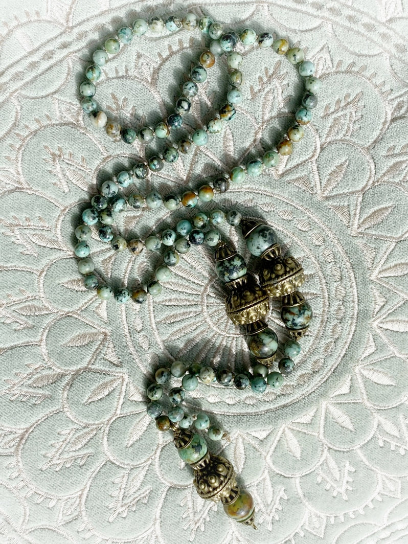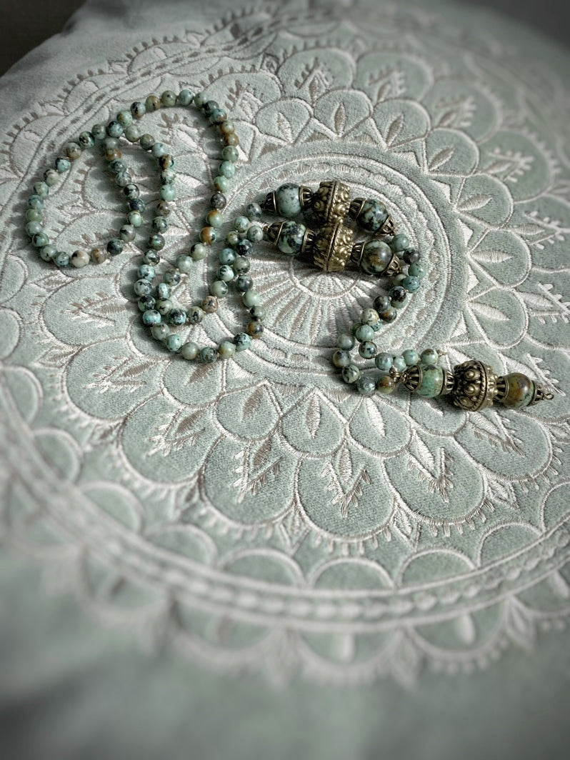 Afrikanischer Türkis ist eine Mischung aus Chrysokoll und grünem Jaspis. Beide Steine wirken auf das Herzchakra und können dabei helfen, stressige Situationen besser zu meistern und innere Harmonie zu bewahren. Er gilt als Schutzstein und soll Standhaftigkeit in schwierigen Situationen geben.