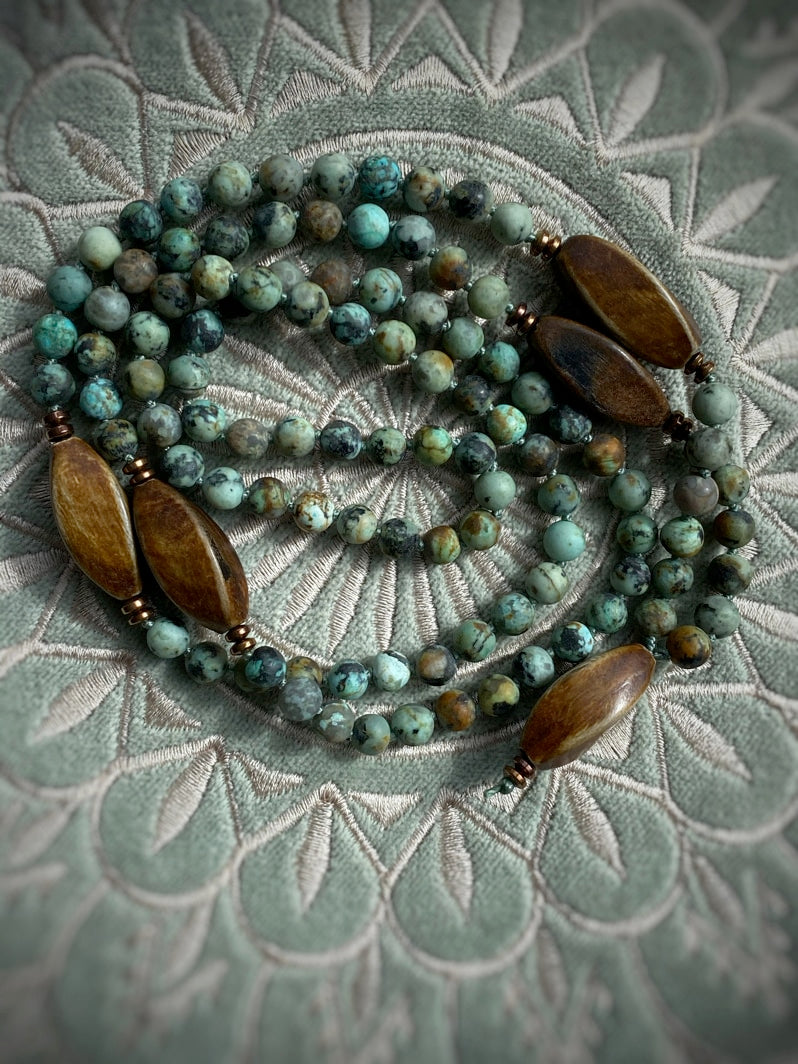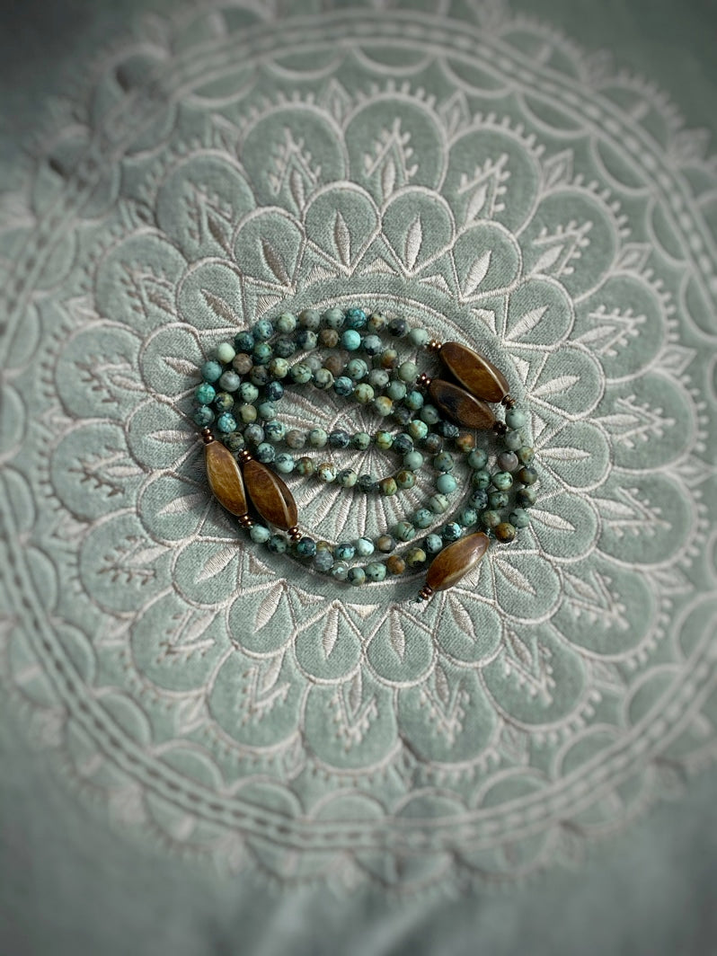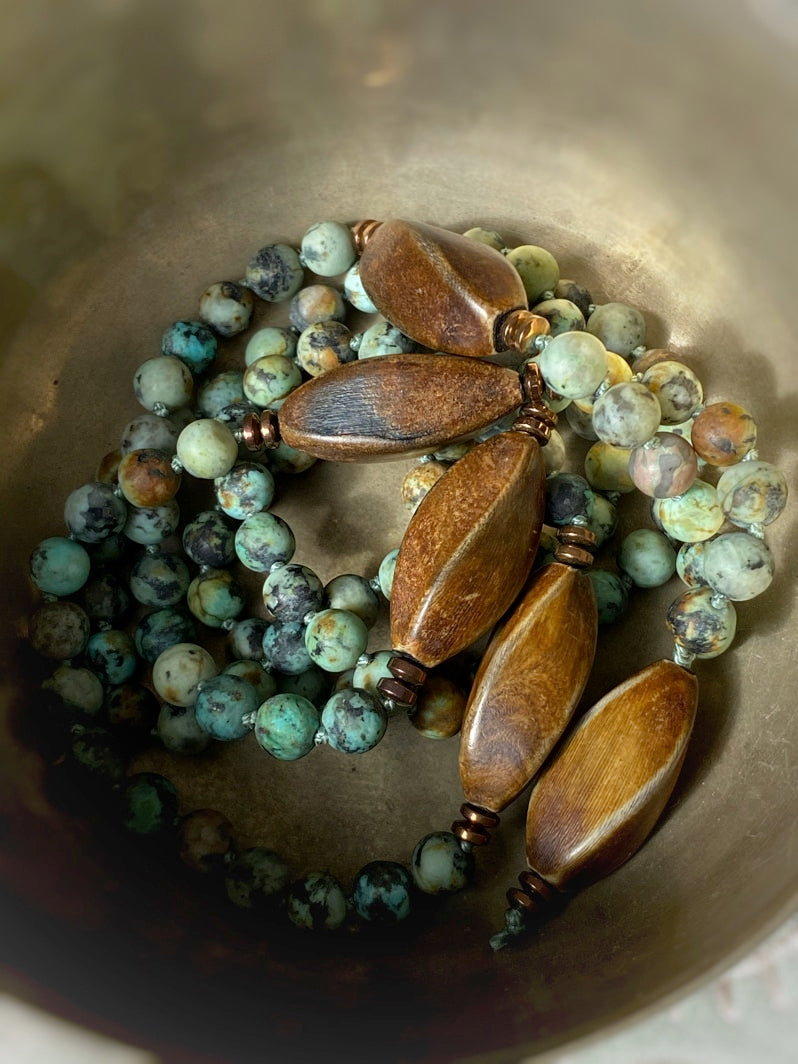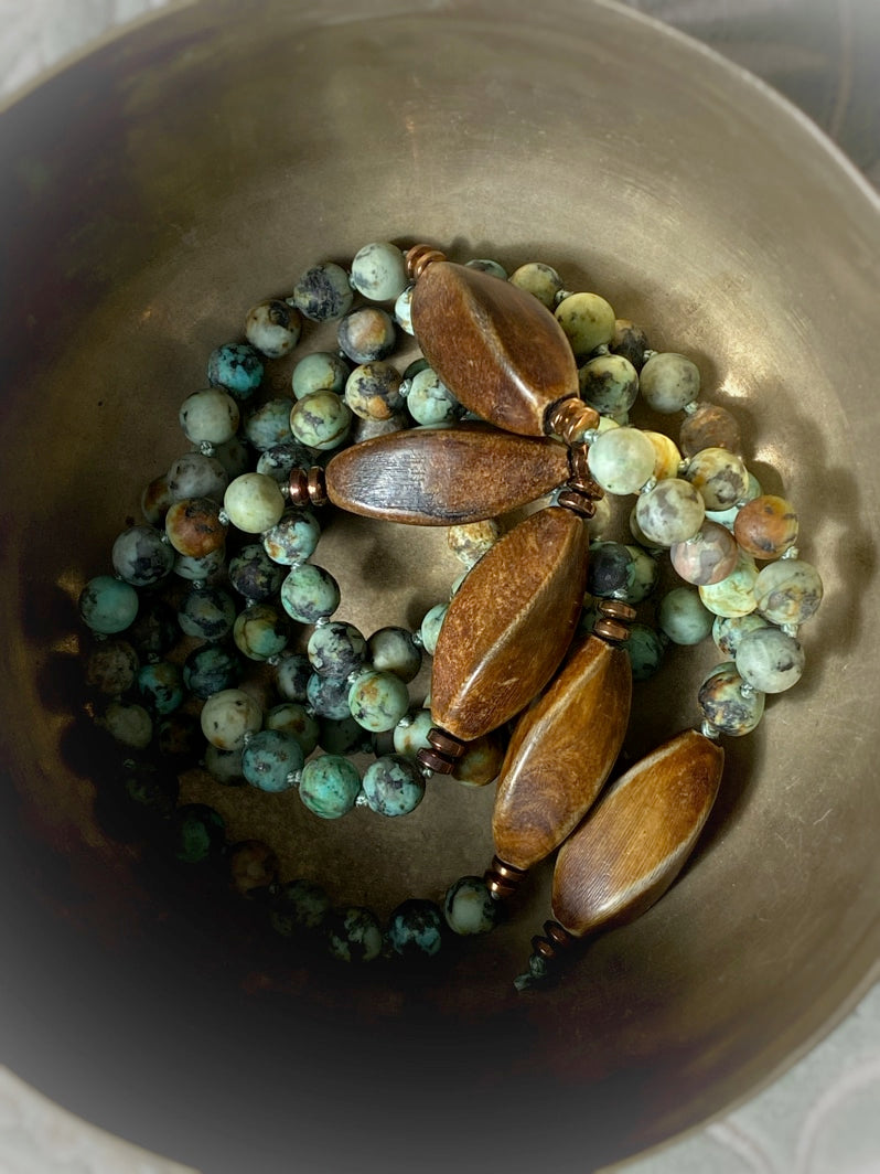 Afrikanischer Türkis ist eine Mischung aus Chrysokoll und grünem Jaspis. Beide Steine wirken auf das Herzchakra und können dabei helfen, stressige Situationen besser zu meistern und innere Harmonie zu bewahren. Er gilt als Schutzstein und soll Standhaftigkeit in schwierigen Situationen geben.